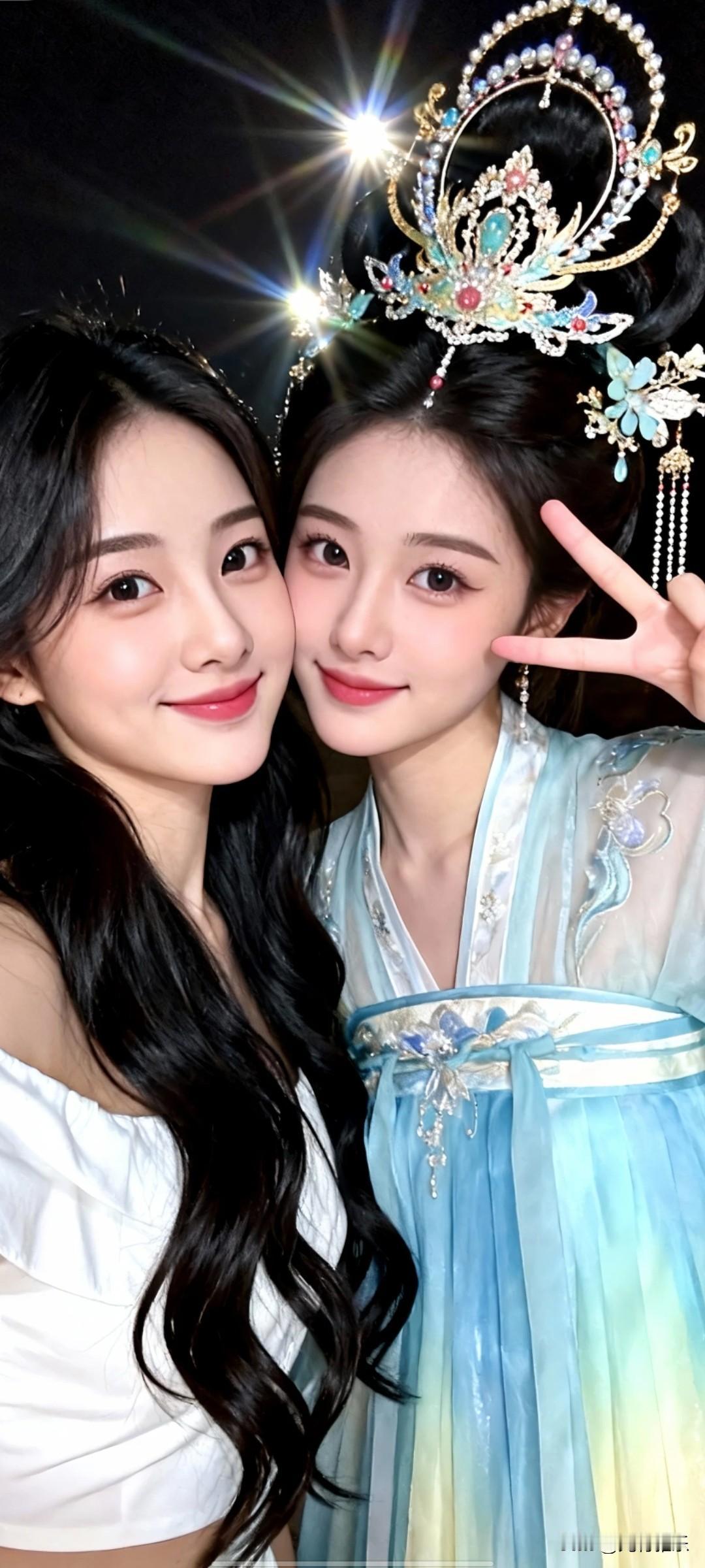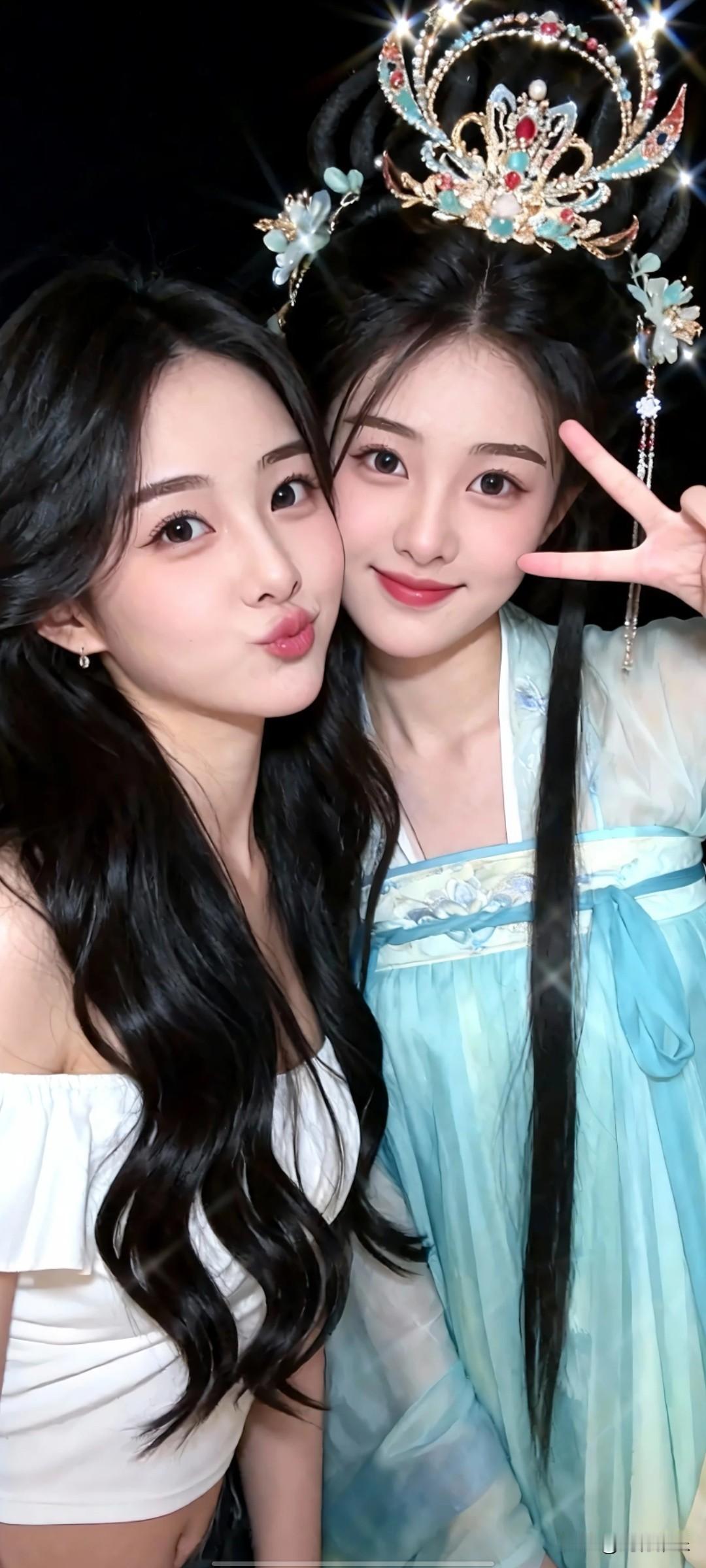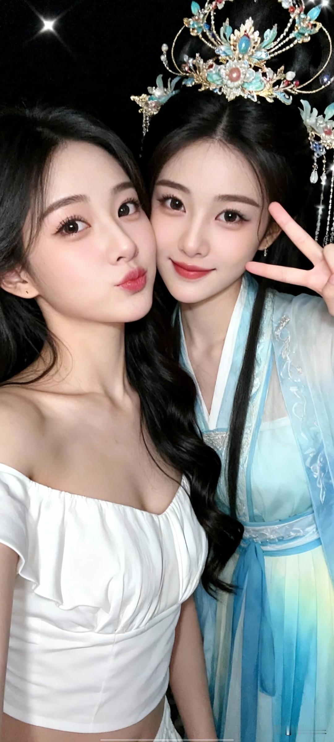 古风闺蜜照,甜美笑容,比心姿势,仙女装扮,梦幻背景