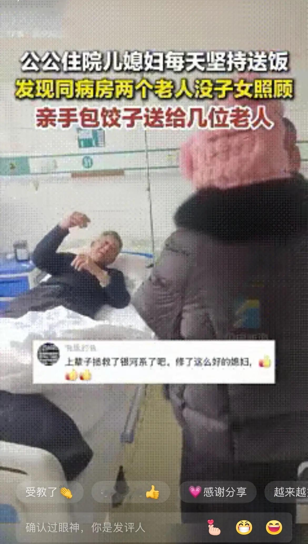 儿媳妇孝顺才算孝! 山东,公公生病住院,儿媳每天坚持送饭,得知同病房两位老人没子女照顾,亲手包饺子送给几位老人。 这个儿媳叫李娟,是小区门口超市的收银员,每天的生活像上了发条的钟,没半点闲空。 超市早上七点开门,李娟六点就得起床,先去菜市场挑新鲜的蔬菜和肉,回家快速做好早饭,给公婆端上桌,再急匆匆赶往超市上班。下午六点下班,她顾不上歇口气,又钻进厨房忙活公公的住院餐,炖鸡汤、煮小米粥、炒清淡的时蔬,每道菜都做得软烂入味,适合病人消化。打包好饭菜,她骑着电动车赶往医院,路上还要给公公打电话,问问身体有没有不舒服。 公公住院的病房里,还有两位老人,一位姓张,一位姓王,都是独居老人,生病后没人照顾,每天只能吃医院食堂的饭菜,有时候胃口不好,就随便扒两口。李娟第一次送饭时,看到张大爷对着食堂的青菜汤叹气,王大爷则坐在床边啃干粮,心里瞬间不是滋味。她想起自己的父母,年纪大了也需要人照顾,这些独居老人没人疼没人管,太可怜了。 第二天,李娟特意多做了一份饭菜,送到医院后,笑着递给张大爷:“大爷,我今天多做了点,您尝尝我的手艺。” 张大爷愣了愣,连忙摆手:“姑娘,不用不用,你是给你公公做的,我们怎么好意思吃。” 李娟把饭菜放在他床头柜上:“大爷,没事,我做得多,您放心吃,不够我下次再给您带。” 旁边的王大爷看着热气腾腾的饭菜,眼眶都红了:“姑娘,你真是个好心人,比亲闺女还亲。” 从那以后,李娟每天送饭都会多做两份,换着花样给三位老人准备饭菜。有一次,她听说张大爷爱吃饺子,特意起了个大早,剁馅、和面、包饺子,忙了两个多小时,包了三种口味的饺子,煮好后装在保温桶里送到医院。三位老人围在一起吃饺子,张大爷吃得热泪盈眶:“这饺子,比我小时候我妈包的还香。” 公公看着儿媳忙碌的身影,骄傲地对病友说:“这是我儿媳妇,比亲闺女还孝顺。” 超市的同事知道李娟的事后,都佩服地说:“李娟,你每天上班都够累了,还得照顾公公和两位陌生老人,真是不容易。” 李娟笑着说:“累点没事,能让老人们吃口热乎饭,我心里踏实。” 其实,她的辛苦只有自己知道。有时候超市忙到晚上八点才下班,她饿着肚子回家做饭,送到医院时已经快十点,自己却没时间好好吃顿饭。公婆心疼她,让她别管其他老人了,专心照顾公公就行,可李娟说:“都是老人,看着他们没人照顾,我实在不忍心。” 李娟的善举很快在医院传开了,护士们都对她赞不绝口,病友们也纷纷向她学习,有的家属会多带一份水果分给独居老人,有的会帮老人打打水、跑跑腿。张大爷的远房侄子听说后,特意从外地赶回来,握着李娟的手说:“姑娘,谢谢你这些天照顾我大伯,你真是个好人,我们都该向你学习。” 李娟摆摆手:“不用谢,举手之劳而已,大家互相帮衬着,日子就好过了。” 有人说李娟傻,自己都这么忙了,还管别人家的老人,可李娟不这么认为。她觉得,孝顺不是只对自己的亲人好,而是对所有老人都要有一份爱心和尊重。现在很多年轻人忙着工作,没时间照顾父母,独居老人越来越多,他们需要的不仅仅是物质上的满足,更需要精神上的陪伴和关怀。她做的这些小事,虽然微不足道,却能给老人们带来温暖和慰藉。 李娟的公公康复出院那天,张大爷和王大爷特意送他到医院门口,依依不舍地说:“姑娘,以后我们还能吃到你做的饭吗?” 李娟笑着说:“大爷,当然能,等我有空了,就给你们送过去。” 回家的路上,公公对李娟说:“孩子,你真是我们家的福气,有你这样的儿媳妇,是我这辈子最大的幸运。” 李娟挽着公公的胳膊:“爸,您别这么说,孝顺您是我应该做的,照顾其他老人也是我心甘情愿的。” 孝顺从来都不是一句口号,而是体现在点点滴滴的行动中。李娟用自己的实际行动,诠释了什么是真正的孝顺,什么是真正的善良。她不仅孝顺自己的公公,还把爱心延伸到陌生的独居老人身上,用小小的善举温暖着身边的人。在这个快节奏的社会里,很多人都变得自私自利,只关心自己的生活,而李娟的行为,像一股清流,洗涤着人们的心灵,提醒着我们,善良和孝顺是中华民族的传统美德,需要我们代代传承。 各位读者你们怎么看?欢迎在评论区讨论。