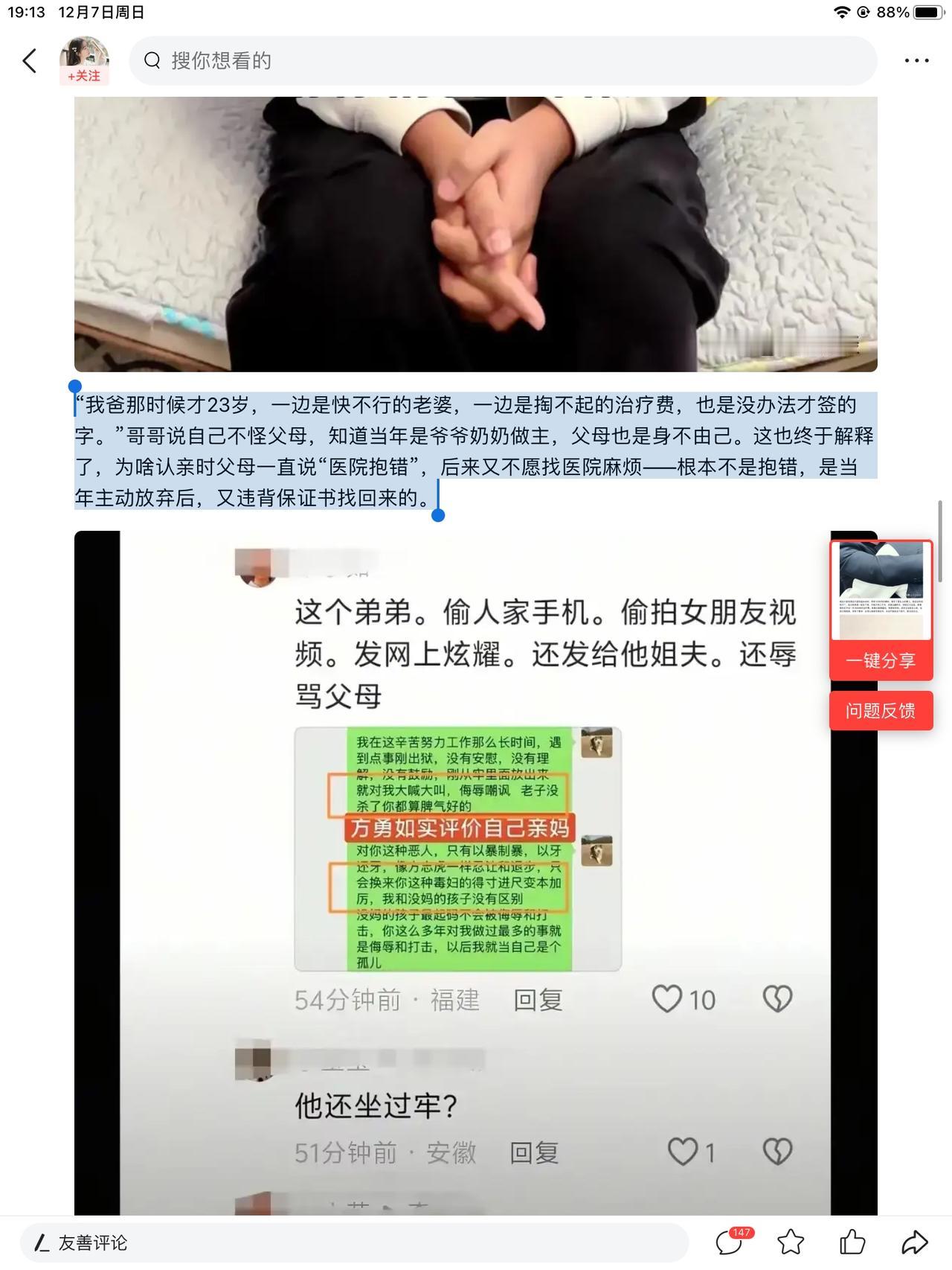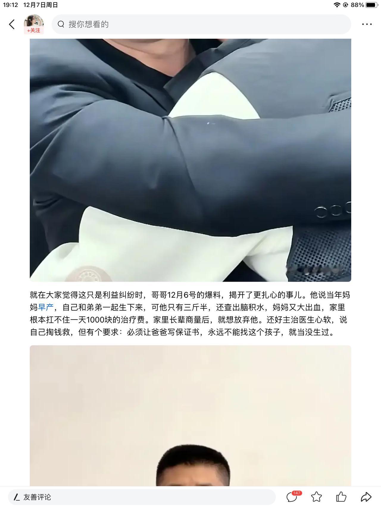 这对双胞胎,别带货,瓜太多了。给自媒体递饭!吃的是真噎挺!原来这家的母亲,在医院生孩子,是对双胞胎,生下来,哥哥身体不好,不想要了,想遗弃!因为有积水等病症。有个医生不舍得,想给他治,并收养。括号自己养还是送人不知道。也可能就是这个养家,没儿子。这不,天降大胖小子! 遗弃是大部分人同意了的,奶奶同意,爸爸签字,签什么字,就是这辈子不寻找大儿子。 这事儿,就过了这么多年。 具体,到近日,谁要找的,怎么找到的,我也没看明白。反正是找到了!小儿子就各种作妖。 反正是不舍得房子。也不让买房子。 真是累,哥哥人家也没想着要你多少多。就是想看看爹妈罢了。越往后看,感觉爹妈也没必要看了!很糟心!到这吧,又累又气!