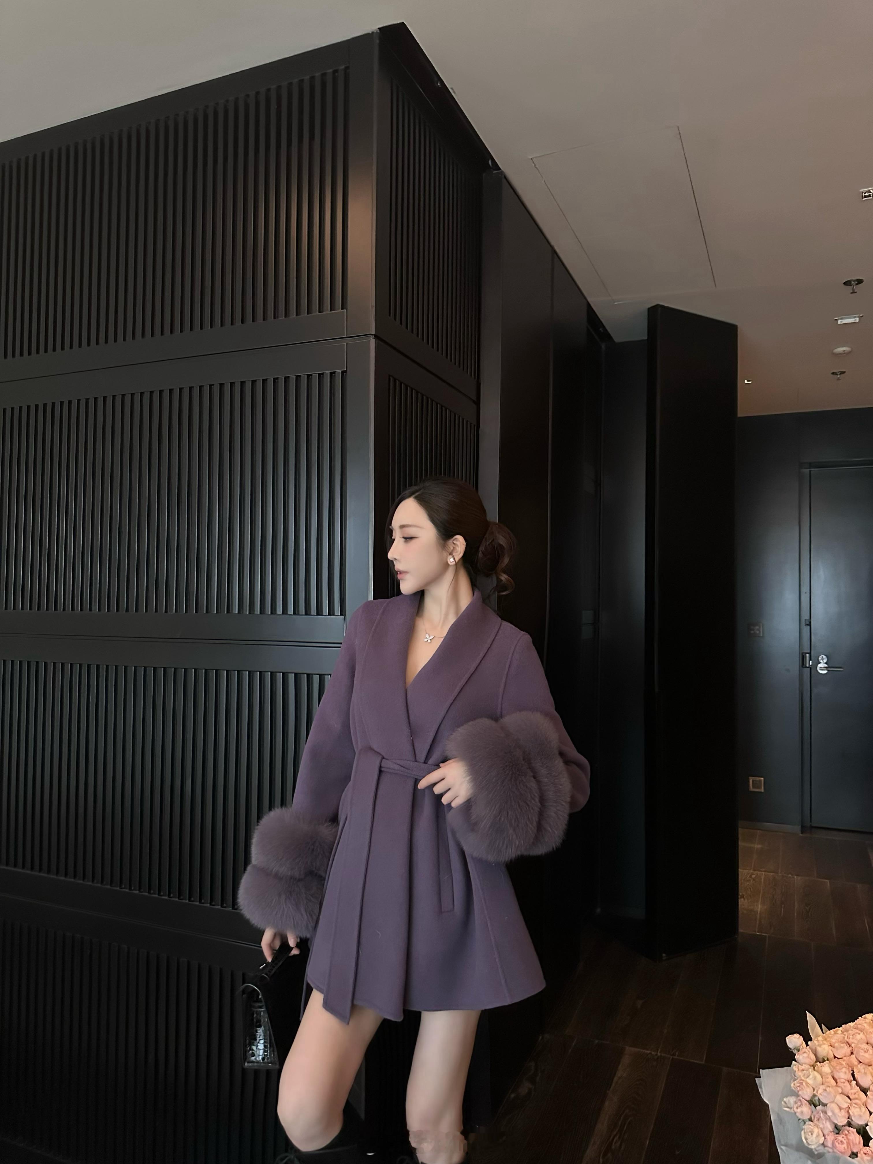 紫色上衣配灰色长裤,清新明媚又有女人味。