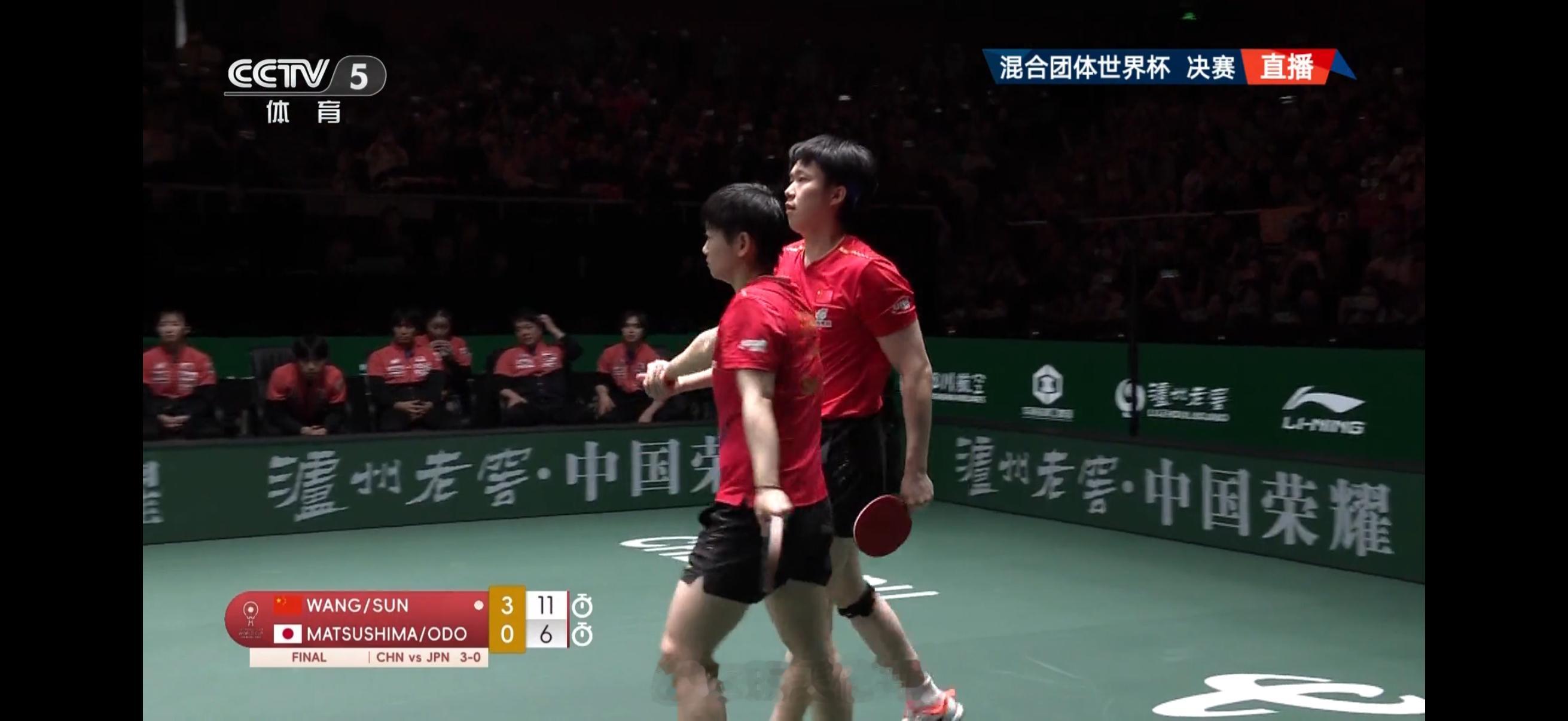 混团决赛国乒vs日本中国队🇨🇳 3-0 🇯🇵日本队第一盘:王楚钦/孙颖莎 11-4 11-4 11-6 松岛辉空/大藤沙月王楚钦孙颖莎3比0松岛辉空大藤沙月王楚钦孙颖莎vs松岛辉空大藤沙月