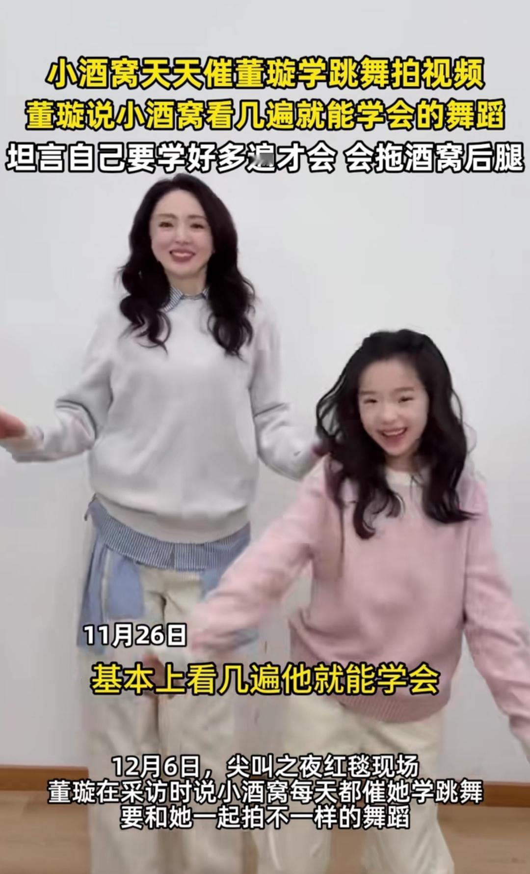 谁能想到,明星妈妈董璇也有被女儿“催着学”的一天?小酒窝天天追着让她练跳舞拍视频,自己看几遍就会,董璇却得反复练,这反差也太真实了。 这哪是简单的跳舞啊?是孩子用自己的方式,拉着妈妈参与自己的世界。小酒窝的天赋藏在灵动的动作里,而董璇一遍遍练习的耐心,藏着最细腻的母爱——不是谁都要跳得多好,陪伴本身就是意义。 现在很多家长忙着给孩子报班,却忘了亲子相处最舒服的样子,就是这样互相陪伴、一起成长。小酒窝的催促里没有压力,只有“想和妈妈一起玩”的纯粹,董璇的配合里满是包容,这份松弛感太让人羡慕。 亲子间的温暖从不是单向付出,而是像这样,你带着我玩,我陪着你练。这样的日常小事,比任何华丽的画面都动人。