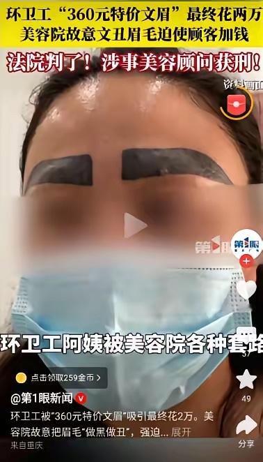 判的太轻了,真是丧心病狂! 河南一环卫工人看到低价的纹眉,就去做了,谁知商家故意做“做黑做丑”,少放舒缓胶,细针换成粗钢针,让顾客疼痛难忍,不得不选择几千块的纹眉,要修复还还要上万块。 12月,河南武陟县法院判了个美容店的案子,说起来挺让人唏嘘的,360块钱的文眉广告,最后让环卫工人刷了2万块,这可不是个例,算上其他受害者,总共38个人被骗了75万多。 360块钱,对环卫工人来说是什么概念?可能是起早贪黑扫半个月街的工资,是省吃俭用攒下给孙子买奶粉的钱,是舍不得给自己买件新棉衣的积蓄。他们每天凌晨四点就穿梭在寒风里,双手冻得开裂,衣服上沾着尘土,看到“低价纹眉”的广告,不过是想圆一个“爱美”的小小心愿,却没想到掉进了商家精心设计的陷阱。 那位被骗的环卫工人张阿姨(化名)后来回忆,当时看到美容院门口的海报写着“360元无痛纹眉,不满意免费修复”,心里动了心。她一辈子没怎么打扮过,看着身边姐妹有纹眉的,显得精神,就想着自己也试试。可一躺到操作台上,就感觉不对劲了——眉笔勾勒的形状粗粗怪怪,上色时疼得她浑身发抖,眼泪直流。 她想叫停,美容师却一边说“刚开始都这样,忍忍就好”,一边加快了手上的动作。后来她才知道,商家故意少放舒缓胶,还把承诺的细针换成了粗钢针,就是要让顾客疼到崩溃,然后趁机推销高价项目。“疼得我实在受不了,她们就说360块的是基础款,想不疼、做得好看,得升级成6800块的进口色料套餐。”张阿姨说,她当时疼得脑子发懵,又被美容师围着不停劝说,稀里糊涂就刷了卡。 可这还没完。半个月后,张阿姨的眉毛不仅没变好,反而又黑又粗,像两条“毛毛虫”挂在脸上,还伴随着红肿发炎。她去找商家,对方又说“这是正常反应,想修复得做12800块的专业修复套餐,不然以后眉毛会留疤”。看着镜子里陌生又丑陋的自己,想着自己辛苦赚来的2万块钱就这么没了,张阿姨当场就哭了,她想报警,却被商家威胁“是你自己同意升级的,报警也没用”。 像张阿姨这样的受害者,还有37个。她们大多是环卫工人、保洁员、退休老人,收入不高,信息也相对闭塞,很容易被“低价”广告吸引。有位60多岁的李奶奶,被骗了1万8,回家后不敢告诉儿女,自己躲在房间里哭了好几天,最后还是邻居发现她情绪不对,才陪着她报了警。 警方调查后发现,这家美容店根本没有正规的美容资质,所谓的“纹眉师”也只是培训了几天就上岗。他们的套路很固定:先用超低价广告吸引顾客到店,然后在操作中故意制造疼痛、做坏效果,再用“留疤”“毁容”等话术恐吓顾客,逼迫她们升级高价套餐和修复项目。短短半年时间,就靠这种卑劣手段骗了75万多。 可让人愤怒的是,法院最后只判了美容店老板有期徒刑一年六个月,并处以罚金。这样的判决,让受害者们难以接受。“我们辛辛苦苦赚的钱被骗走,身心都受到了伤害,可骗子只判了一年多,这也太轻了!”张阿姨的话道出了所有受害者的心声。75万的涉案金额,38名受害者,其中大多是弱势群体,这样的量刑确实难以起到震慑作用。 其实,这类“低价美容陷阱”早就不是新鲜事了。近年来,全国各地都有类似案件发生,骗子专门盯着低收入群体和老年人,利用他们爱美的心理和对美容行业的不了解,实施诈骗。他们的行为不仅侵犯了消费者的财产权,还可能对消费者的身体造成伤害,有些受害者因为使用了劣质色料,皮肤过敏、发炎,留下了永久性的疤痕。 更让人揪心的是,这些受害者被骗后,很多人因为觉得“丢人”或者担心“报警没用”,选择了忍气吞声,这反而让骗子更加肆无忌惮。还有些受害者缺乏保留证据的意识,没有留下聊天记录、付款凭证等,给维权带来了很大难度。 想要杜绝这类骗局,光靠受害者提高警惕远远不够。相关部门应该加强对美容行业的监管,严厉打击无资质经营、虚假宣传、强制消费等违法行为,提高违法成本,让骗子不敢轻易下手。同时,也应该多开展普法宣传,尤其是在老年人和低收入群体中,普及美容消费的注意事项和维权方法,让他们知道遇到骗局该如何保护自己。 美容行业的本质是为了让人变得更美好,而不是成为骗子敛财的工具。那些欺负环卫工人、退休老人的骗子,利用别人的善良和爱美之心行骗,简直丧心病狂。希望这次的案件能引起相关部门的重视,加大打击力度,也希望所有消费者都能擦亮眼睛,远离“低价陷阱”,让骗子无处遁形。 各位读者你们怎么看?欢迎在评论区讨论。