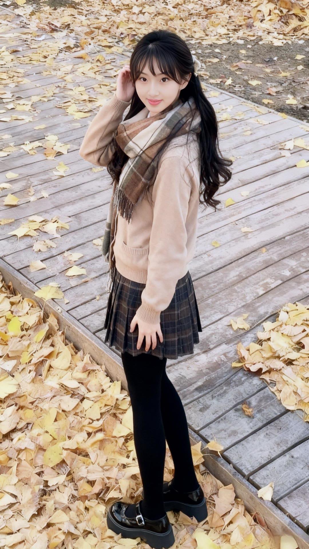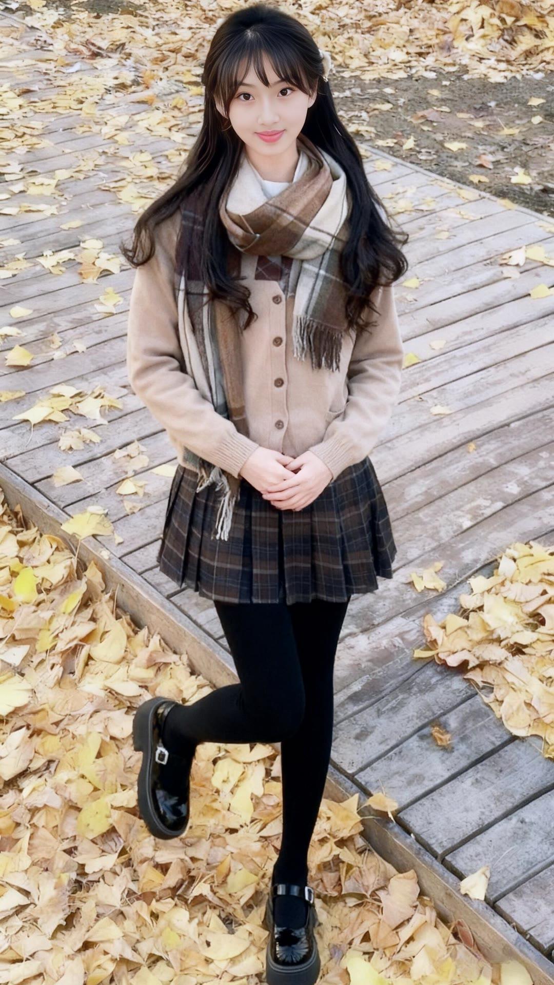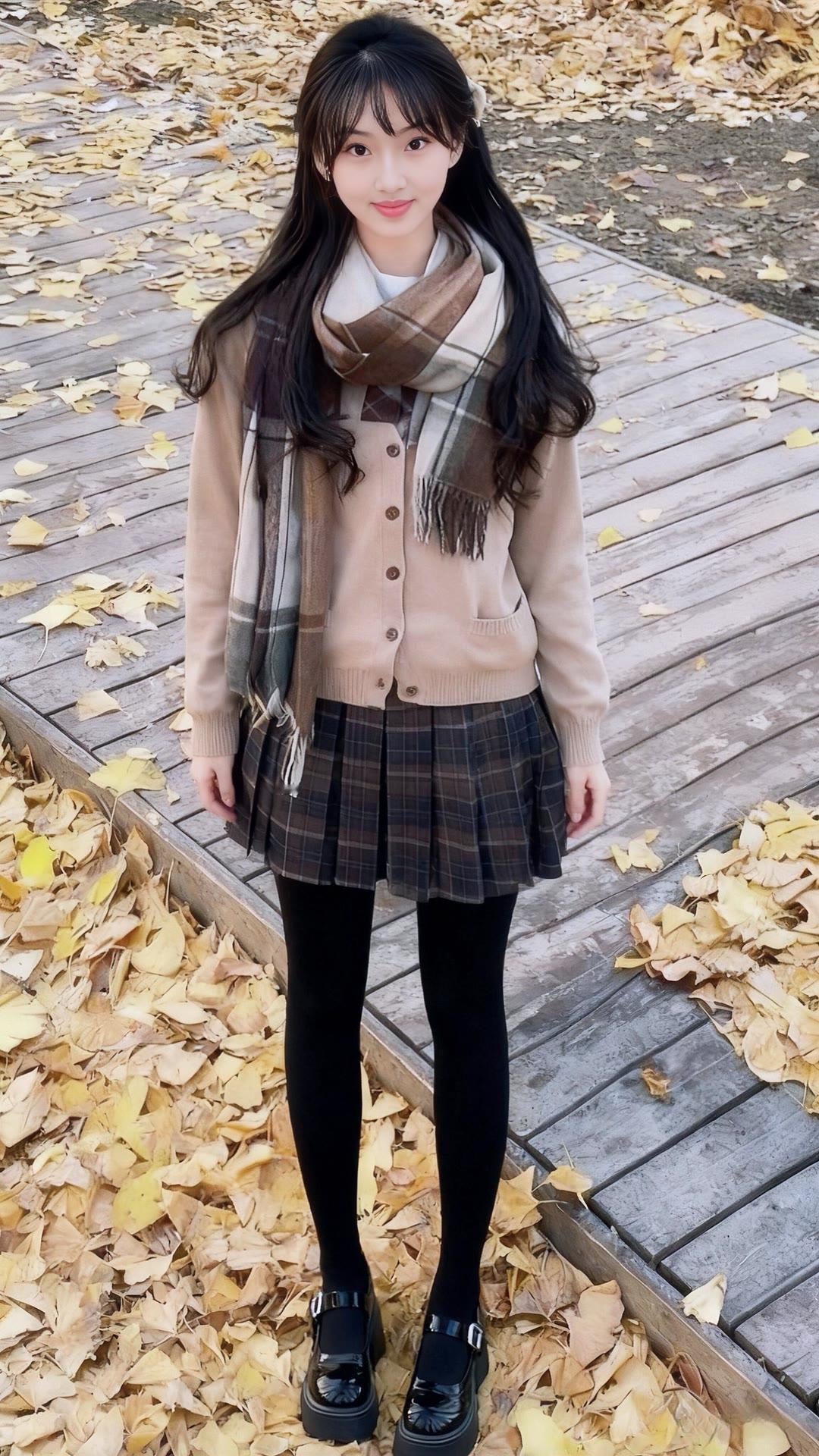 秋日穿搭指南:复古格子裙+米色毛衣+格子围巾,温暖又时尚!