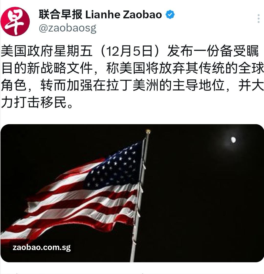 美国开始进行重大战略转向。 新加坡《联合早报》发文称,美国政府在12月5日发布了一份备受瞩目的新战略文件,文件称美国将放弃其传统的全球角色,转而加强在拉丁美洲的主导地位,并大力打击移民。 此次战略转向最直观的表现,是美国把外交重心从全球扩散拉回了自家“后院”拉丁美洲。 这份33页的《国家安全战略》报告罕见地将西半球置于核心位置,明确提出要“重申和执行门罗主义”,甚至炮制了所谓的“特朗普推论”,为强化在拉美的军事存在找借口。 事实上,美国早已用行动铺垫这一转向,11月以来,美军在加勒比和南美海域进行了数十年来规模最大的军事集结,部署了F-35战机、核动力潜艇和航母打击群等重型装备,还威胁要对委内瑞拉发动地面攻击。 经济上,美国能源巨头也加紧布局,埃克森美孚、雪佛龙已与巴西、委内瑞拉签署超200亿美元的油气开发协议,锁定了拉美未来10年30%以上的原油出口份额,同时抢占智利锂矿、秘鲁铜矿等关键矿产资源,这些都是新能源和半导体产业的核心原料。 打击移民和毒品走私则成为美国战略转向的“抓手”。文件将移民问题直接上升到“国家安全威胁”的高度,计划扩大海岸警卫队和海军在拉美海域的存在,必要时可使用致命武力打击贩毒集团。 数据显示,仅今年委内瑞拉就接收了92架次从美国遣返的移民航班,最近一架航班就载有175名移民。 美国缉毒局2025年的报告显示,美国缴获的可卡因84%来自哥伦比亚,却刻意将委内瑞拉塑造成“毒品恐怖主义”核心,这更像是为军事介入找的借口。这种操作逻辑很清晰:通过制造“安全危机”,让强化拉美控制的行为显得“师出有名”。 美国之所以放弃“全球霸主”的身段退回后院,核心是“美国优先”理念的极端化体现。 从内部看,特朗普政府需要通过强硬的对拉政策和移民政策巩固选民基础,迎合国内民粹主义情绪,把拉美塑造成“威胁来源”,以此强化保守派选民的认同。 从外部看,美国在全球多地的布局已显疲态,近年来频繁退群毁约,先后退出《巴黎气候协定》、联合国教科文组织,削减对联合国发展项目40%的资助,解散国际开发署并终止80%的项目,本质上是不愿再为全球公共产品买单。 与其在全球分散精力,不如集中资源掌控拉美这个“核心利益区”,确保能源、矿产供应安全,同时阻止其他大国影响力渗透。 这种战略转向看似是“收缩”,实则是换种方式巩固霸权,但能否如愿还是未知数。一方面,拉美国家的自主意识正在觉醒,巴西总统卢拉直言“21世纪的拉美不再需要主人”,墨西哥等国也对美国的霸权姿态明确说不。 美国用经济制裁和援助挂钩的方式逼迫拉美国家选边站队,比如因巴西司法机构判决前总统博索纳罗就威胁加征关税,给支持自己的阿根廷提供200亿美元救助,这种“奖惩分明”的胁迫政策已引发地区反感。 国际社会对美国的信任度持续下滑,皮尤研究中心民调显示,60%的欧盟民众认为美国“不再是可靠伙伴”,晨间咨询公司的调查更显示美国全球净好感度为-1.5,而中国为8.8。 美国的战略转向不是放弃霸权,而是把“全球扩张”改成了“重点深耕”,试图通过牢牢掌控拉美后院,为其全球竞争筑牢根基。 但这种基于单边主义和霸权逻辑的调整,不仅会加剧拉美地区的地缘紧张,还会进一步冲击本就脆弱的国际秩序。未来,美国能否在拉美重建所谓“主导地位”,拉美国家如何平衡自主发展与外部压力,都将成为影响全球格局的关键变量。