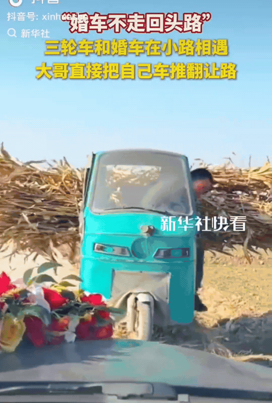 这才是格局大! 山东济南,在农村狭窄的道路上,大哥为了给婚车让路,竟然直接推翻了自己的三轮车。 大哥开着一辆三轮车,车上拉着玉米秸秆。由于秸秆很长,超出了三轮车很多。大哥回家的路上,正好遇到一辆婚车。 一般的习俗是婚车不能倒车,不吉利。大哥知道这一习俗,迅速把三轮车倒到路边,然后下车后毫不犹豫地把三轮车推翻,让出了本来就狭窄的小路。 从婚车上下来一位戴眼镜的男子,给了大哥一个红包。大哥举着‘大吉大利’的红包,站在路边指挥着婚车离开。 大哥这格局不是一般的大。婚车不能倒车的习俗里藏着对新人的美好期许,而大哥推翻三轮车让路的举动,更让这份期许多了份沉甸甸的善意。 大哥没有犹豫计较,只凭一份淳朴的体谅,就为陌生的婚礼扫清阻碍——秸秆可能散落、三轮车或许受损,但这份不掺杂质的成全,比任何仪式都更动人。 大哥的选择无关利益,只源于骨子里的厚道:不纠结习俗的‘死板’,只在乎他人的顺遂。这份主动退让的格局,不仅让婚车顺利通行,更让一场喜事多了段暖心插曲。为这位大哥的格局点赞!