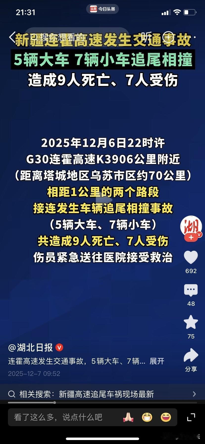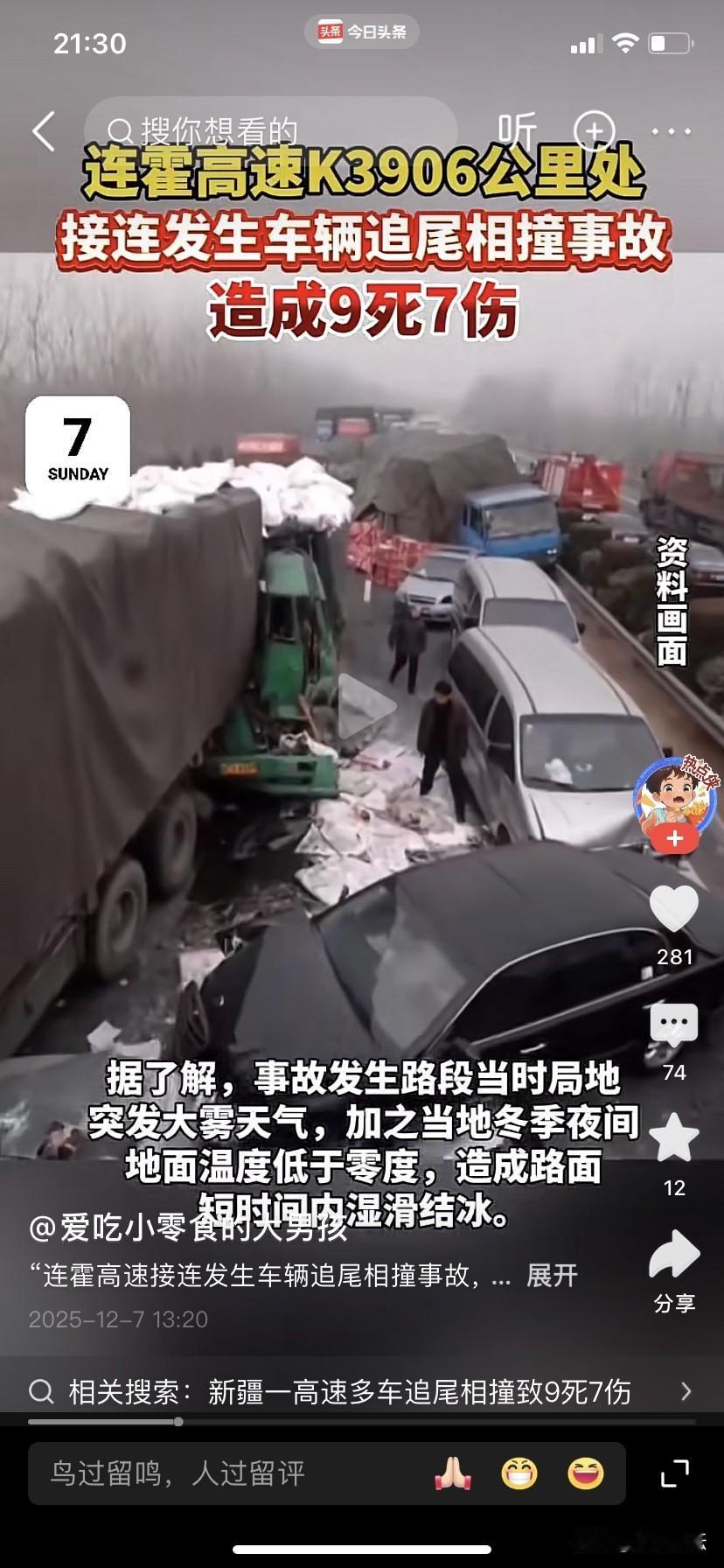 警惕了,新疆大雾天气造成汽车追尾9死7伤的惨剧。 2025年12月6日22:00许,在新疆G30连霍高速K 3906公路距离塔城地区乌苏市约70公里相距1公里两个路段发生了两起交通事故事故,共造成9人死亡,7个人重伤,伤者已被伤者已被送医紧急抢救, 据悉,事故原因是由于12月6日22:00许,当地突发大雾天气,能见度低,气温骤降,路面湿滑结冰,在高速上行驶车速快根本刹不住车。 小编提醒广大司机朋友:出行前一定要看天气预报,为了自己和家人的安全,请谨慎驾驶。如有恶劣天气,尽量不出门。祝大家一路顺风。[祈祷][祈祷]
