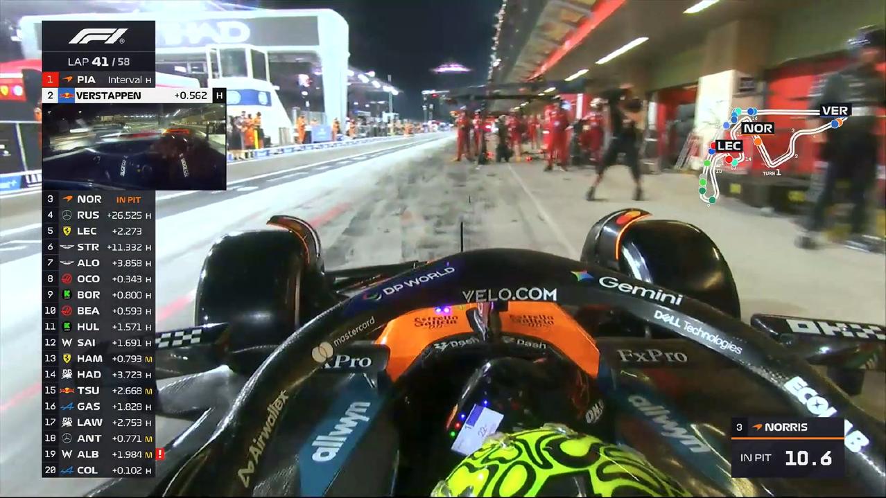 从未如此希望潘子拿生涯第五冠,感觉迈凯伦真的不配这个世界冠军。 Lap 40/58,皮亚斯特里依然没有进站,潘子目前追到和他的差距只有1.5秒。 41/58 诺里斯跟随勒克莱尔执行二停,出站在P3,维斯塔潘超越尚未进站的皮亚斯特里来到领跑位置。