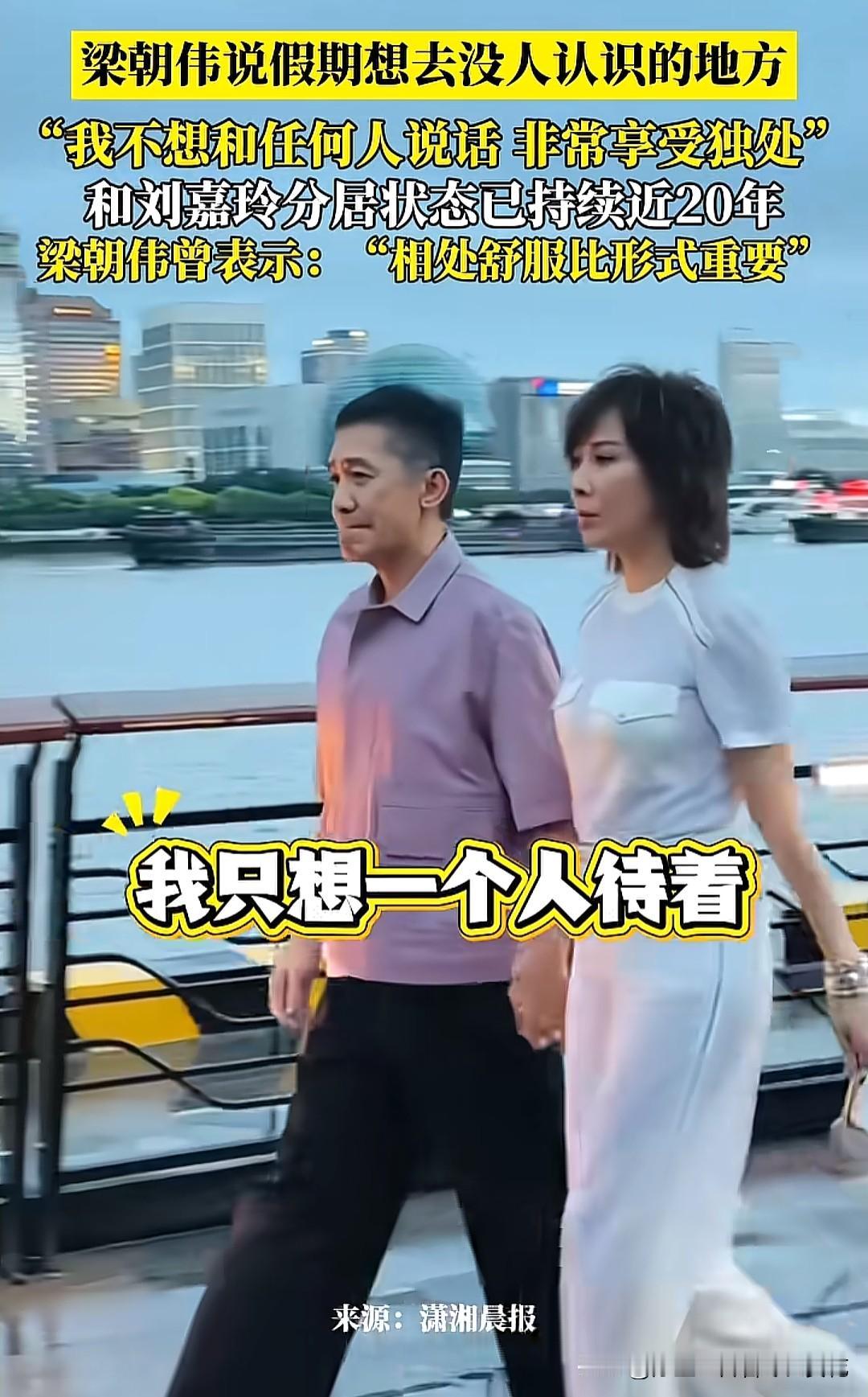 相信很多人会跟梁朝伟有着同样的想法,如果财富自由,不想接触人,不喜欢跟别人交谈,喜欢独处。因为世界上最复杂的就是人,接触不同人往往比较累,尤其是跟三观不一致的人接触,更是心累。 人在社会里摸爬滚打久了,就会发现一个事实,人是不得已才合群的。我们会经常看到身边有钱人独自生活,其实只是他们跳出了圈层而已,他们已经有经济实力买到最贵的东西,那就是距离,即人和人之间的距离! 金钱用来消费,财富实现自由,它可以用来购买宁静和不被定义的人生。因为不管买什么,情绪价值只能给到一时,只有宁静才能致远。但是梁朝伟和老婆刘嘉玲都分居快20年了,连夫妻都不想在一起,看来是没感情了,独处可不是一个人安安静静的过,而是不打扰外人,不干扰自己内心,能和心爱的人平淡生活在一起的。
