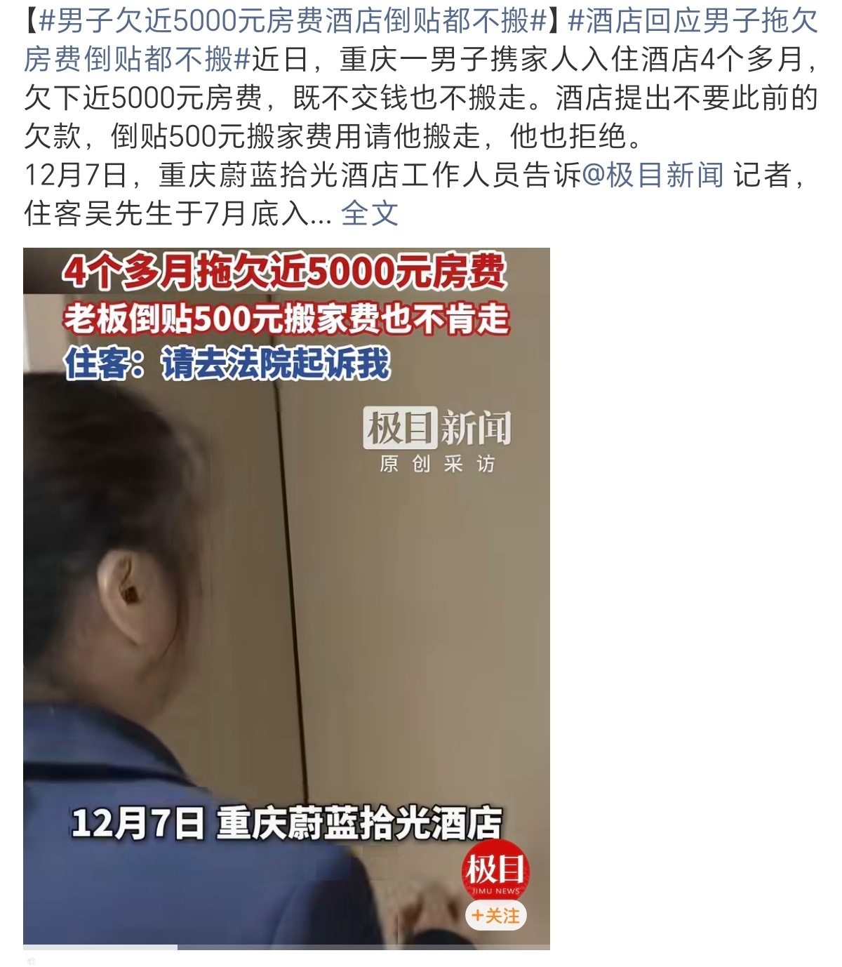 男子欠近5000元房费酒店倒贴都不搬这是住成啥样了酒店倒贴求搬