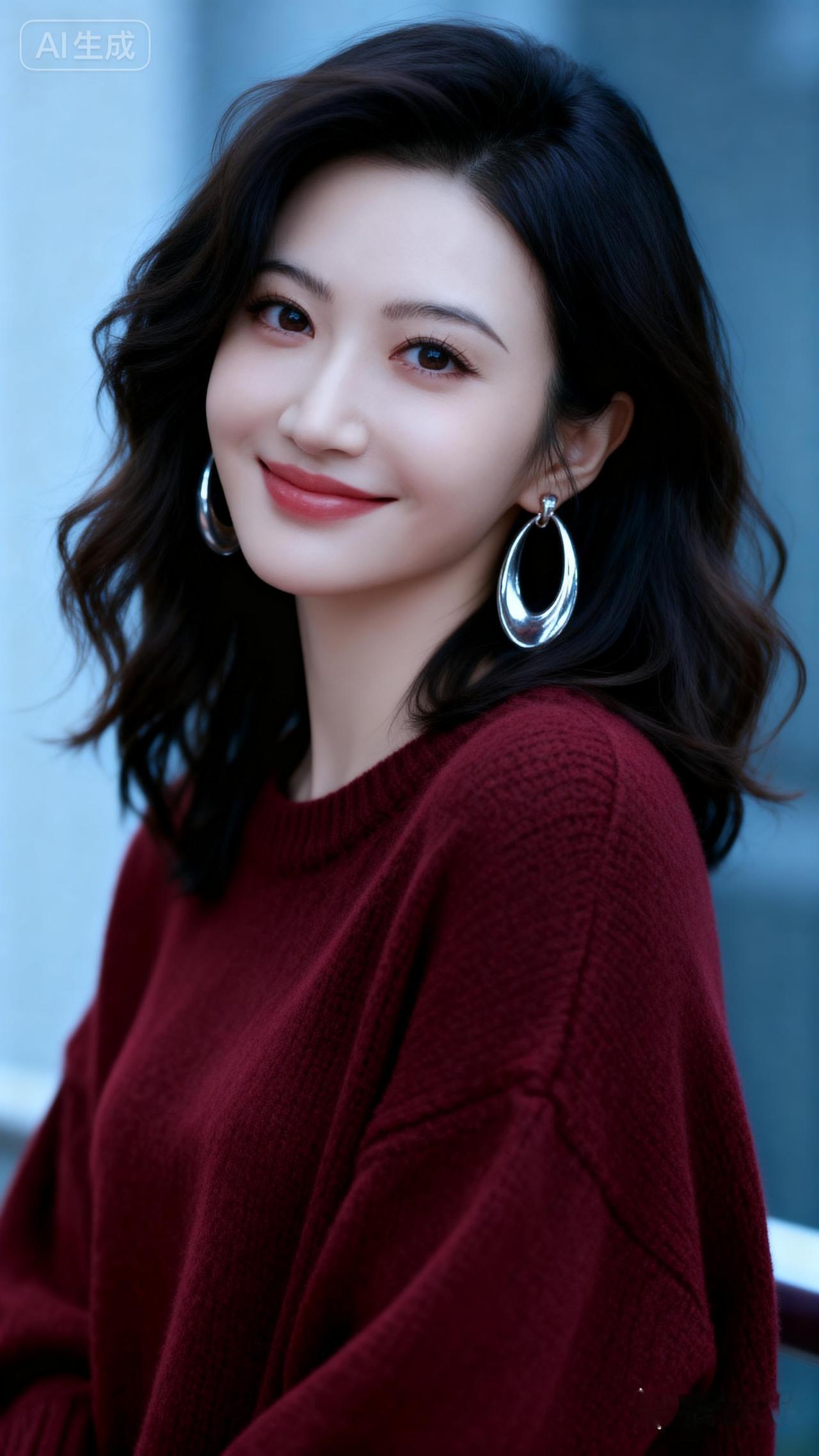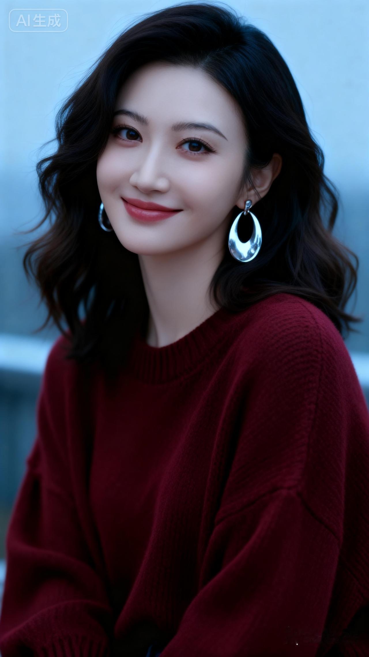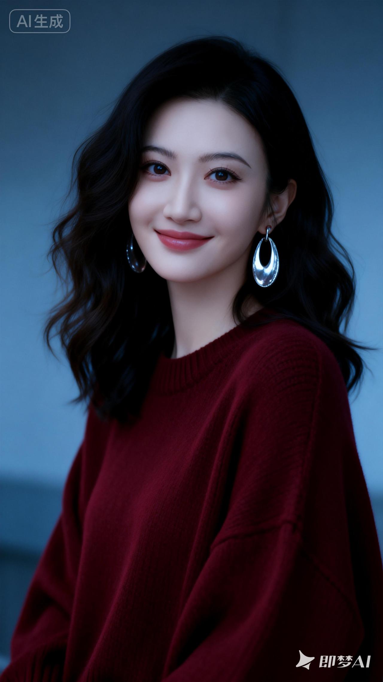 温柔微笑,红衣少女,时尚耳环,气质优雅