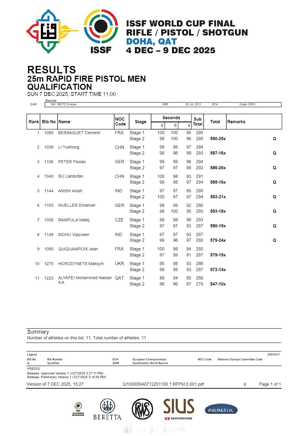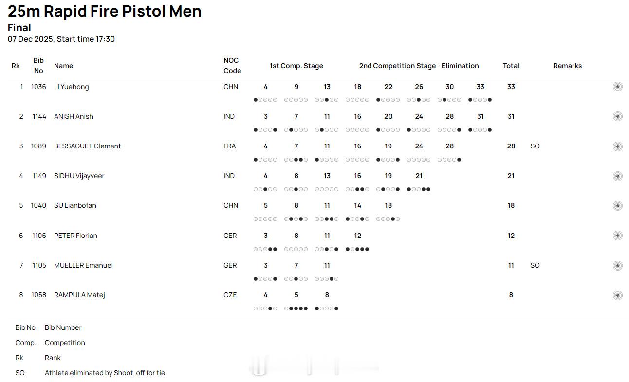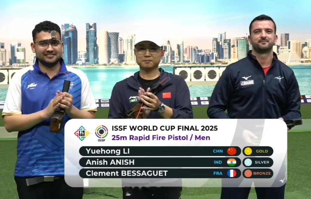 【射击世界杯总决赛男子手枪速射李越宏夺冠】国际体坛战报速递 12月7日多哈,射击世界杯总决赛结束男子25米手枪速射比赛。奥运冠军李越宏从第二轮开始一直领先,以33中夺得中国队第三枚金牌。印度阿尼什和法国世锦赛冠军贝萨盖分获银铜牌。另外一位中国选手苏连博凡名列第五。