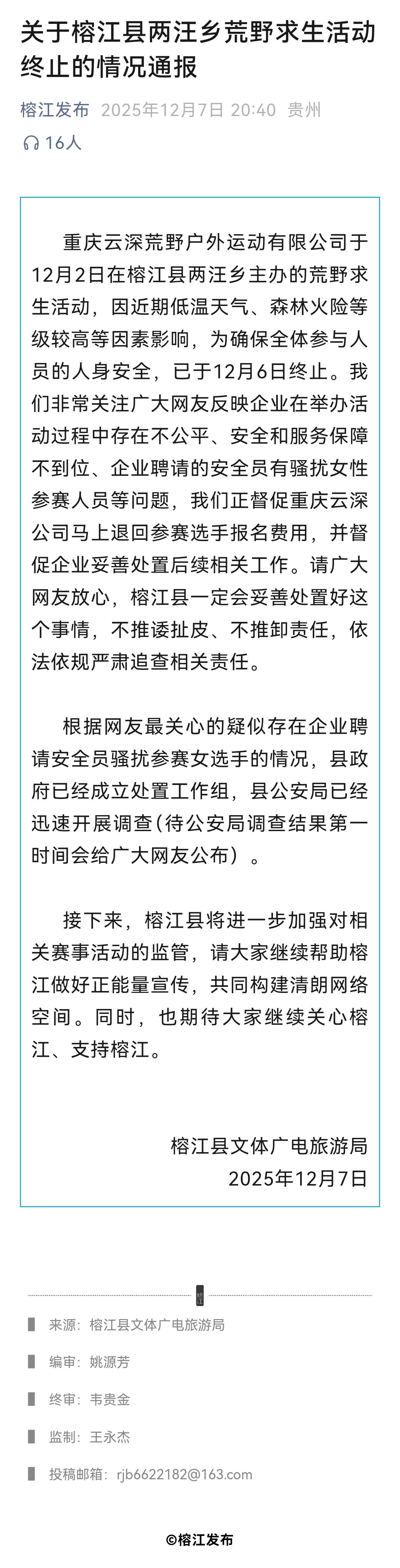 近期,湖南张家界七星山荒野求生挑战赛在网络出圈后,重庆云深荒野户外运动有限公司看到相关赛事有热度,便自主选址在榕江县,这座因“村超”火爆中外的贵州县城,随后自发组织了榕江版“荒野求生赛”,而榕江县相关部门仅提供了场地备案与基础协调。官方回应贵州榕江版荒野求生被叫停贵州榕江版荒野求生开赛4天被叫停12月2日,重庆云深荒野户外运动有限公司在榕江县两汪乡主办的“茅人河荒野求生赛”共吸引200名正式选手参赛。谁能想到,该活动主办方公司如此不靠谱,开赛仅4天便出现出现“安全员骚扰女选手”“违规投喂作弊”等离谱操作,目前已被榕江县相关部门调查追责。至于榕江版“荒野求生赛”的停办,有网友针对主办方公司违规、恶劣操作等投诉的原因,也有当地气温骤降、安全隐患等客观原因。在我看来,榕江县针对此事的处置很迅速、很暖心,不仅督促企业立即退还参赛选手的各项报名费用,更成立联合处置工作组,针对“安全员骚扰女性参赛者”等投诉开展调查,积极维护参赛选手权益,更将对主办企业的违规操作一查到底、严惩到底,依法依规严肃追责。2023年9月,个人有幸前往榕江感受“村超”,还品尝了当地特色的牛瘪火锅,小城氛围让我内心感受到久违宁静。(详情见:网页链接)今年出圈的“苏超”,以及各省举办的足球赛事,或多或少都是受到贵州榕江“村超”的影响,这座小城给网友带来很多惊喜与感动,相信真诚的榕江,正如你最初知道溶江时那样,期待榕江给我们带来更多惊艳。官方回应贵州榕江版荒野求生被叫停