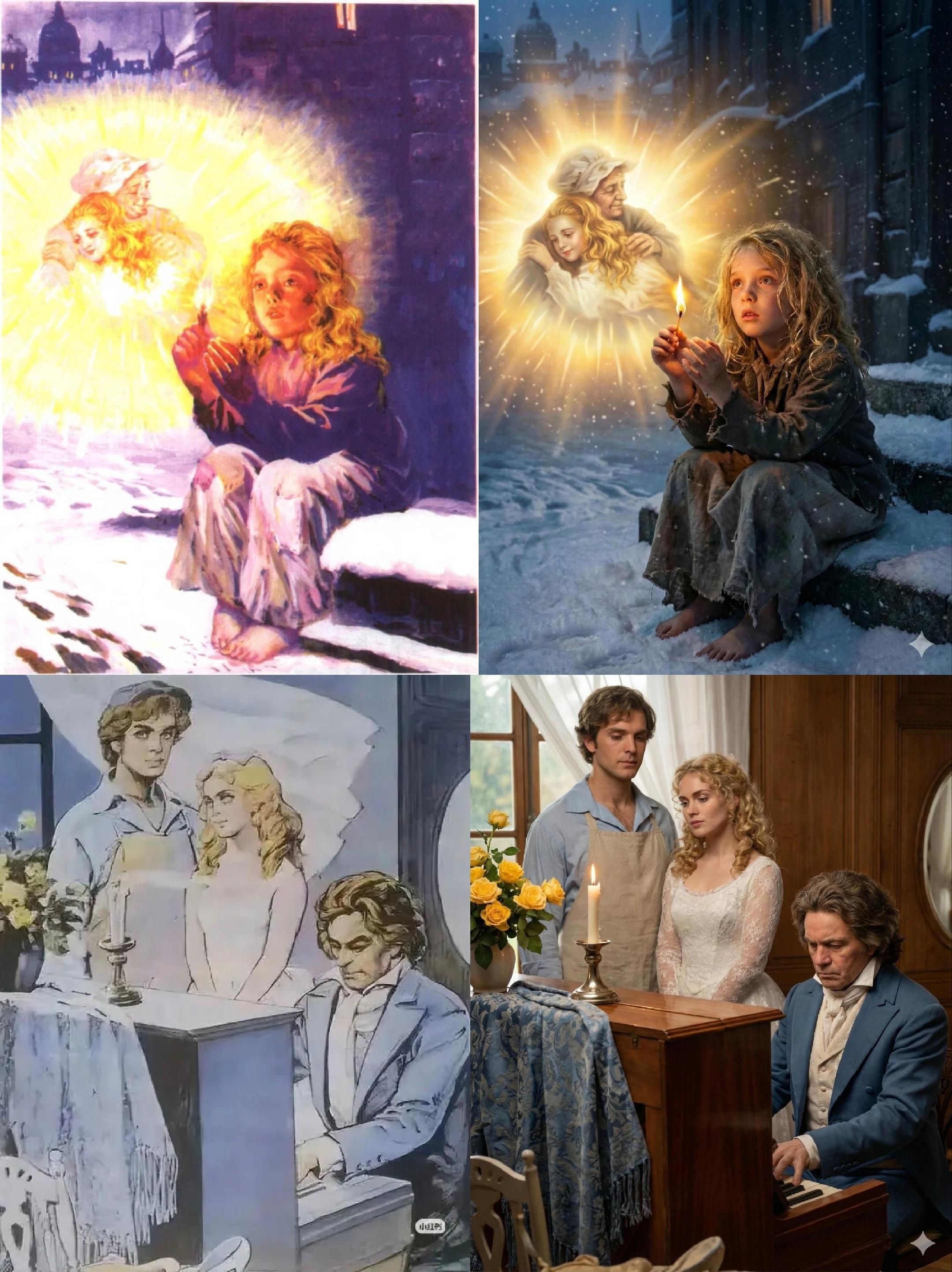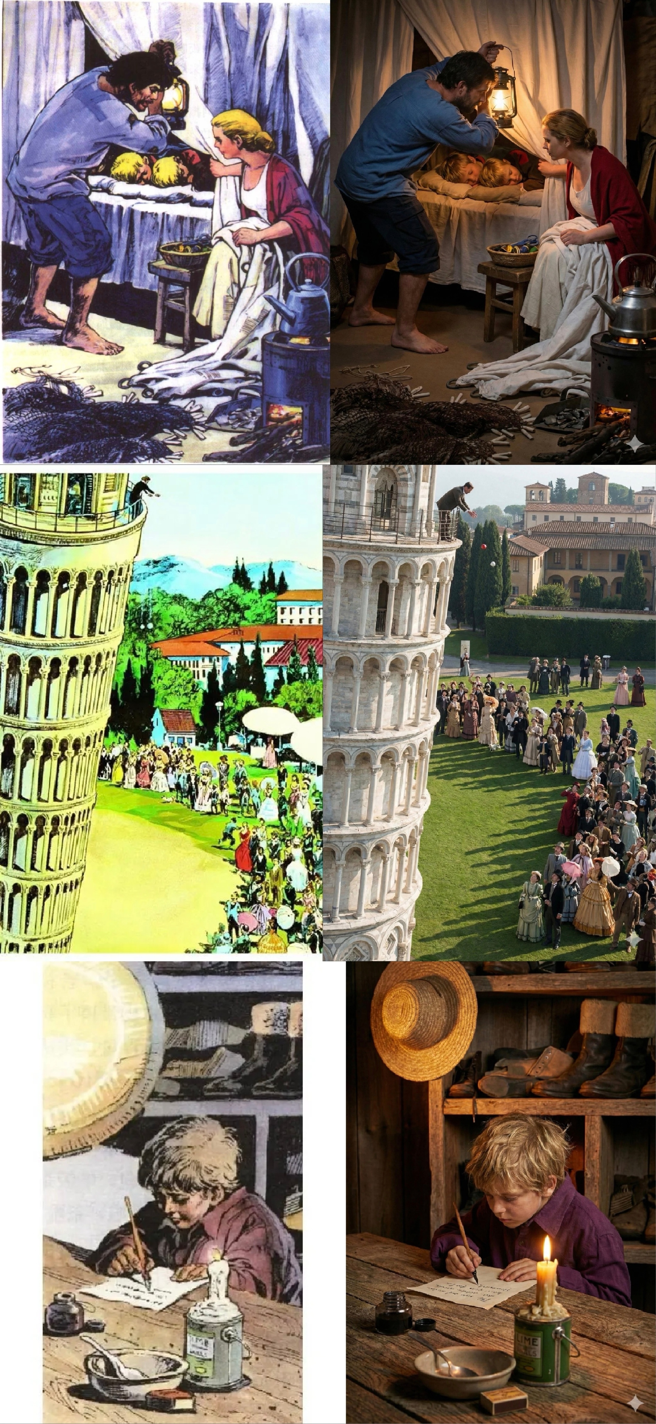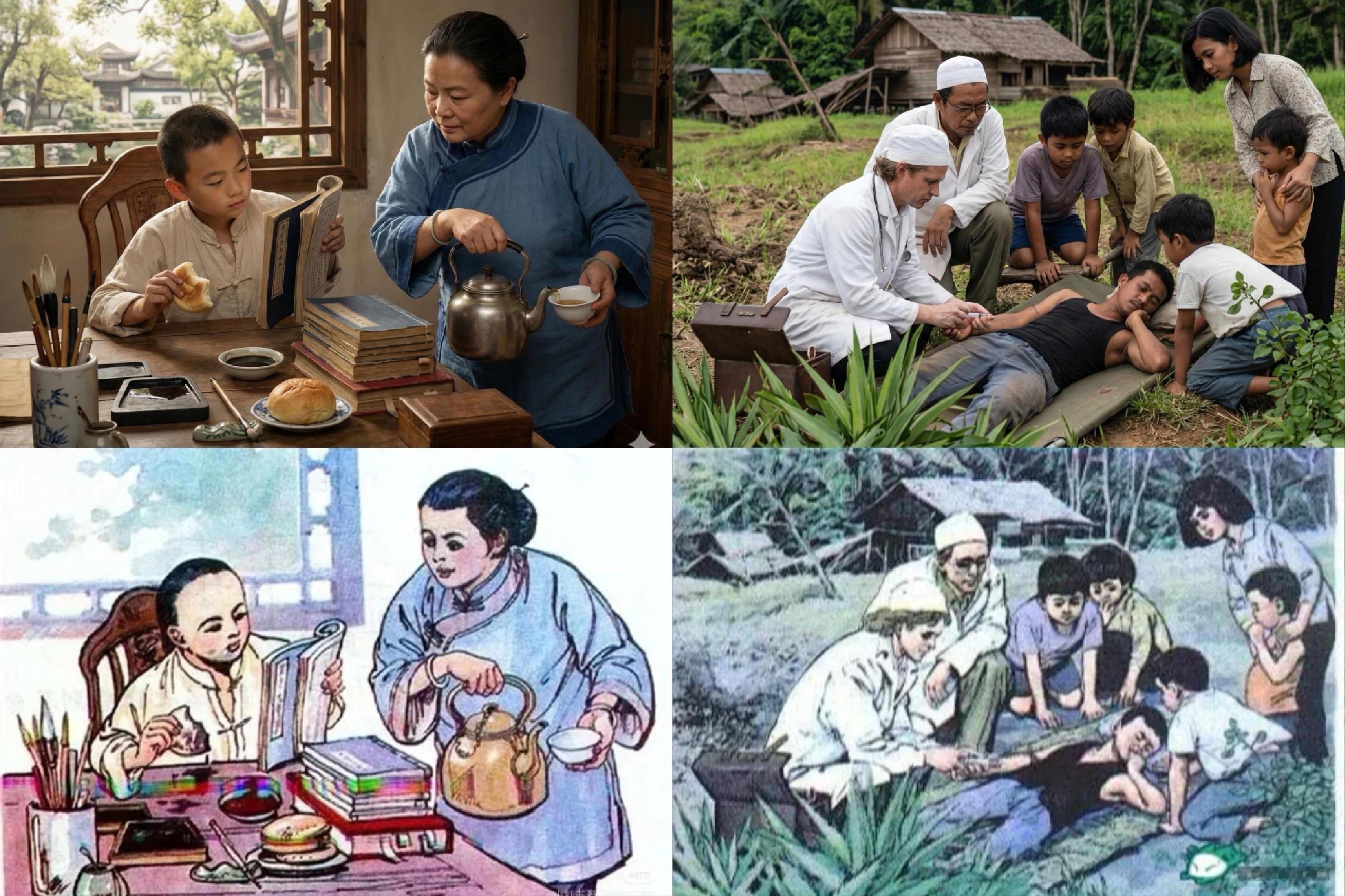 用AI还原80、90后语文课本里的插图 ,细节处还是有差别,看AI图多了,总是感觉“一眼假”。在我看来,漫画所能表达的意境,AI生成的实景图比不了,甚至AI图会让人产生“恐怖谷效应”,似像非像的AI图,人物的微表情、皮肤、光影都有偏差,心理机制上会有种本能厌恶,从而降低被欺骗的风险。科普满谈