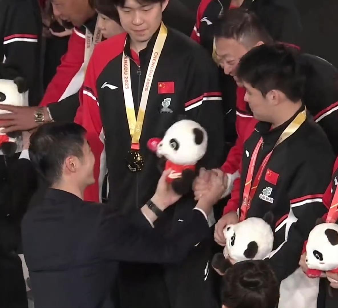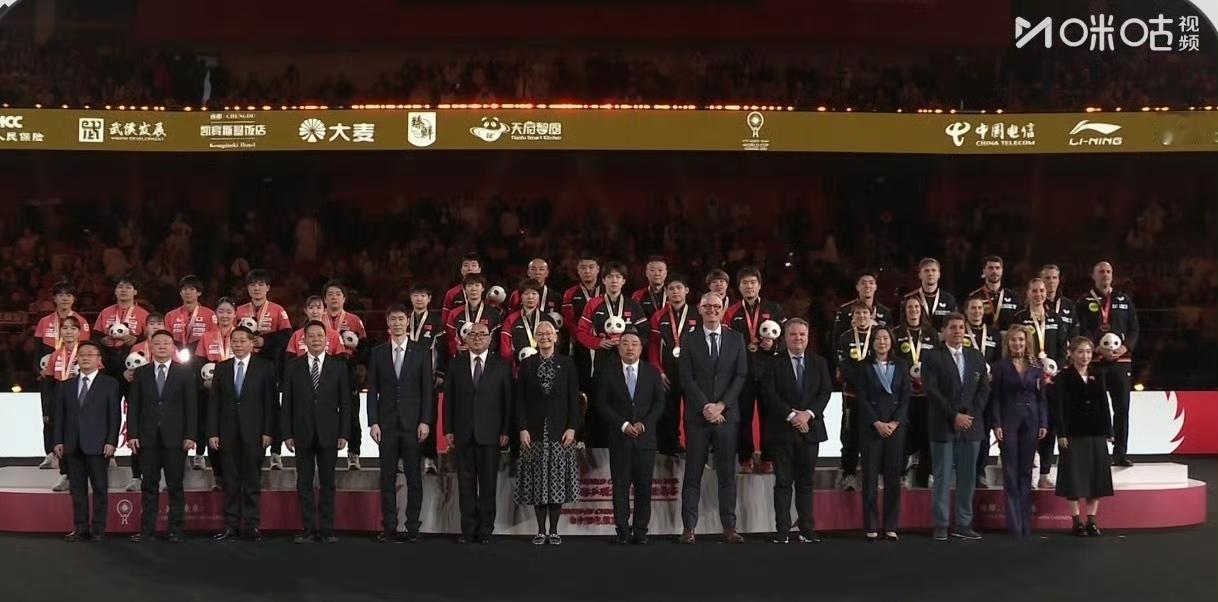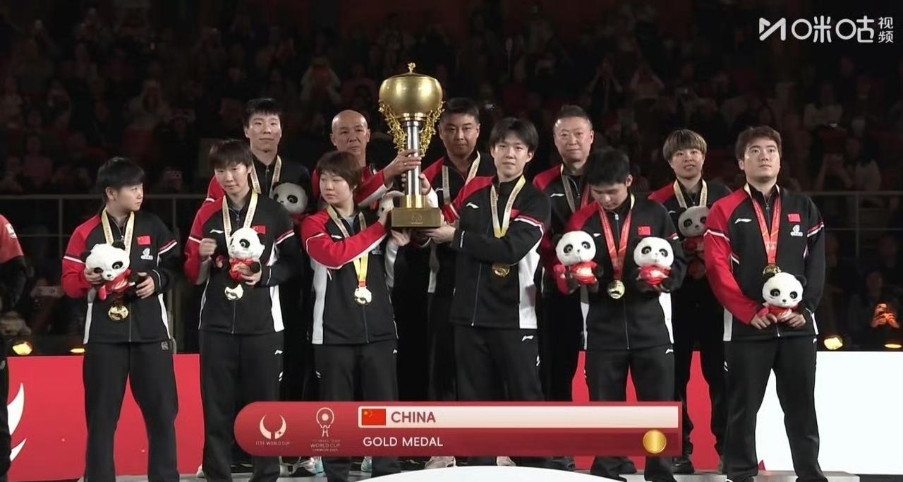 升国旗!奏国歌! 五星红旗在2025成都国际乒联混团世界杯赛场高高飘扬! 刚刚中国队以8-1的领先优势击败日本队夺冠! 刘国梁和王励勤两位领导参加了颁奖仪式,并和冠军、亚军、季军队伍合影留念。 不要议论奖杯捧在谁的手里,无论捧在谁的手里,都是中国队选手们齐心协力赢来的。