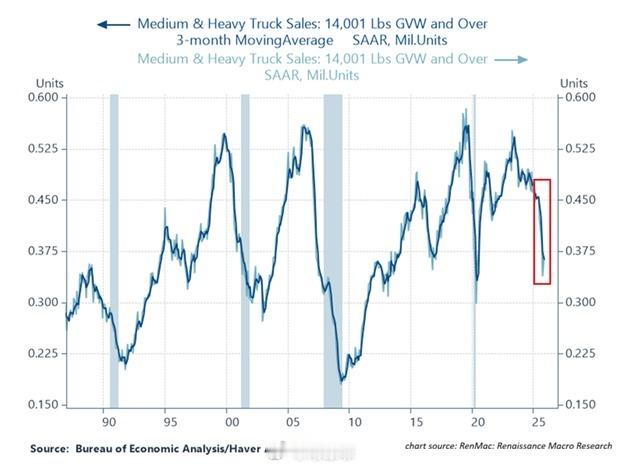 美国卡车需求正在崩溃: ❶与前三个月相比, 过去三个月美国重型卡车销量暴跌 47%,年化销量为 36.3 万辆,为 2020 年疫情爆发以来的最低水平。 ❷过去五个月中,卡车销量有四个月出现下滑。 过去, 这种快速下跌只在经济衰退期间出现过。 这是因为货运、 建筑和工业活动的商业需求已 显著减弱。 ❸因此, 卡车销量预计将在 2025 年下半年成为 美国 GDP 增长的一大阻力。 ❹人工智能交易自成一个世界。老常政经美国经济美国经济数据常涤非观点