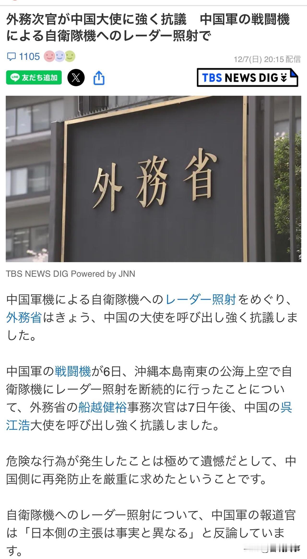 就在刚刚! 日本外务省的船越健裕事务次官在没有了解实际情况下,向我们提出抗议。船越健裕表示,“要求东大方面严加防止再次发生。” 事实上,船越健裕应该要求你们的防卫省严加约束底下的飞行员,不要再被警告多次的情况下,还做抵近挑衅的危险动作。我们的军机、军舰在公海正常航行、演训,这是符合自由航行规则,符合国际法的。