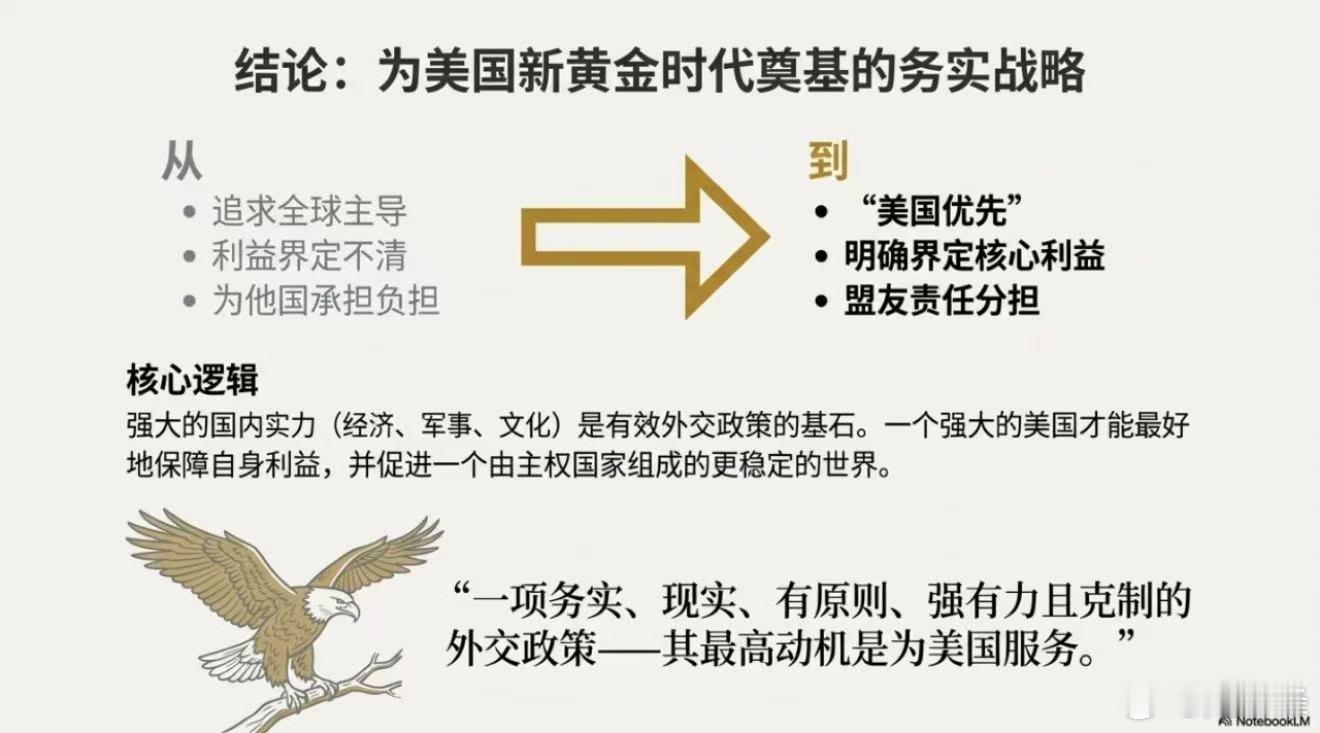 📄 从“全球霸权”到“美国优先”:深度解读2025版美国国安战略美国总统特朗普于2025年12月4日发布了其第二任期的首份《国家安全战略》报告。这份仅33页的文件,不仅是未来三年美国国家安全的行动纲领,更被视为美国长期战略转型的“路标”。即便未来美国政权更迭,这种基于现实国力收缩和经济优先的逻辑,极难被彻底扭转。这份报告向世界展示了特朗普政府眼中的世界图景,以及美国应对这一图景的“新现实主义”逻辑。以下是基于中美G2视角的详细拆解:❓ 1. 报告如何诊断美国过往战略的“病灶”?报告开篇即对冷战结束以来的美国外交政策进行了猛烈抨击,这构成了新战略的逻辑起点。过度扩张的代价: 报告指出,美国外交精英长期错误地将“维持世界主导地位”置于“美国本土利益”之上。美国高估了自己同时维持庞大海外军事/外交体系和国内福利/行政体系的能力。战略误判: 特别点名了过去五十年的对华政策,认为允许中国融入全球经济是“历史性失误”,导致美国制造业空心化,反而养肥了竞争对手。告别意识形态: 新战略明确抛弃了“输出民主”和价值观外交,转而拥抱“灵活现实主义”。这意味着美国不再愿意为了抽象的意识形态或盟友义务而无底线地牺牲自身利益。🧭 2. 新的国家安全战略方针:四大支柱这份报告的核心是“战略收缩”与“精准发力”,具体方针如下:🛡️ 本土绝对安全(第一优先级):边境控制: 将打击非法移民、毒品走私视为国家安全的首要任务,甚至高于反恐。门罗主义2.0(特朗普推论): 这是一个极具侵略性的地缘概念。报告强调西半球(美洲)是美国的“后院”和战略前沿,坚决阻止非西半球势力(暗指中国和俄罗斯)在拉美部署军力或控制关键资产。美国将在此区域加强军事存在,甚至不惜使用致命武力打击贩毒集团。🤝 盟友关系重塑(责任共担):拒绝“搭便车”: 报告对盟友的态度变得极其强硬,要求盟友必须承担更多的防务责任。针对欧洲: 报告罕见地批评欧洲面临“文明消亡”的风险(因移民和低生育率),并要求北约成员国将军费提升至GDP的5%。对俄缓和: 为了集中精力对付中国并降低全球维稳成本,报告主张尽快结束乌克兰危机,寻求与俄罗斯重建战略稳定。💰 经济安全即国家安全(核心战场):再工业化: 强调贸易平衡、供应链安全、能源主导权和金融主导权。互惠公平: 不再单纯追求“脱钩”,而是追求“对等”。如果盟友不买美国商品,美国也不会买他们的。🌏 印太战略(经济竞争+军事威慑):经济上: 重点在于赢得经济未来,防止军事对抗。军事上: 强调维持台海现状,确保南海航行自由。虽然兵力有所收缩,但在第一岛链仍需保持足够的军事优势以威慑“潜在冲突”。🇨🇳 3. 对中国的表述与战略变化:从“首要威胁”到“近乎对等”这是报告中最具迷惑性,也最需要我们透过现象看本质的部分。措辞上的“软化”:相比拜登时期将中国定义为“最重大的地缘政治挑战”或“首要威胁”,特朗普2.0版报告不再提“大国竞争”,也没有明确将中国列为“主要战略竞争对手”。通篇使用“China”而非带有分裂意味的“PRC”。承认中美关系已从“富裕国vs贫困国”转变为“近乎对等的竞争者”(Near-peer)关系。实质上的“硬化”与转向:并非“示好”: 这种定位的调整,并非意味着美国放弃了遏制,而是承认单纯的强硬对抗(如贸易战)未能奏效,且美国自身难以承受长期全面对抗的代价。战场转移: 将博弈主战场从“地缘政治”明确转移到了“经济账”上。报告约60%涉及中国的内容都在讨论贸易逆差、关键矿产依赖和制造业。手段升级: 既然单边施压效果不佳,新战略的核心转向了“组建经济北约”。即联合盟友利用集体经济力量,通过“以实力求和平”的方式,在供应链、关键技术和市场份额上与中国进行长期博弈。台湾问题的定位:报告虽然强调“不支持单方面改变现状”,但明确指出台湾的战略价值在于其“分割东北亚与东南亚战区、控制第二岛链通道”的地缘意义。军事上,强调要保持优势以“威慑冲突”,并暗示如果盟友不加大投入,美国可能无法独自保卫该区域。这是一种典型的“切香肠”式威慑,试图以最小的成本维持最大的战略牵制。⚔️ 4. 事实上的中美G2与博弈新局面“事实上的中美G2”非常精准。这份报告在客观上承认了国际体系中出现了两个权力中心。博弈新形态: 中美的博弈正式从“地缘冷战”进入“经济科技冷战”的深水区。美国的战略算盘: 特朗普政府试图通过“战略收缩”(放弃全球琐事)来“休养生息”,通过“再工业化”和“能源金融主导”来重塑内功,同时利用盟友体系构建针对中国的“经济包围圈”。我们的底线与应对: 双方在核心利益上不可调和,但核威慑和经济相互依存决定了“热战”概率极低。未来将是漫长的“走钢丝”过程:在经贸、科技、金融领域反复拉扯,在台海、南海进行底线试探。总结来说:这份报告是美国面对霸权相对衰落时的一次“务实性妥协”。它不再虚伪地维持全球秩序,而是赤裸裸地追求美国利益。对于我们而言,这既是挑战也是机遇。挑战在于经济科技围堵将更加精准和残酷;机遇在于美国主动放弃了“道义制高点”,其盟友体系的裂痕(如欧美分歧、对拉美干预)也将为我们提供更多的战略周旋空间。正如你所说,这是一场持久战,