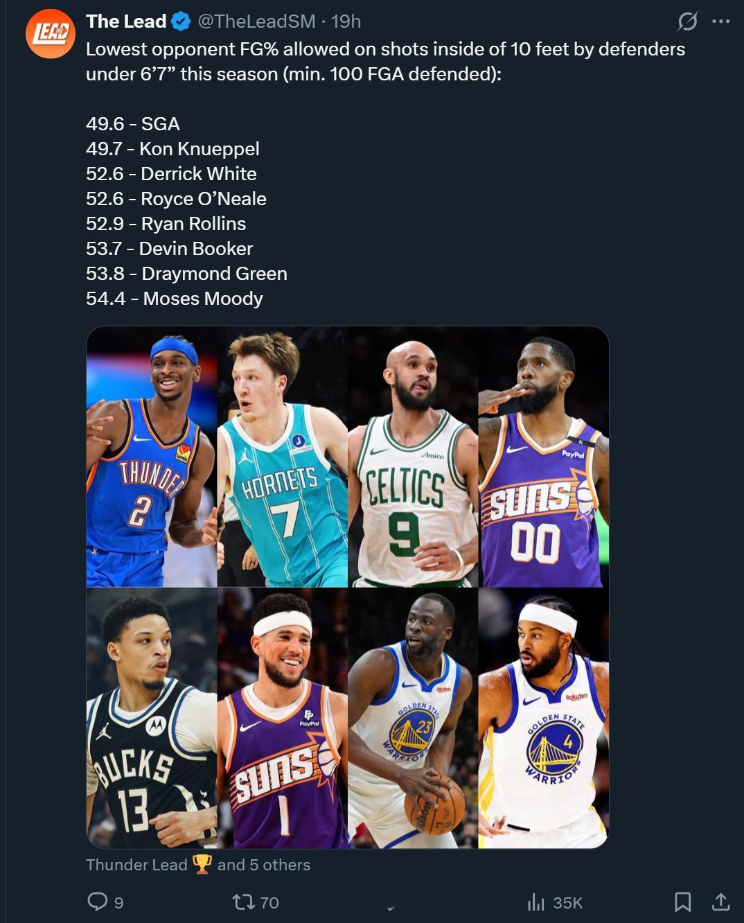 本赛季身高6尺7寸(约2米01)以下球员中,对10英尺内投篮的防守最佳表现(至少防守100次出手):亚历山大49.6%排名第一,第二是黄蜂新秀克努佩尔,随即是德里克·怀特和罗伊斯·奥尼尔。编辑by蓝色狂潮OKC雷霆14连胜雷霆vs爵士雷霆