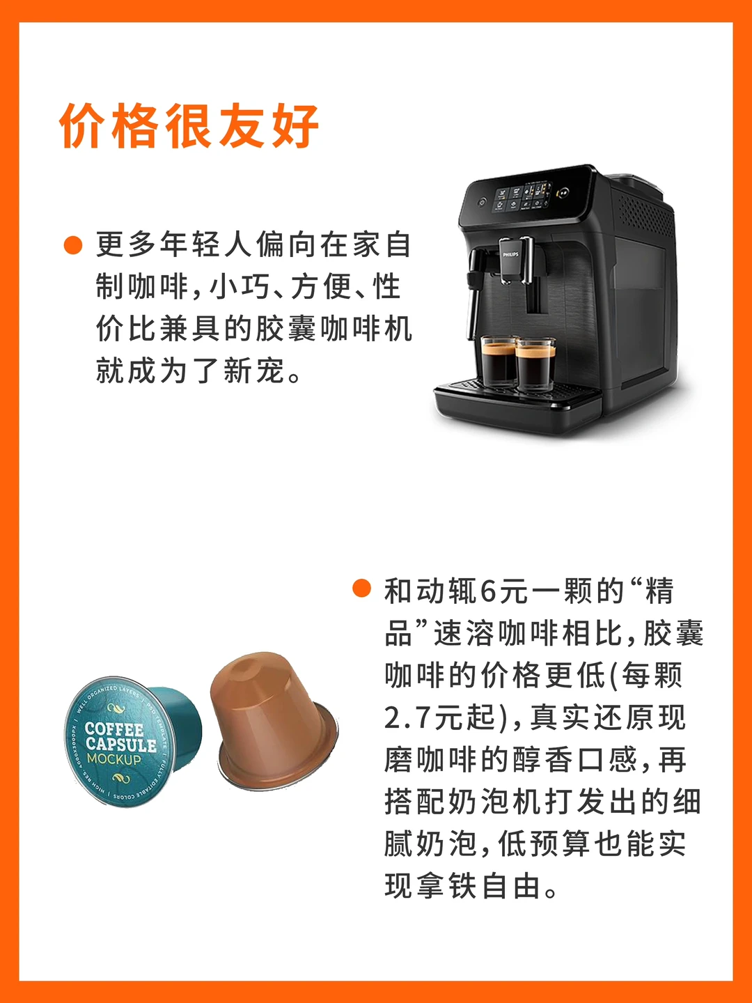 👉和动辄6元一颗的“精品”速溶咖啡相比,胶囊咖啡的价格更低(每颗2.7元起),真实还原现磨咖啡的醇香口感,再搭配奶泡机打发出的细腻奶泡,低预算也能实现拿铁自由🥤