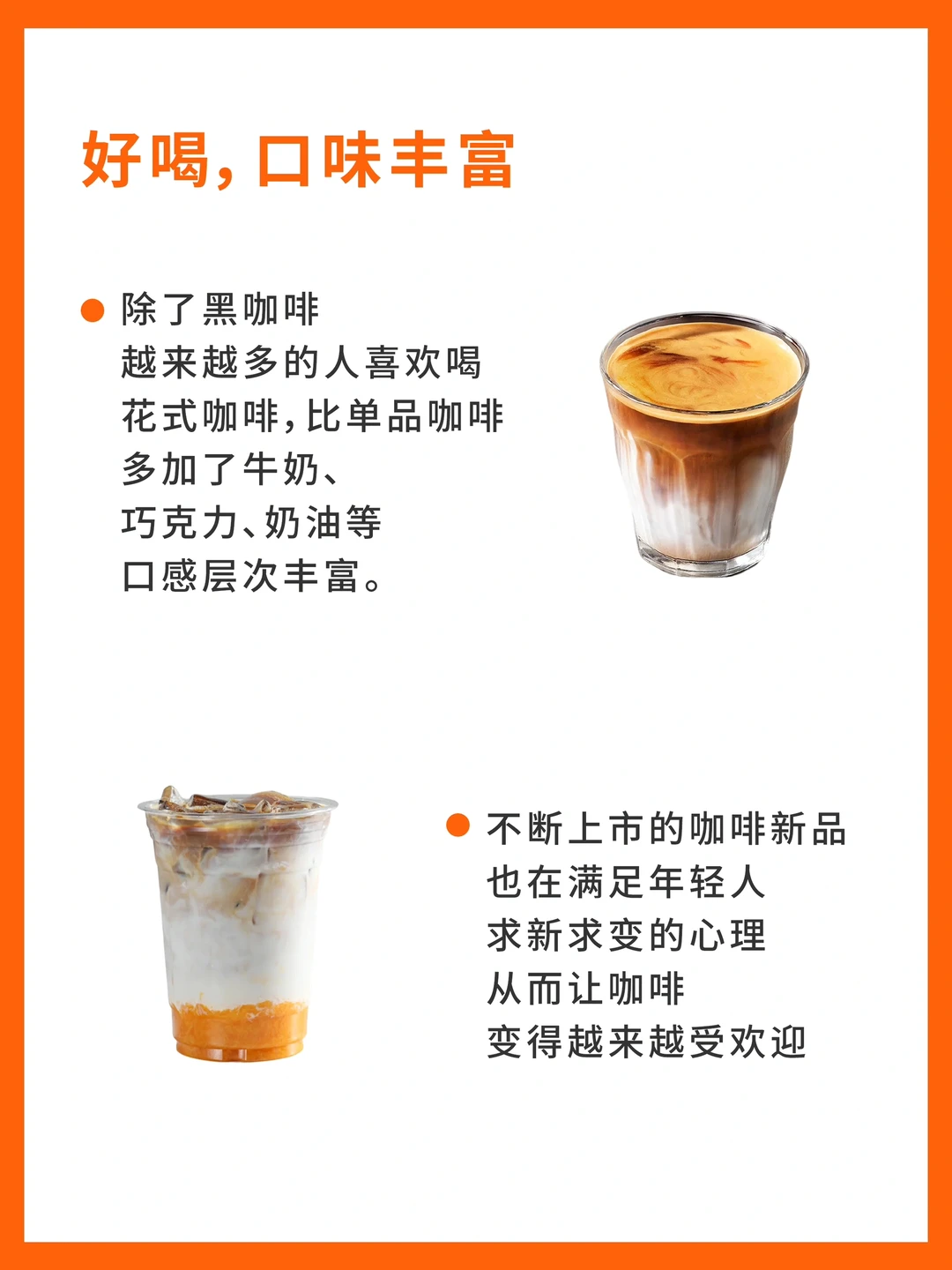 如今越来越多的人喜欢喝花式咖啡,当意式浓缩和牛奶🥛、糖浆🍯或苏打水组CP,咖啡的苦涩味减淡,符合更多人的口味;各大咖啡馆也在不断”内卷”,推出荔枝、椰汁、芒果等风味的季节性单品🌿,从而让咖啡变得越来越受欢迎