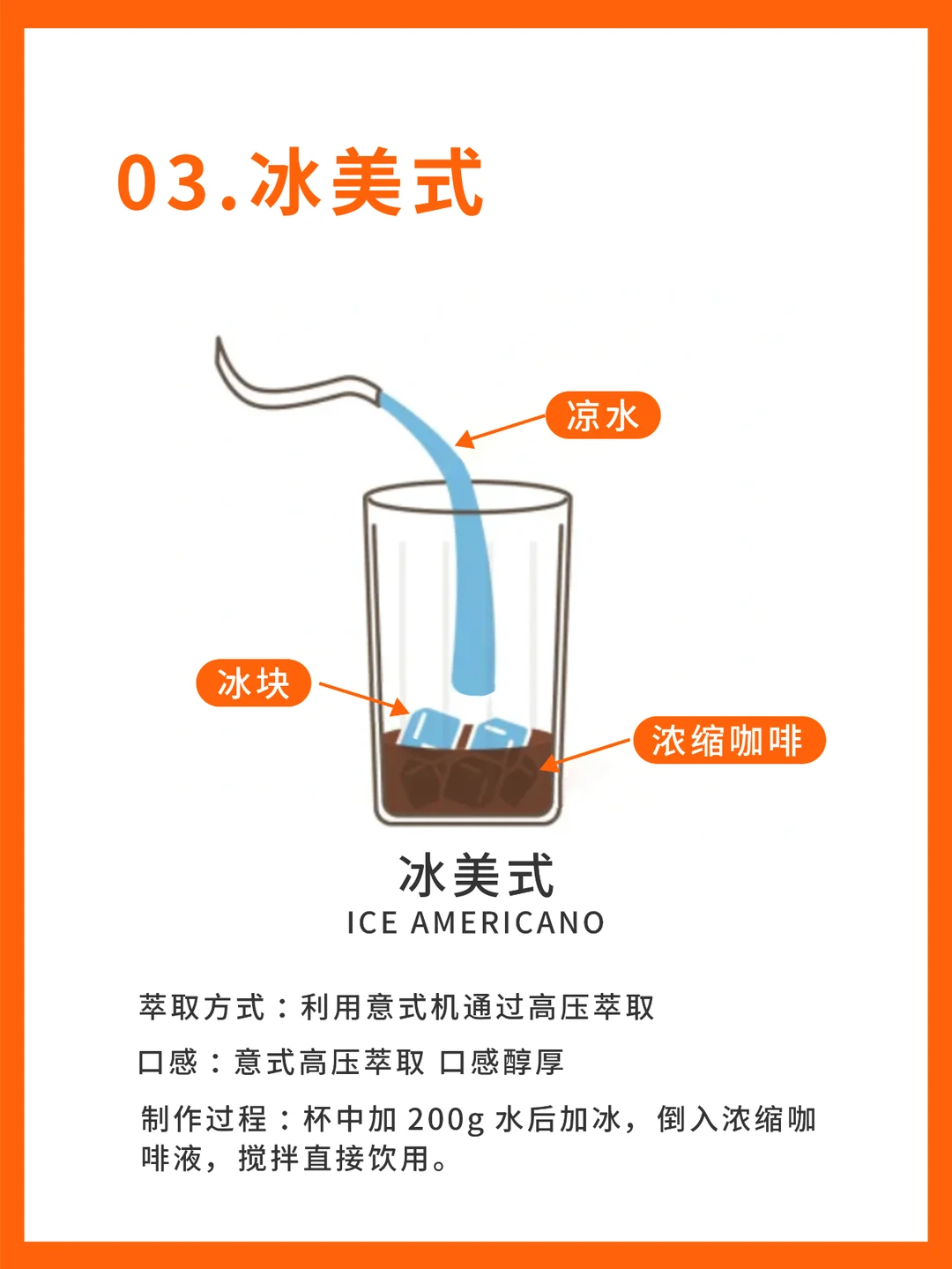 制作过程:杯中加200g水后加冰,倒入浓缩咖啡液,搅拌直接饮用。
