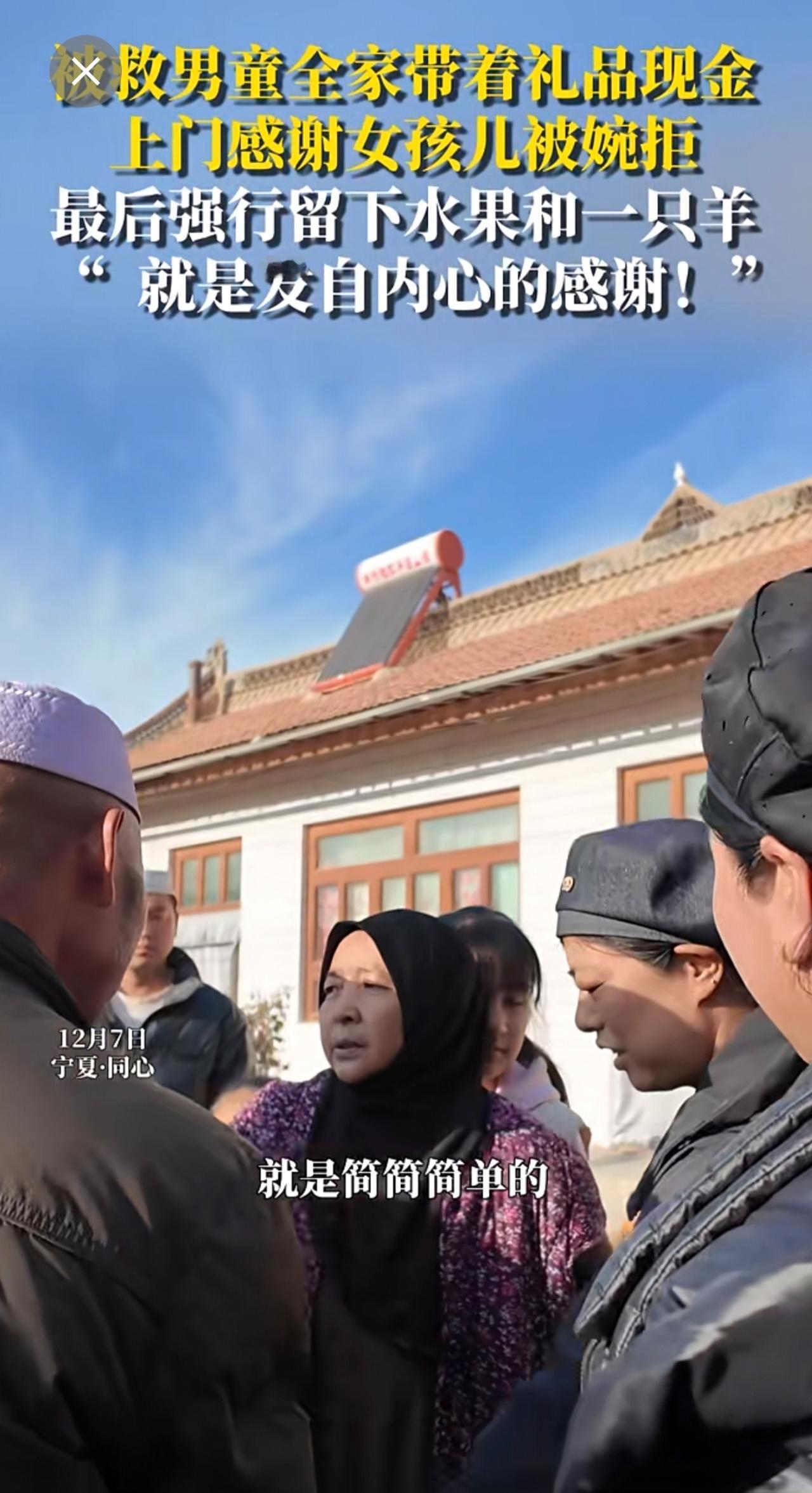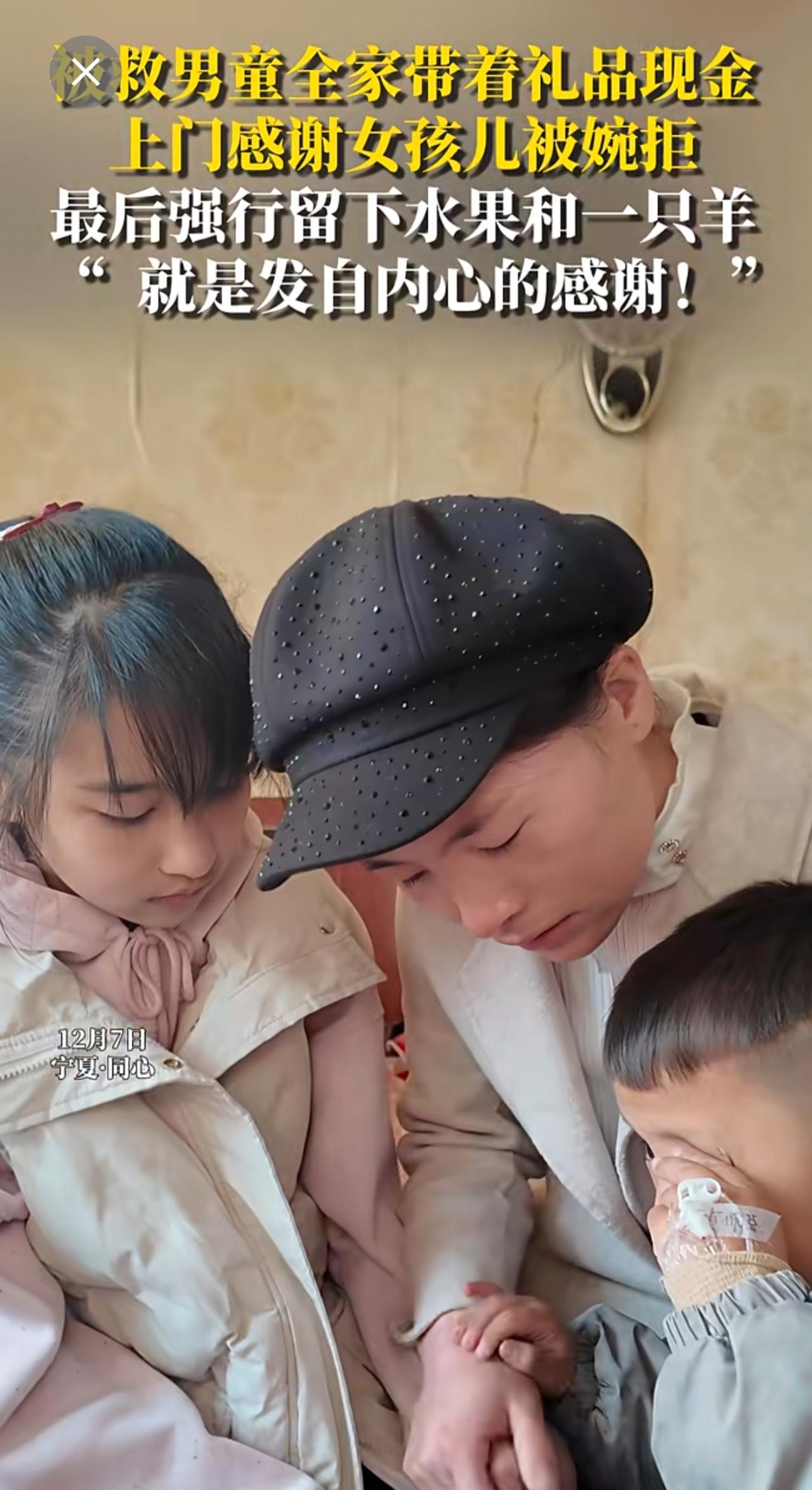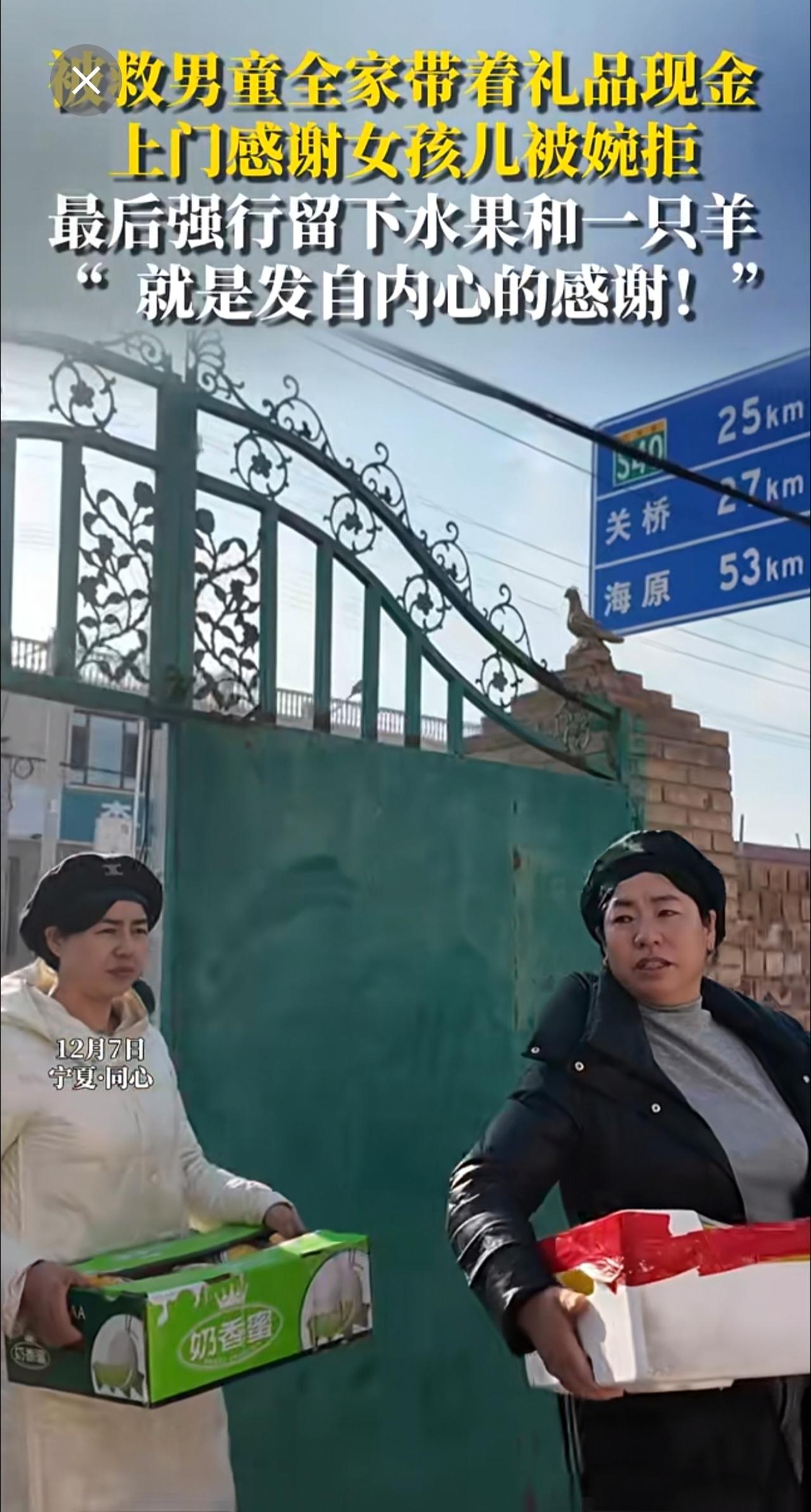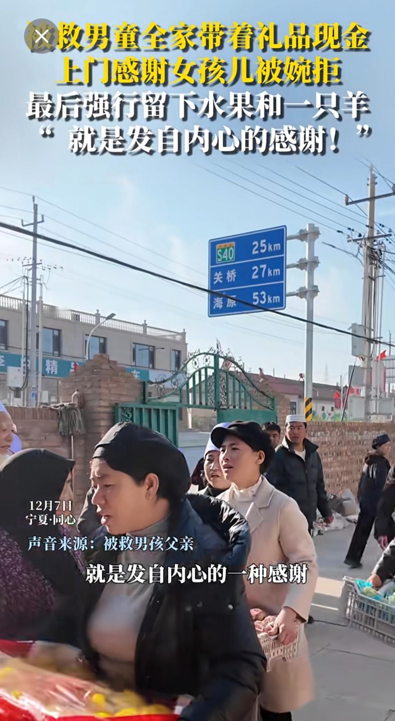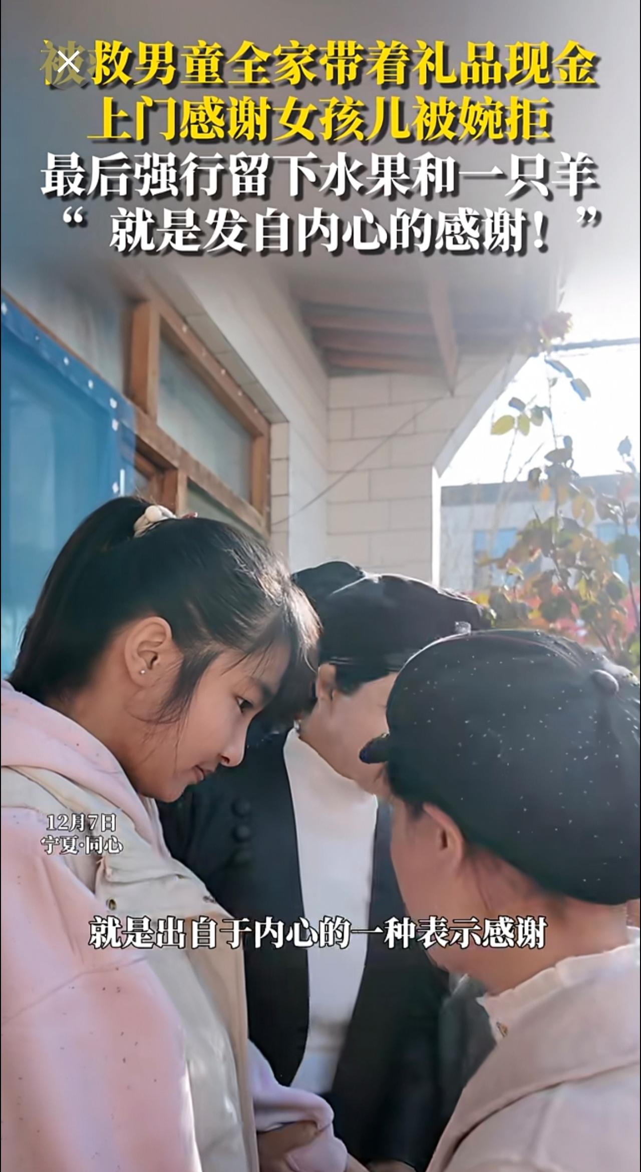 12月7日,宁夏同心,掉入冰窟被救的4岁男童家长,带着水果和羊羔肉来到了救人女孩儿李佳婷的家中感谢。当男童家长拿出现金表示感谢时,遭到女孩儿家长婉拒。最后男童家长强行留下水果和羊肉,感谢李佳婷的救命之恩。男童父亲说:就是出自于内心的一种感谢。花儿向阳开 宁夏冰窟救童小姑娘找到了