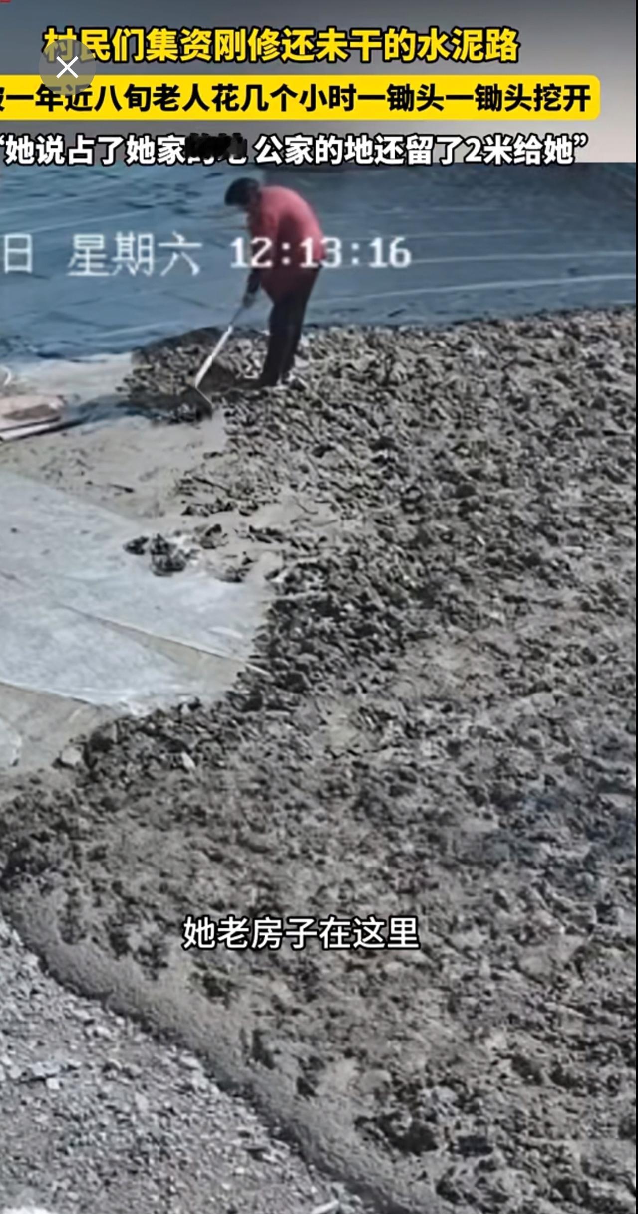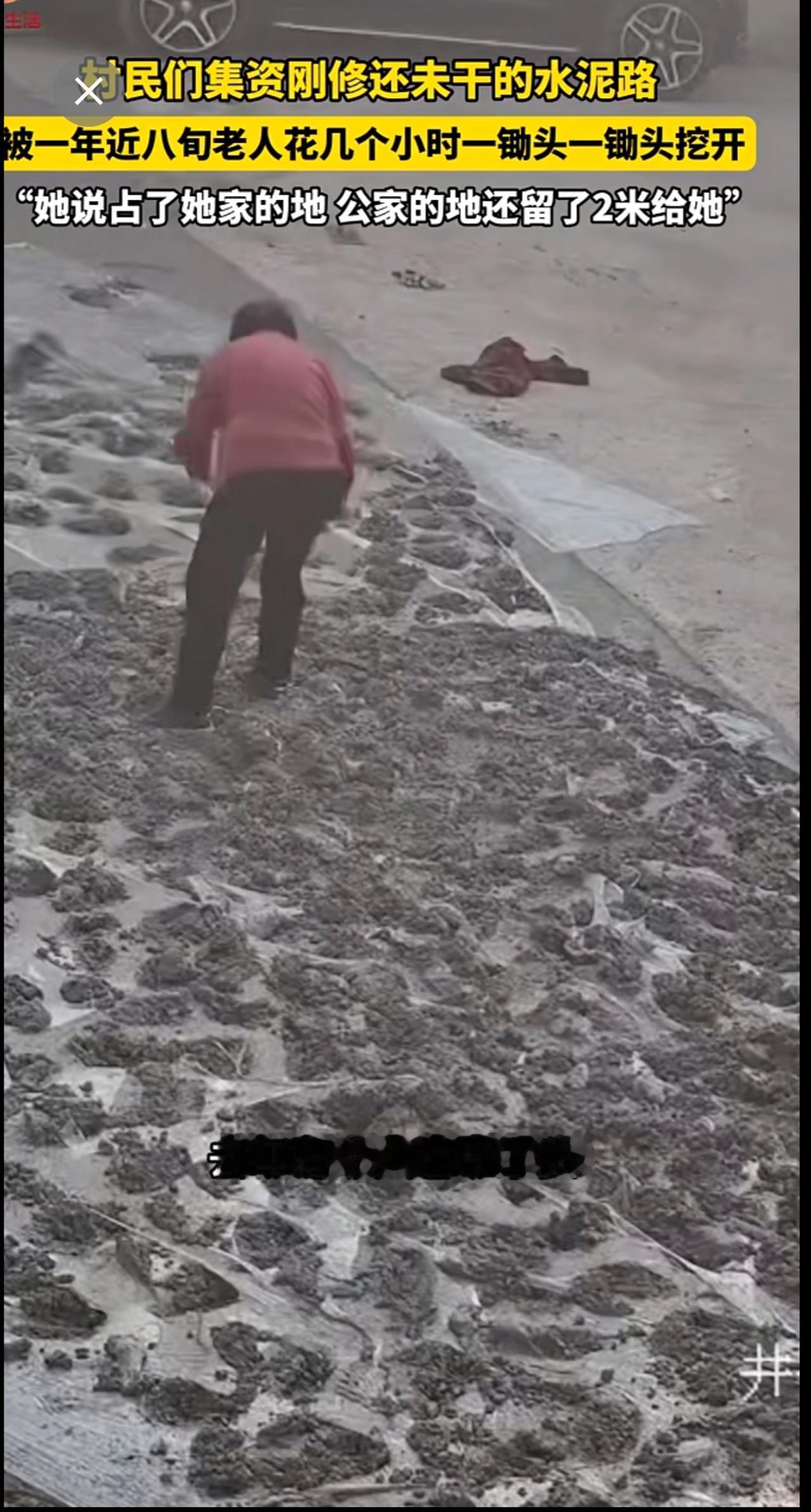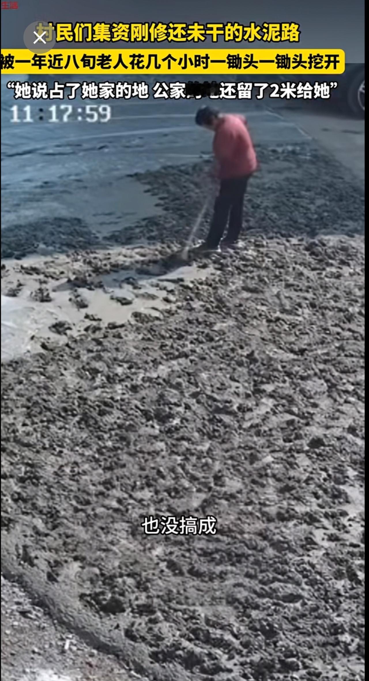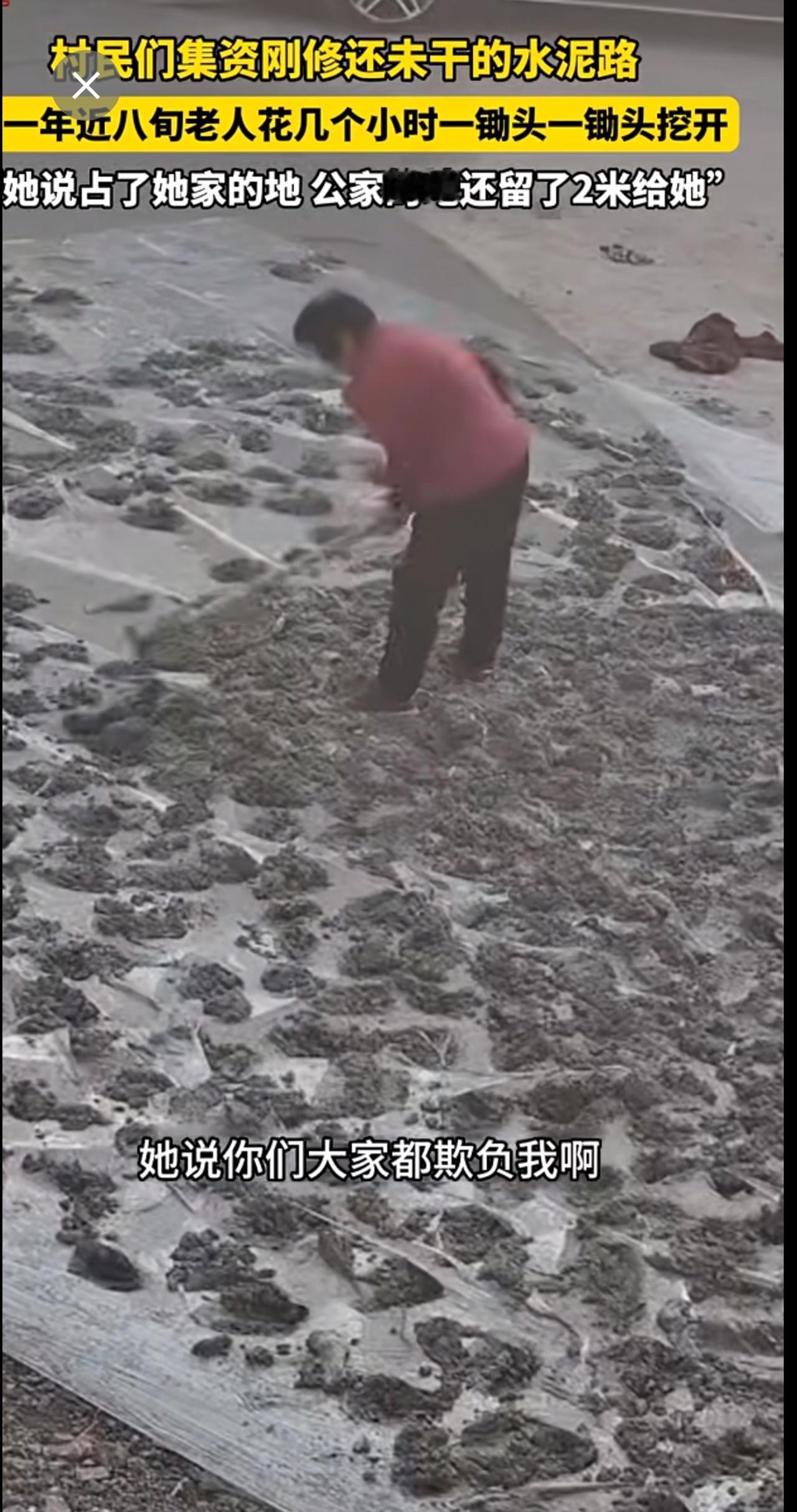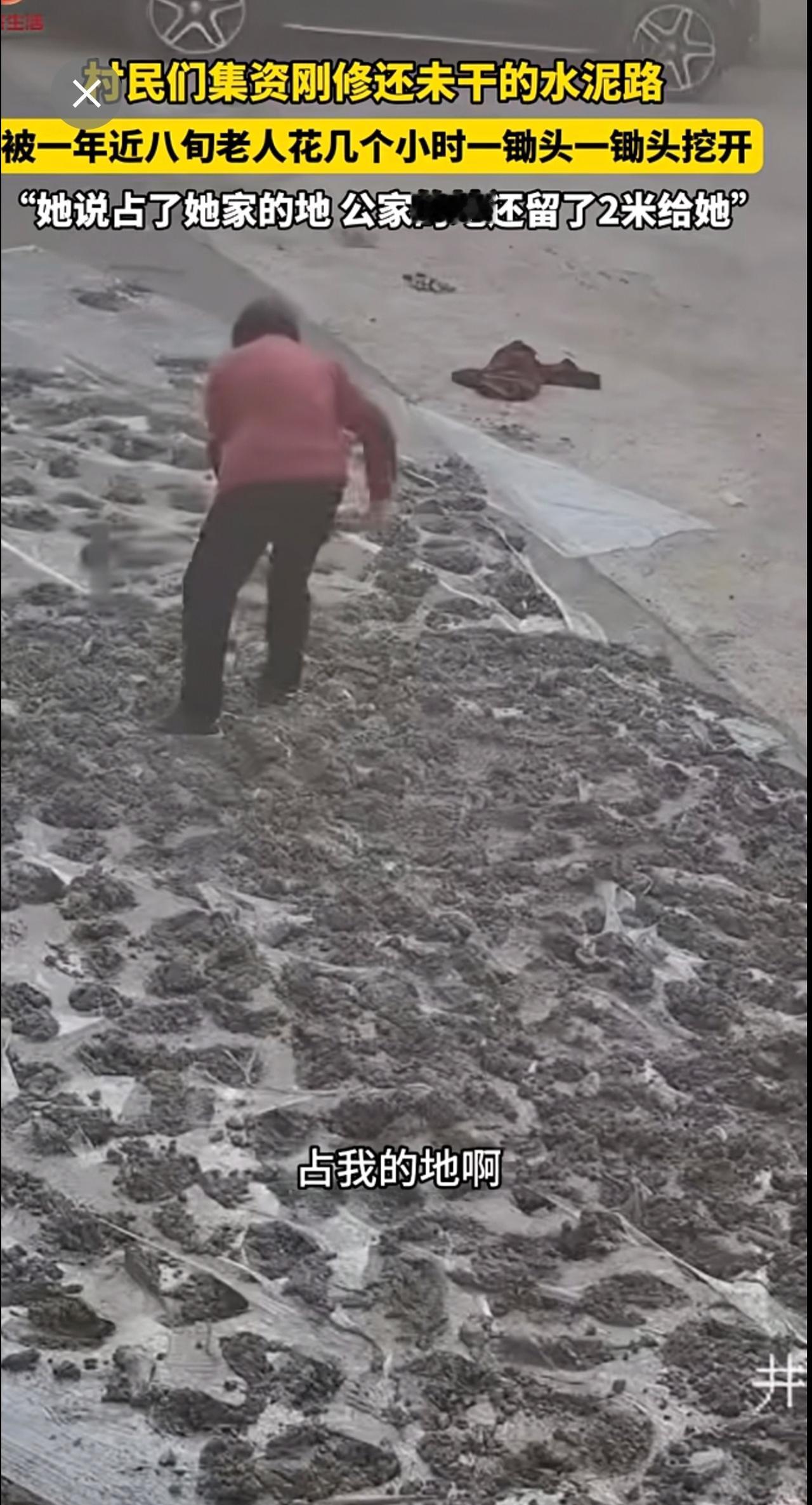 村民们集资刚修的,还未干的水泥路,被一年近八旬老人一锄头一锄头挖开。“她说占了她家的地 公家的地还留了2米给她”。