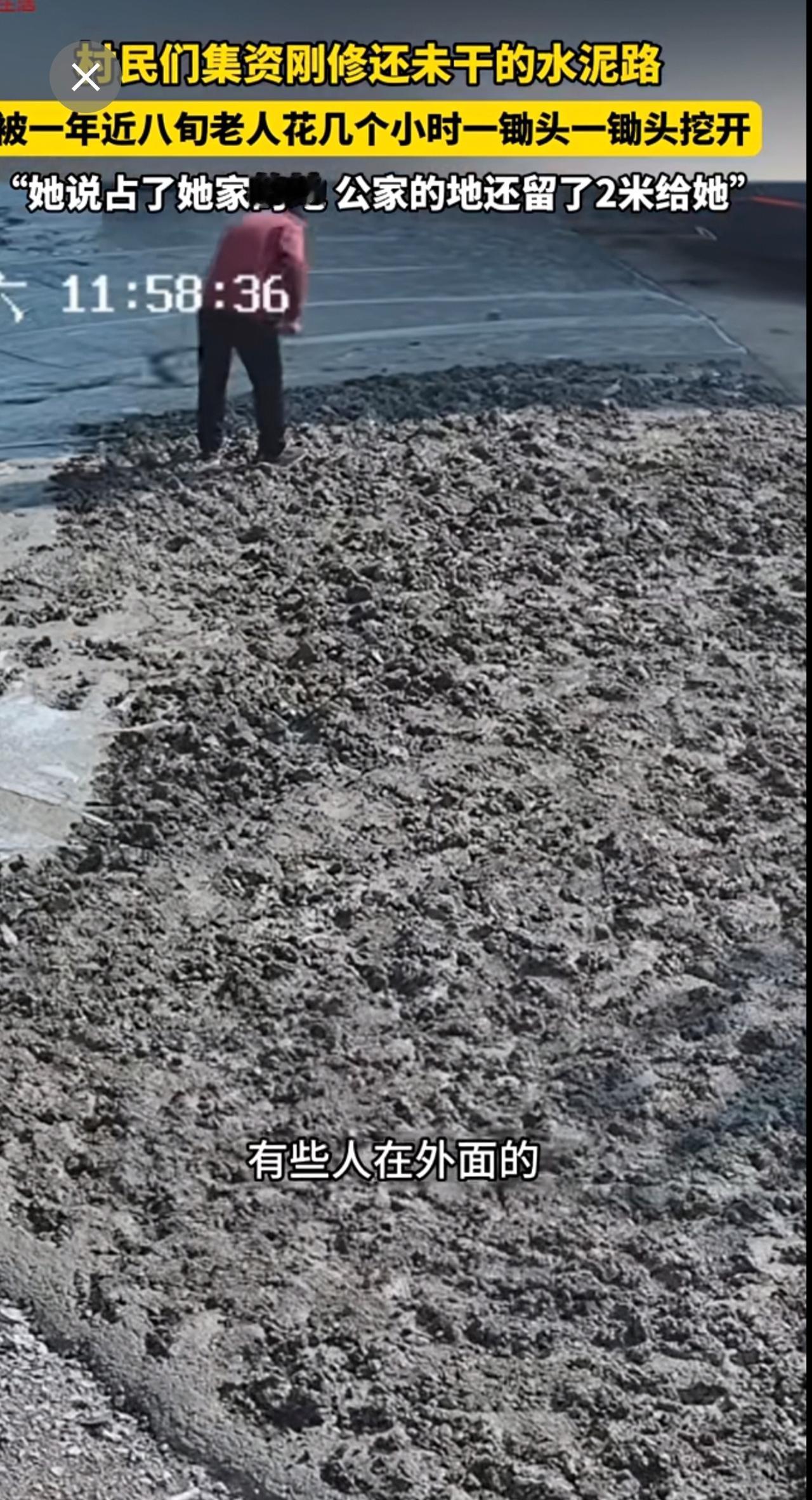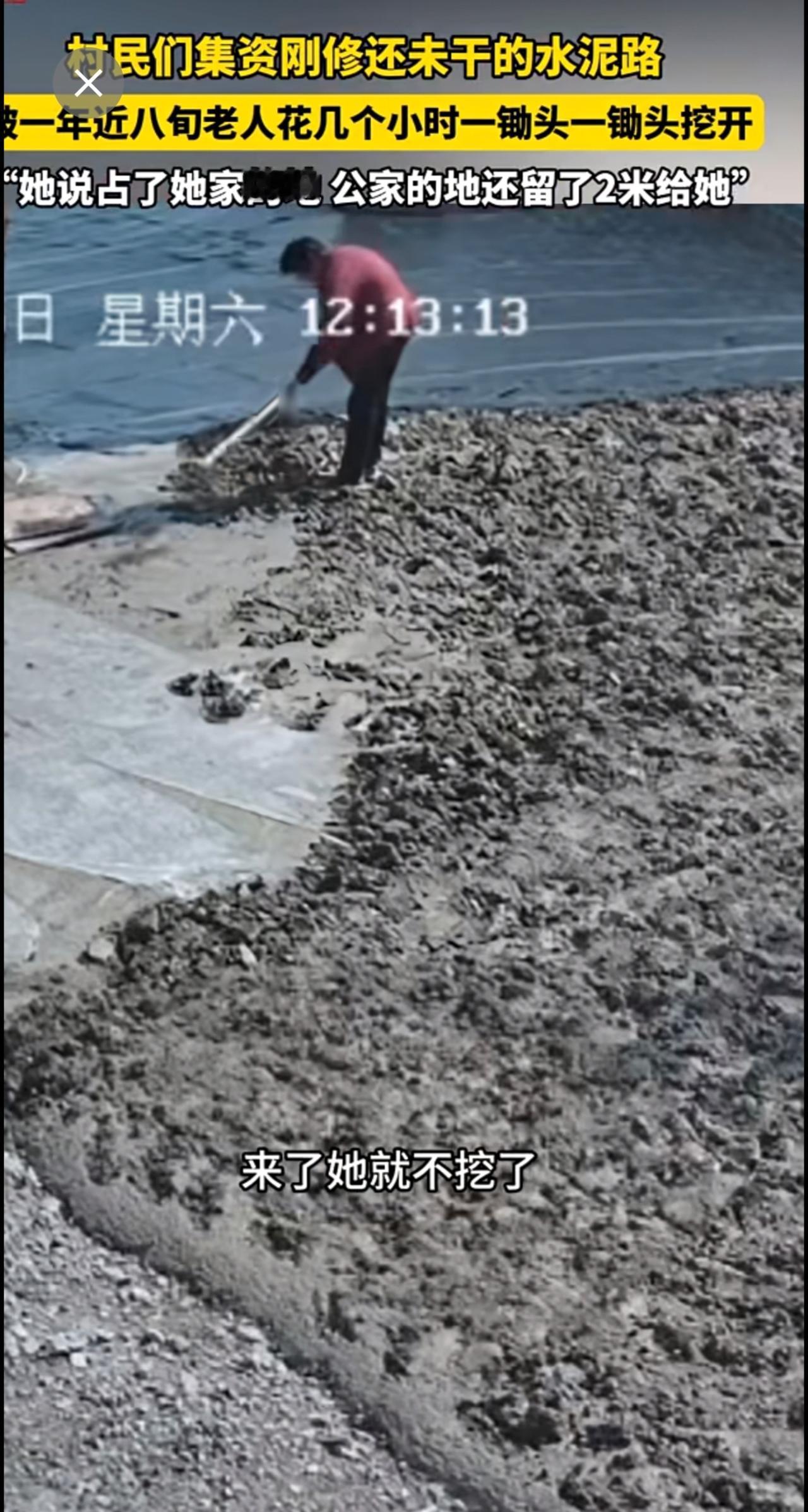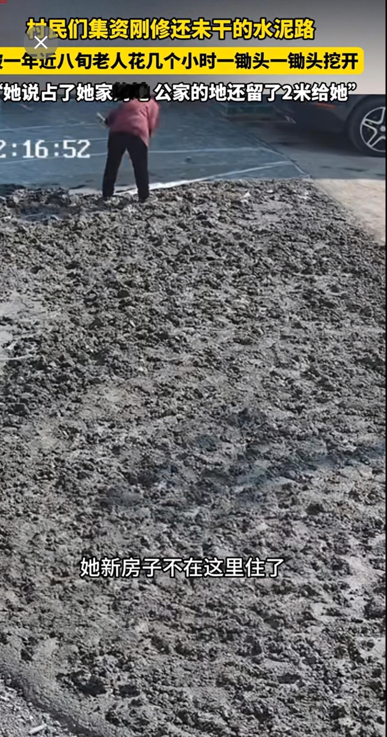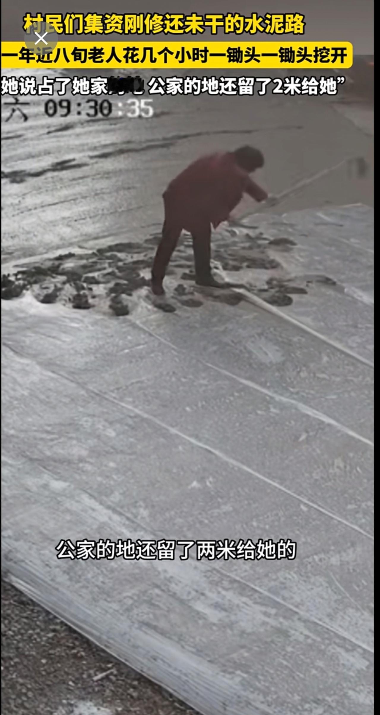 村民们集资刚修的,还未干的水泥路,被一年近八旬老人一锄头一锄头挖开。“她说占了她家的地 公家的地还留了2米给她”。