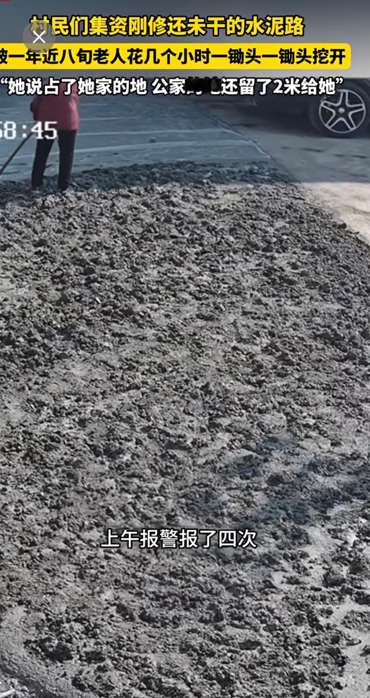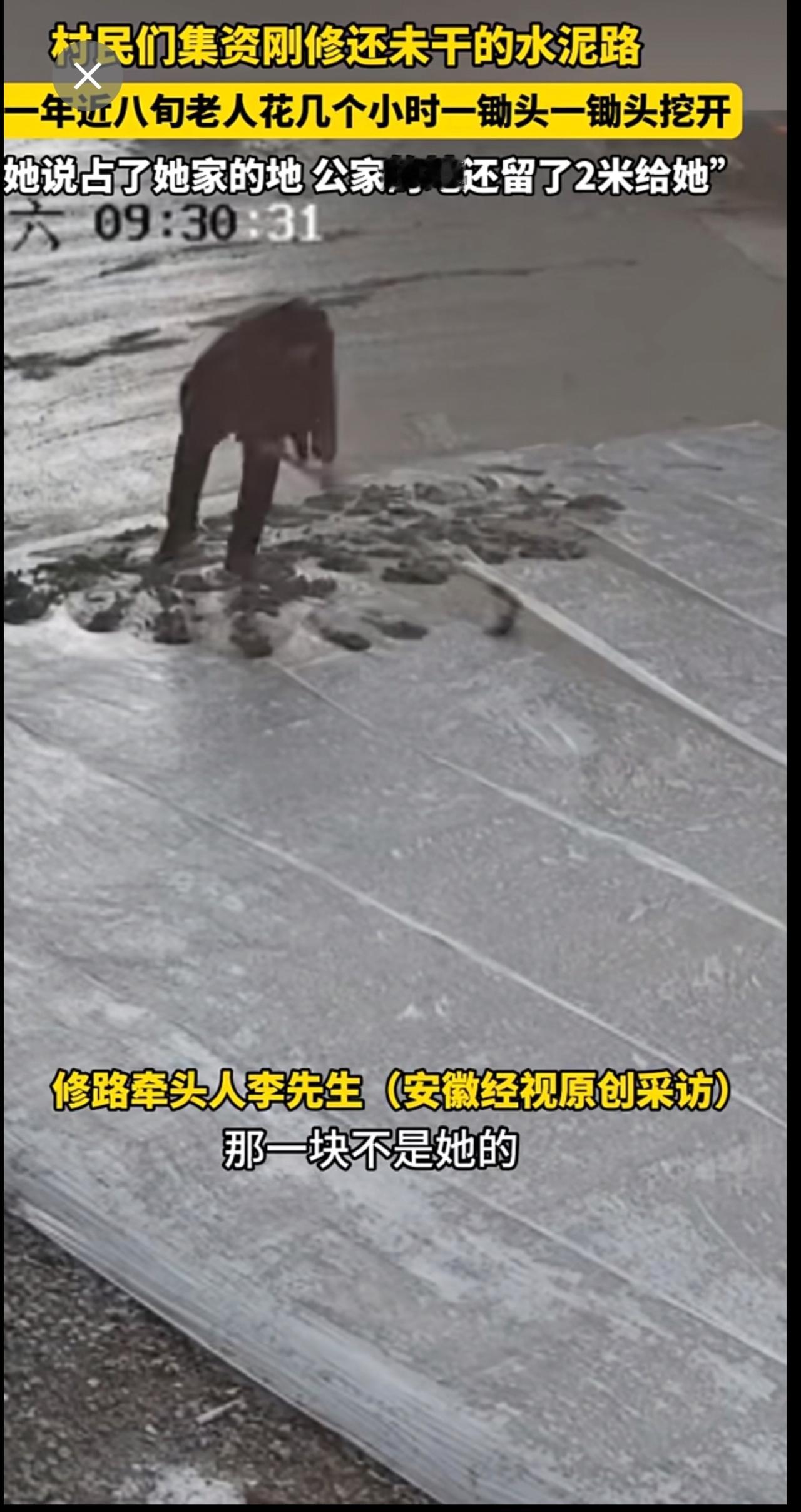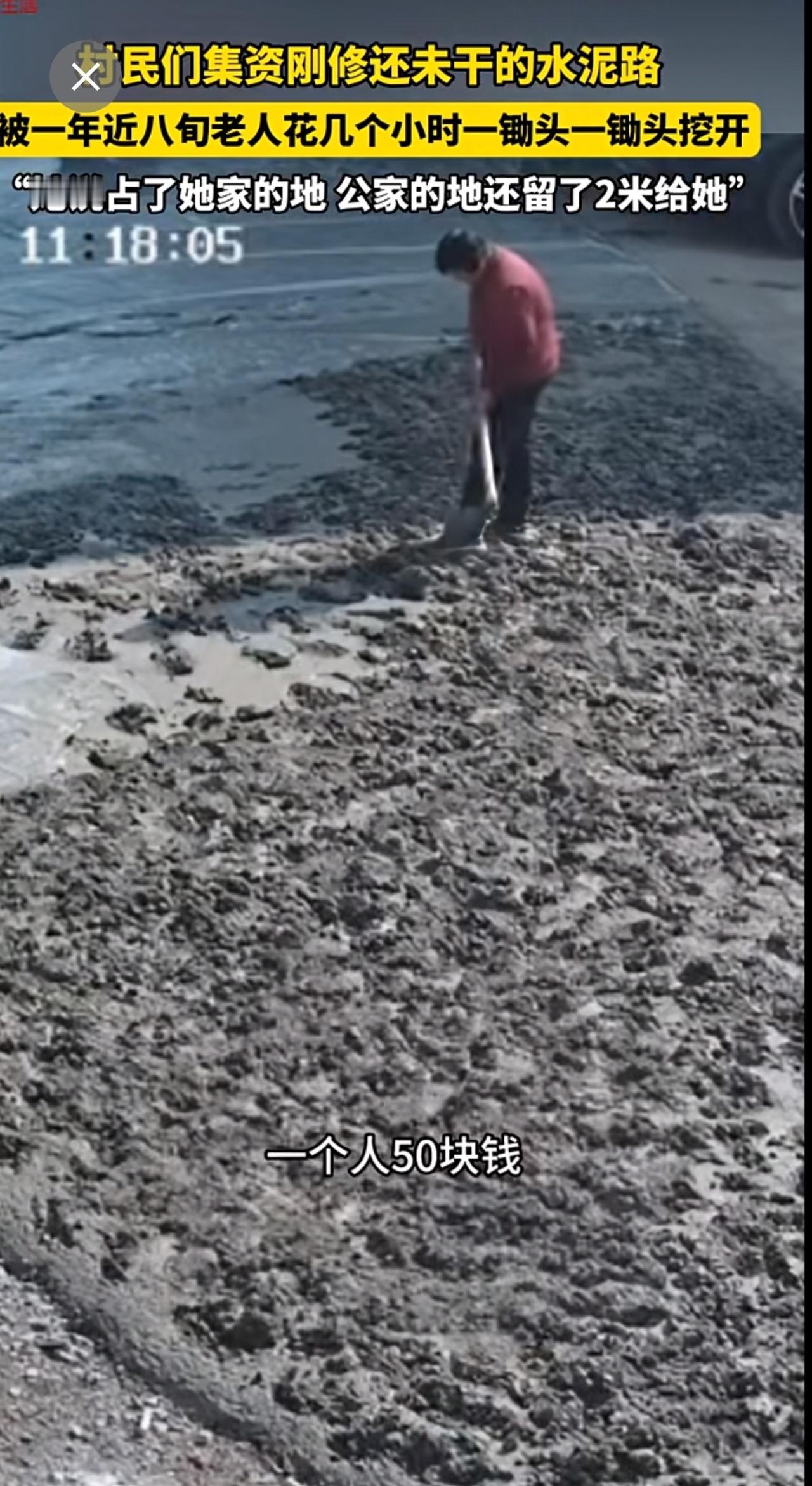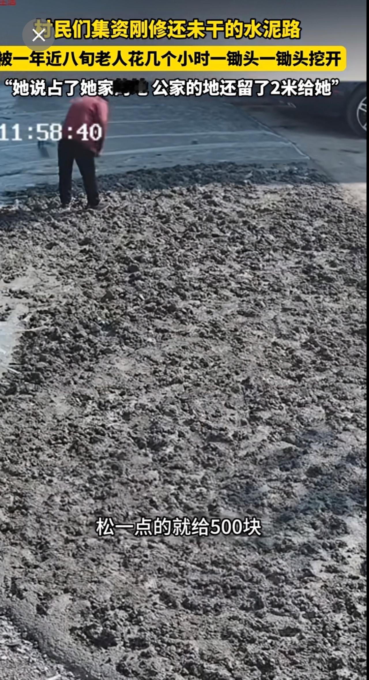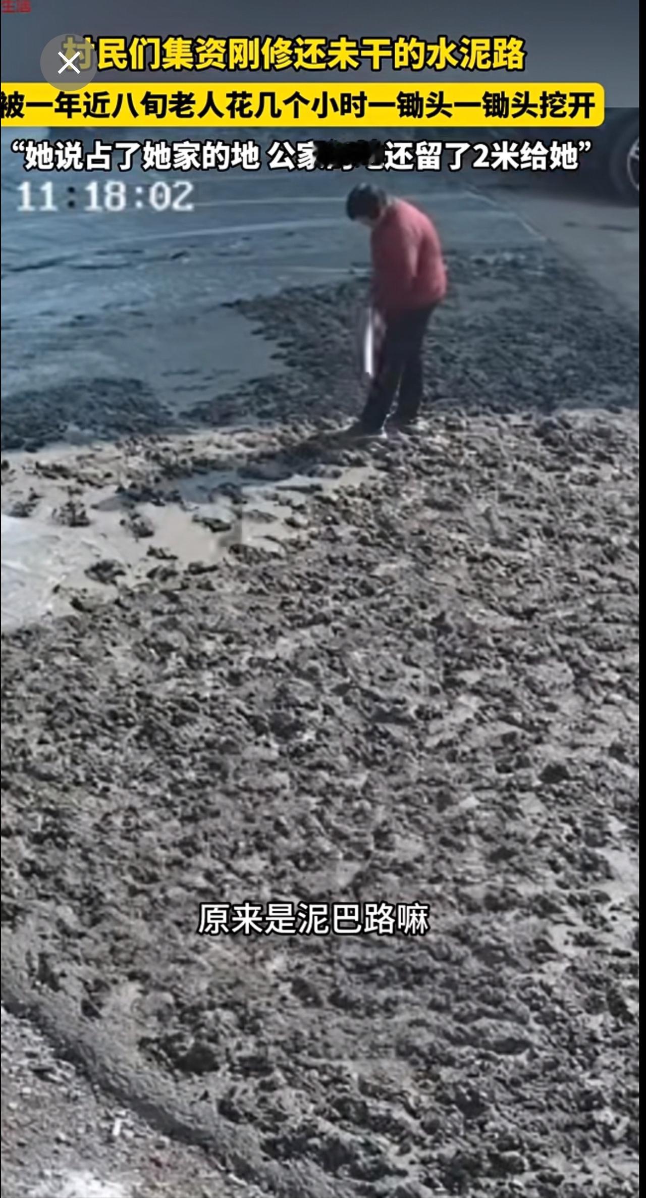 村民们集资刚修的,还未干的水泥路,被一年近八旬老人一锄头一锄头挖开。“她说占了她家的地 公家的地还留了2米给她”。