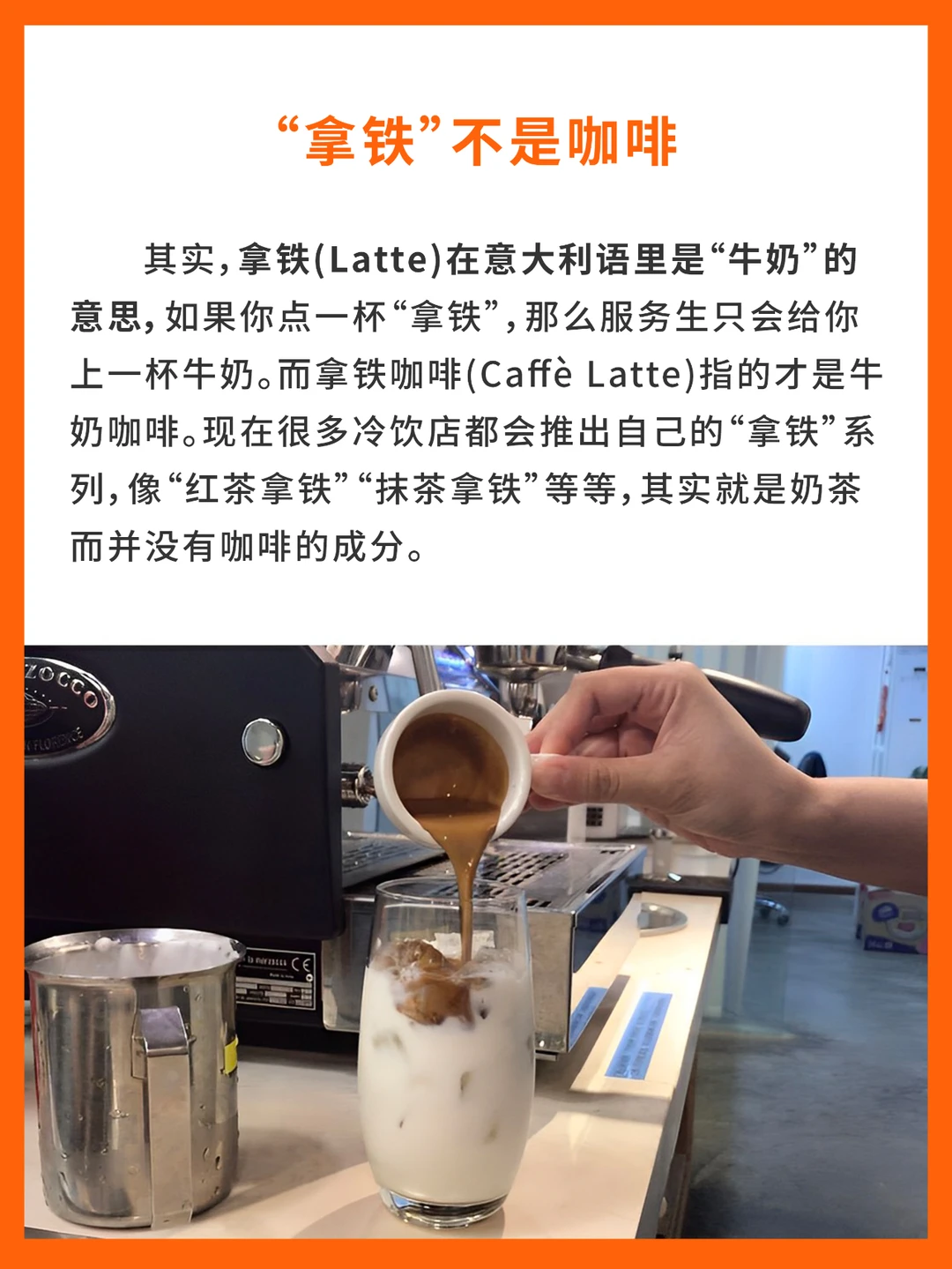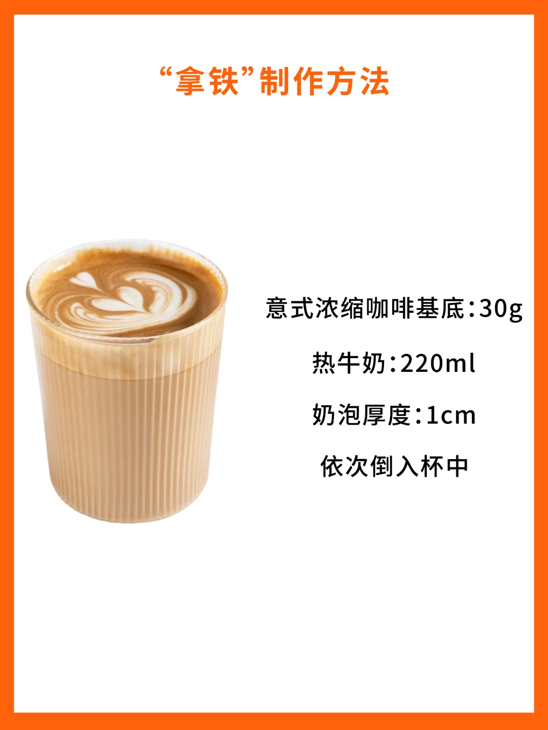 - 其实,拿铁(Latte)在意大利语里是“牛奶”的意思,如果你点一杯“拿铁”,那么服务生只会给你上一杯牛奶。而拿铁咖啡(Caffe Latte)指的才是牛奶咖啡。现在很多冷饮店都会推出自己的“拿铁”系列,像“红茶拿铁”“抹茶拿铁”等等,其实就是奶茶而并没有咖啡的成分。 - 拿铁(Latte coffee) 起源意大利 奶泡适中 口感绵密顺滑 牛奶风味突出 Espresso意式浓缩咖啡基底 - “拿铁”制作方法: 意式浓缩咖啡基底:30g 热牛奶:220ml 奶泡厚度:1cm 依次倒入杯中