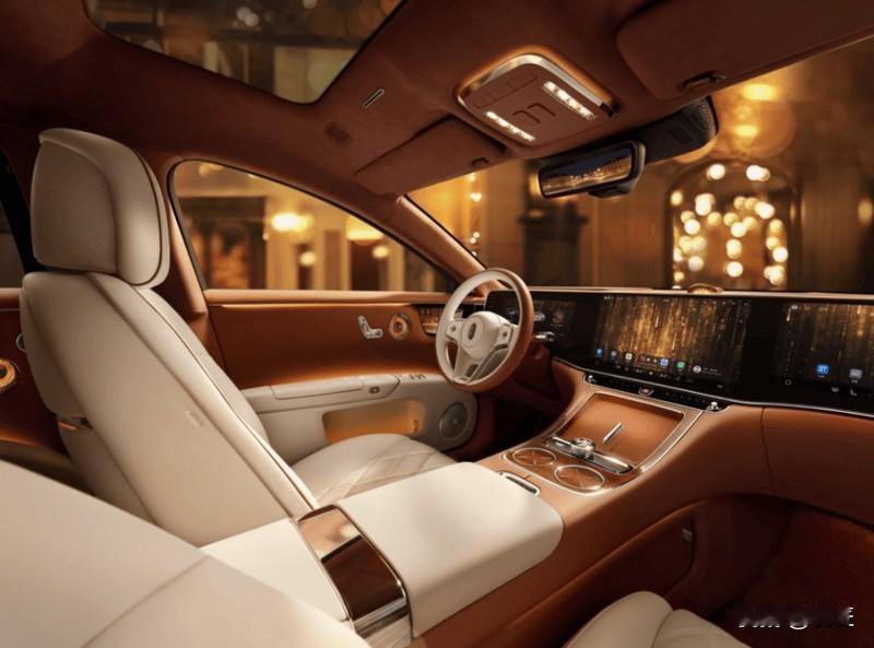 三联屏环抱座舱 + 双零重力座椅 + 水晶星环灯,把“科技豪华”四个字写进了每一寸细节。 前排:六屏联动的“太空舱”, 尊界S800的前排用一整块1.45 m超宽一体环宇屏把液晶仪表、中控、副驾娱乐屏无缝融合,再配两侧流媒体后视镜屏与HUD,实现六屏联动。怀挡设计让中央扶手区完全解放,双50 W无线充、冷暖杯托、水晶旋钮一字排开,像把头等舱搬进车里。 材质:可触可闻的“顶奢”, 进口头层小牛皮:全粒面半苯胺工艺,保留天然纹理,触感细腻。 连续木纹实木:西伯利亚椴木/北美胡桃木,对纹拼接,一块饰板纹路不断。 珠宝级水晶:中控旋钮、座椅按键经千次切割打磨,折射星芒。 金属镀铬:连应急门把手都镜面抛光,冷冽质感与温润皮革对撞。 后排:移动“私人影院”, 3370 mm轴距让四座版直接放上双零重力座椅 ,148.5°最大躺角,700 ms内自动调姿防撞。40英寸吸顶幕布沿B柱滑轨降下,搭配HUAWEI SOUND 43扬声器 2920 W,秒变7.5.10环绕声影院。 氛围:1680万色的“情绪灯光师” 车顶劳斯莱斯同款星空顶用光纤编织1785颗微光源,随车门开启流动闪烁;1680万色氛围灯藏在门板、地毯、抽屉,支持手势调光+智能追光,阅读、取物自动补光。 彩蛋:把“宇宙”装进细节, 摘星门把手:手伸即亮,仿佛握住一颗星。 日月同行轮毂:静止时如月,行驶时似日。 指纹密码箱:中央扶手内置,一键弹开。 冷暖杯托+压缩机冰箱:香槟、雪茄随时待命。