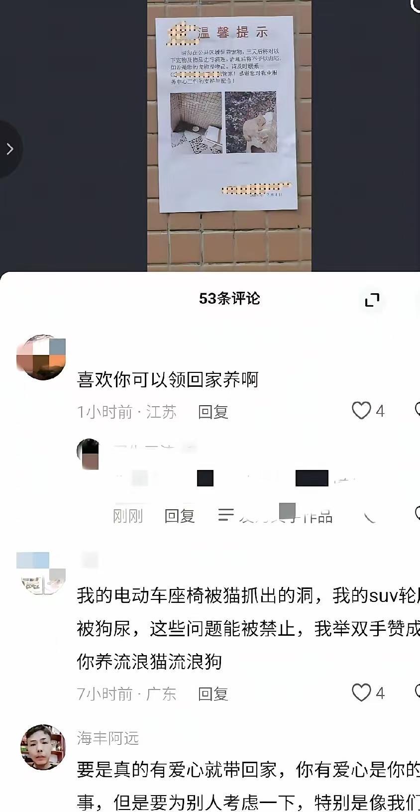 一个物业贴布告不让投喂流浪猫,说三天后会对宠物物品进行清理。物业你以为你是谁啊,你没有权力阻止喂养小动物,你这是违法的这是想斩尽杀绝,一个不文明的物业。 物业召开业主大会了吗?如果大部分业主同意的情况下,按无害化流程处理流浪猫狗确实是合理的。 好人与坏人的区别就是善与恶的对比!有些人,自己吃饱了,就见不得别的小动物活着,这种人下辈子就是流浪动物!因果有轮回的。 你们那么爱,都抓回去养不好吗?它们不用外面挨饿,不用怕被人清理。又能立人设,一举多得,为何不做。 投喂流浪猫是一种善良的行为,体现了居民的爱心,毫无人性。 做人善良,善待动物是社会进步的表现。人切不可恃强凌弱,做个好人吧! 猫也是一条生命,为什么它们没有权利生存在大自然间?