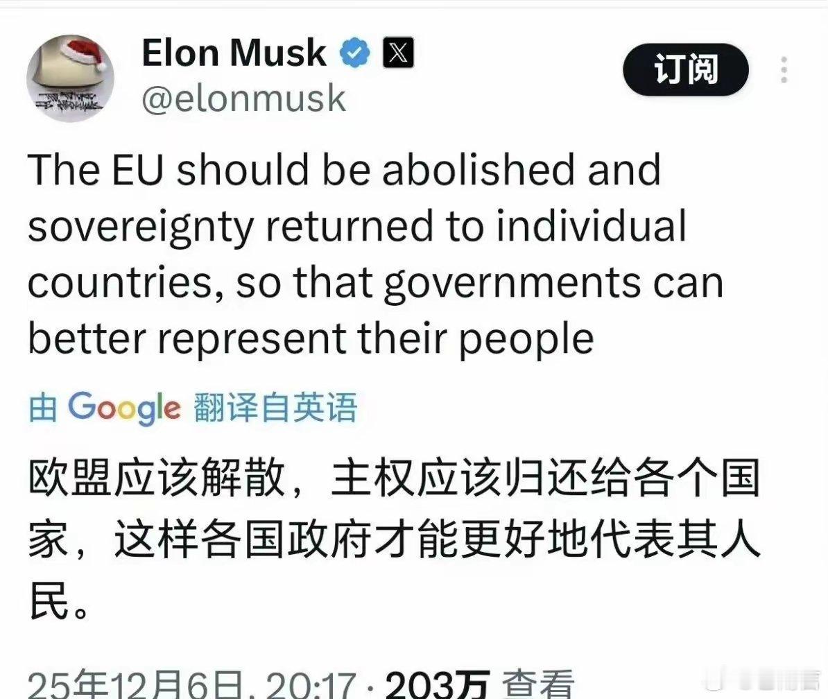 马斯克呼吁欧盟解散12月6日,马斯克在社交媒体平台发文称,“欧盟应该解散,主权应该归还给各个国家,这样各国政府才能更好地代表其人民”。马斯克这番发言的背景是马斯克才被欧盟处以1.2亿欧元的罚款,可见马斯克此言颇有发牢骚之嫌。然而,马斯克的言论不能单纯看作“发牢骚”,而暴露了许多跨国大企业的真心话。如果欧洲是一盘散沙,那么面对跨国大企业的垄断,小国将毫无招架之力。欧洲互联网产业至今不发达,正是因为缺乏统一的庞大市场,对马斯克的罚款已经是一种无奈的反击行为。体量就是力量,体量就是潜能,不止是欧洲,所有国家都需要庞大的体量自保和发展,无论是经济上还是军事上。大国拥有体量优势,不仅有实现内循环、抵御外来经济压制的底气,更有自主发展新兴产业的条件。而对于小国而言,既然已经面临先天不足的窘境,只好选择如“组建欧盟”般“抱团取暖”的道路。团结就是力量,众人拾柴火焰高,这早已各国有识之士的共识,而小国的团结、某些大国的巨大体量,正是跨国大企业垄断之路的巨大绊脚石。