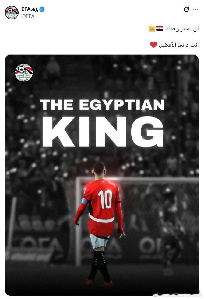 埃及足协发文力挺萨拉赫,官方晒出一张以他为主角的海报——埃及国王配文:“你永远不会独行 👑 你永远是最出色的 ❤️”利兹联3比3利物浦