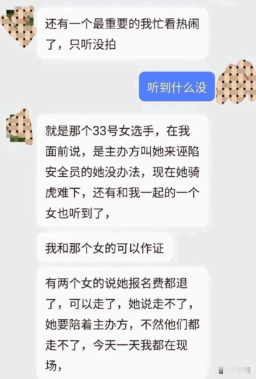 反转了?有知情人透露,说安全员摸她手的33号女选手是主办方内部的人,为了防止奖金落入其他选手手里,主办方安排了内部的人参加比赛,偷偷的送一些物资给他们,让他们顺利进入决赛,然后奖金落入主办方手里。 因为偷偷送物资的事情被其他选手发现,主办方故意让33号选手说安全员摸她的手,把事情闹大,然后停止比赛。 事情的真相到底是怎样,我们静待后续。