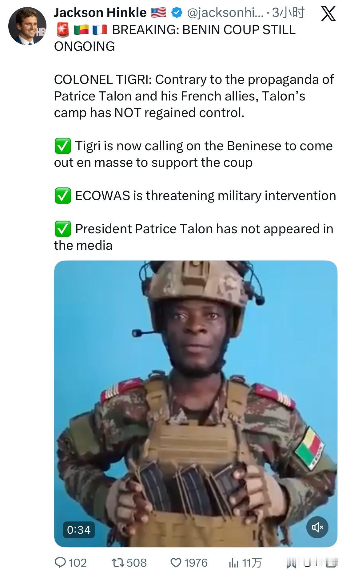 突发新闻:贝宁政变仍在进行中 蒂格里上校:与帕特里斯·塔隆及其法国盟友的宣传相反,塔隆阵营并没有重新控制局势。 ✅蒂格里现在呼吁贝宁民众大规模走上街头支持政变。 ✅西非国家经济共同体正威胁进行军事干预 ✅总统帕特里斯·塔隆没有在媒体上露面。