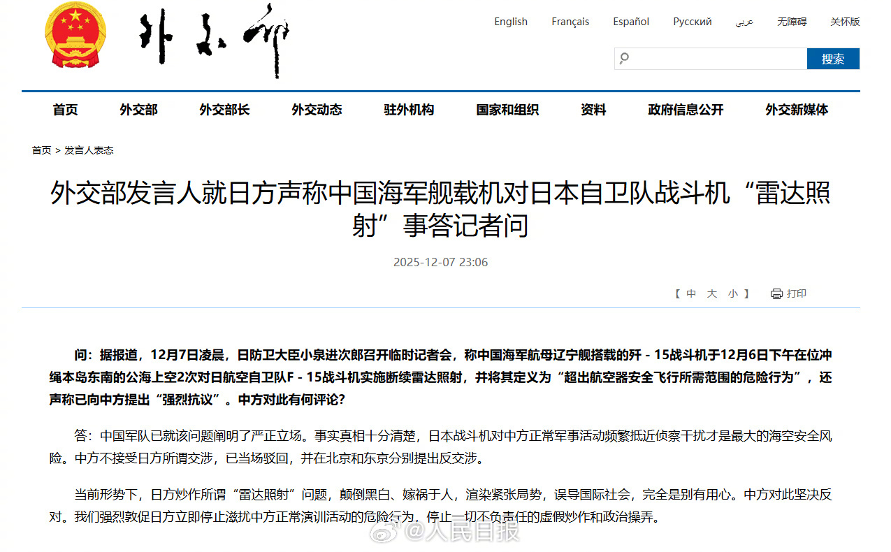 #日方颠倒黑白嫁祸于人别有用心#【#外交部谈日方炒作所谓雷达照射问题#】问:据报道,12月7日凌晨,日防卫大臣小泉进次郎召开临时记者会,称中国海军航母辽宁舰搭载的歼-15战斗机于12月6日下午在位冲绳本岛东南的公海上空2次对日航空自卫队F-15战斗机实施断续雷达照射,并将其定义为“超出航空器安全飞行所需范围的危险行为”,还声称已向中方提出“强烈抗议”。中方对此有何评论?答:中国军队已就该问题阐明了严正立场。事实真相十分清楚,日本战斗机对中方正常军事活动频繁抵近侦察干扰才是最大的海空安全风险。中方不接受日方所谓交涉,已当场驳回,并在北京和东京分别提出反交涉。当前形势下,日方炒作所谓“雷达照射”问题,颠倒黑白、嫁祸于人,渲染紧张局势,误导国际社会,完全是别有用心。中方对此坚决反对。我们强烈敦促日方立即停止滋扰中方正常演训活动的危险行为,停止一切不负责任的虚假炒作和政治操弄。 相关新闻:#中方不接受日方所谓交涉##美防长警告日本#