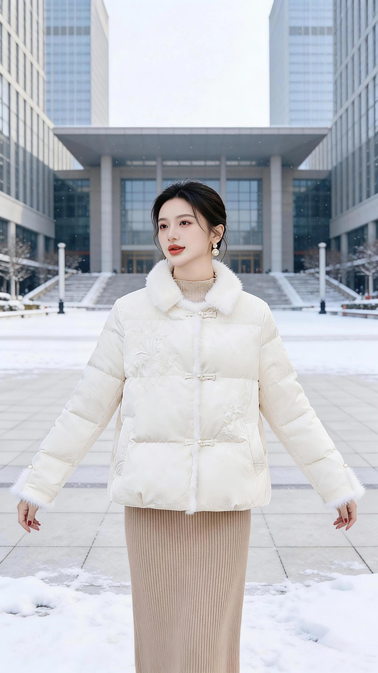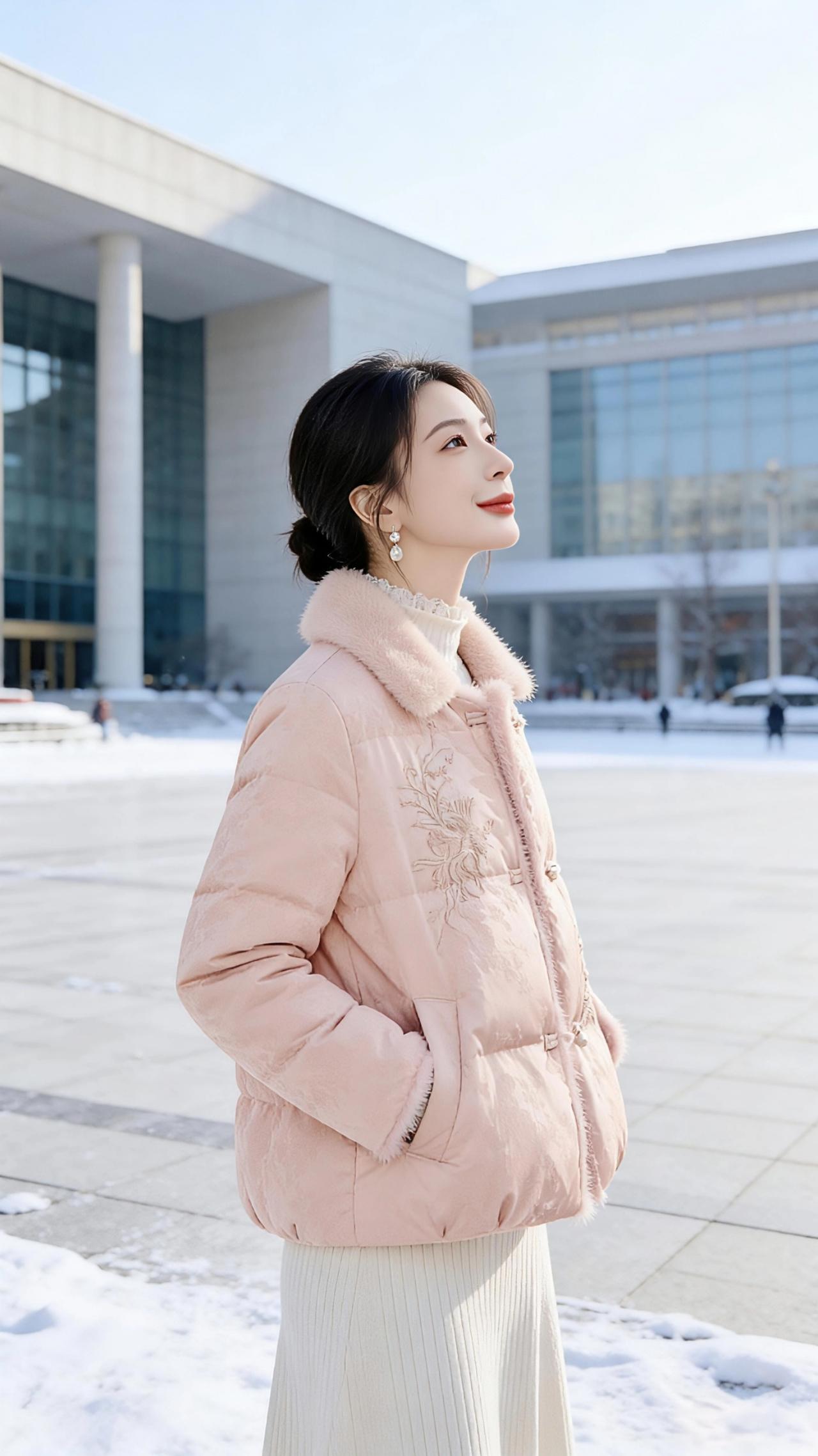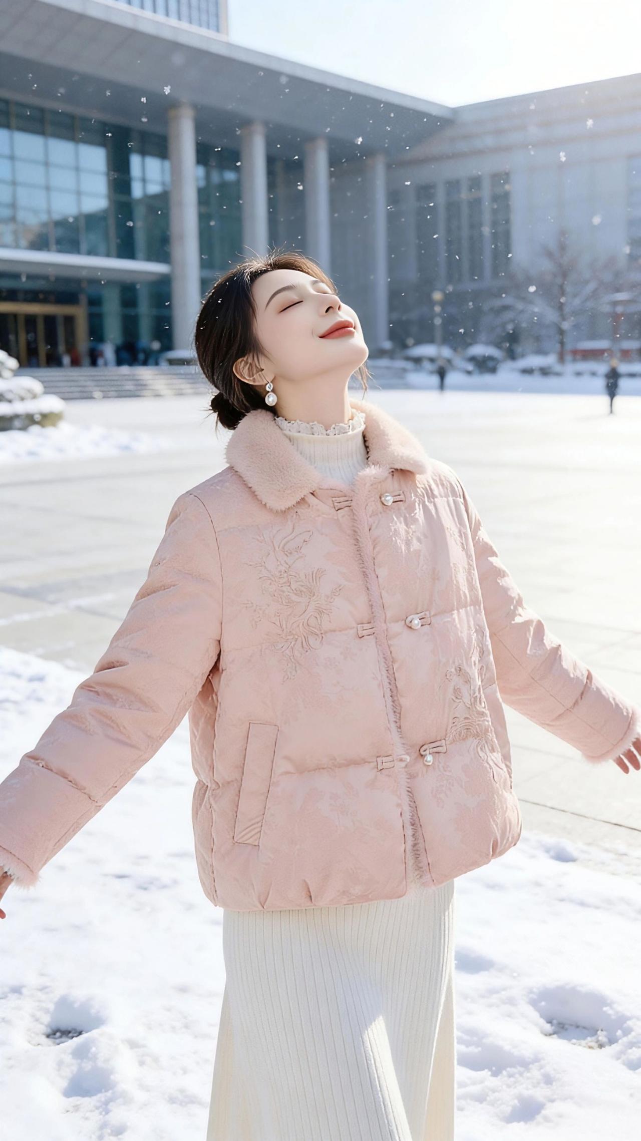 雪落时,她是广场上最轻的一抹颜色。 米白与柔粉的棉服裹着二十岁的轮廓,毛领蹭过颈间时,像接住了半捧碎雪。她抬臂展衣的弧度里,绣纹随光影洇开,是冬日光景里最软的褶皱。指尖碰着盘扣的刹那,雪粒子正擦过发梢——现代建筑的玻璃幕墙上,她的侧影和落雪一起,成了安静的注脚。 有时她垂眸拢紧领口,绒毛蹭着唇瓣,像把整季的温软都收进了衣摆;有时她望向东升的光,发鬓的碎发与雪絮缠在一起,成了这孤寂广场里,唯一在呼吸的诗意。 风过处,她的衣角晃了晃,把雪天的静,又揉得更软了些。 高级感穿搭 小个子穿搭 冬季穿搭 外套穿搭
