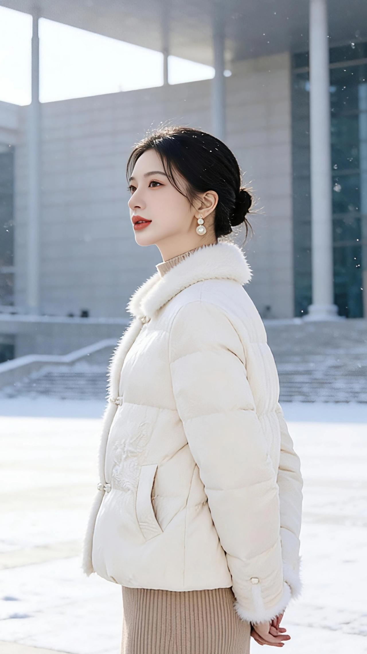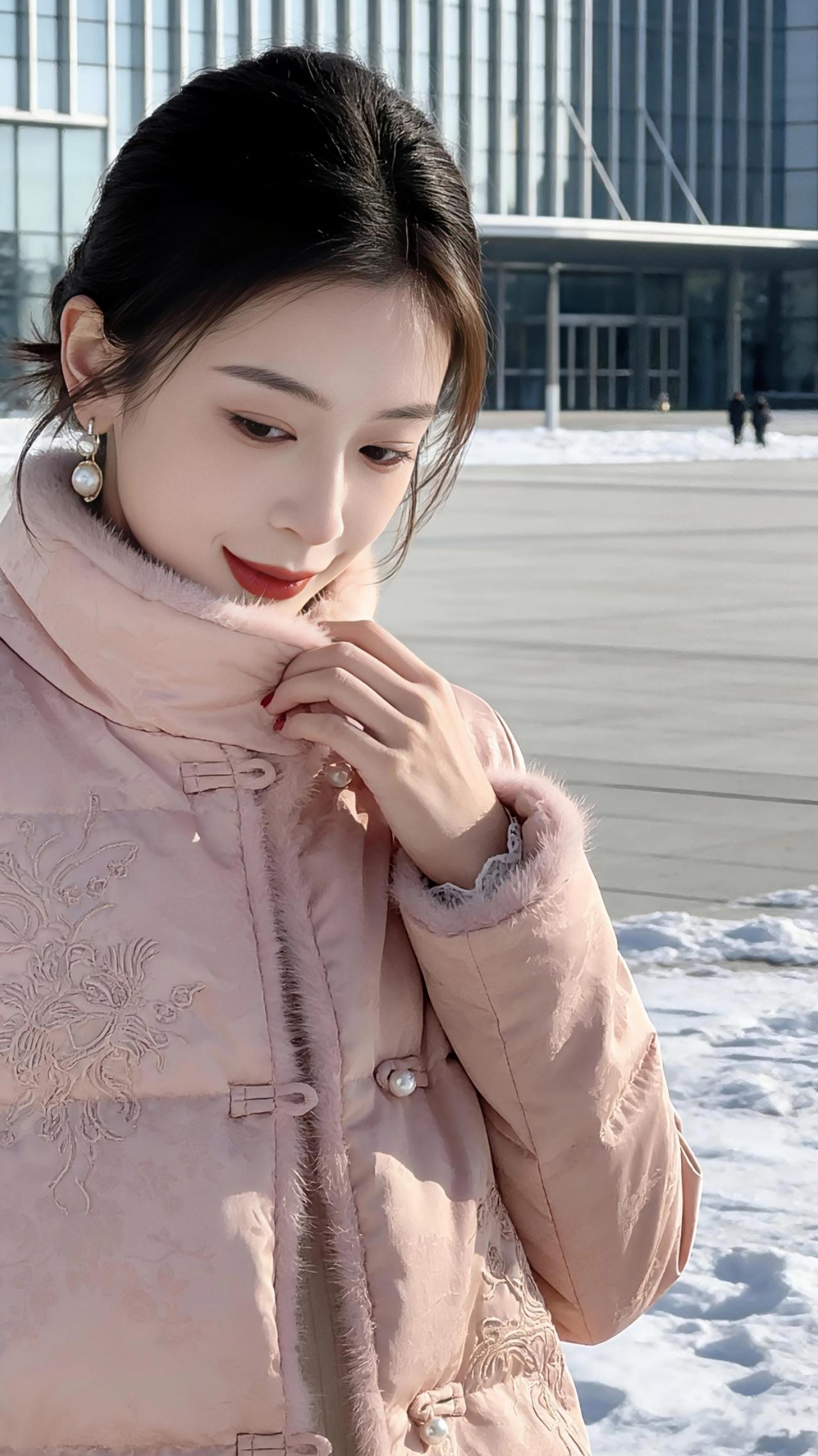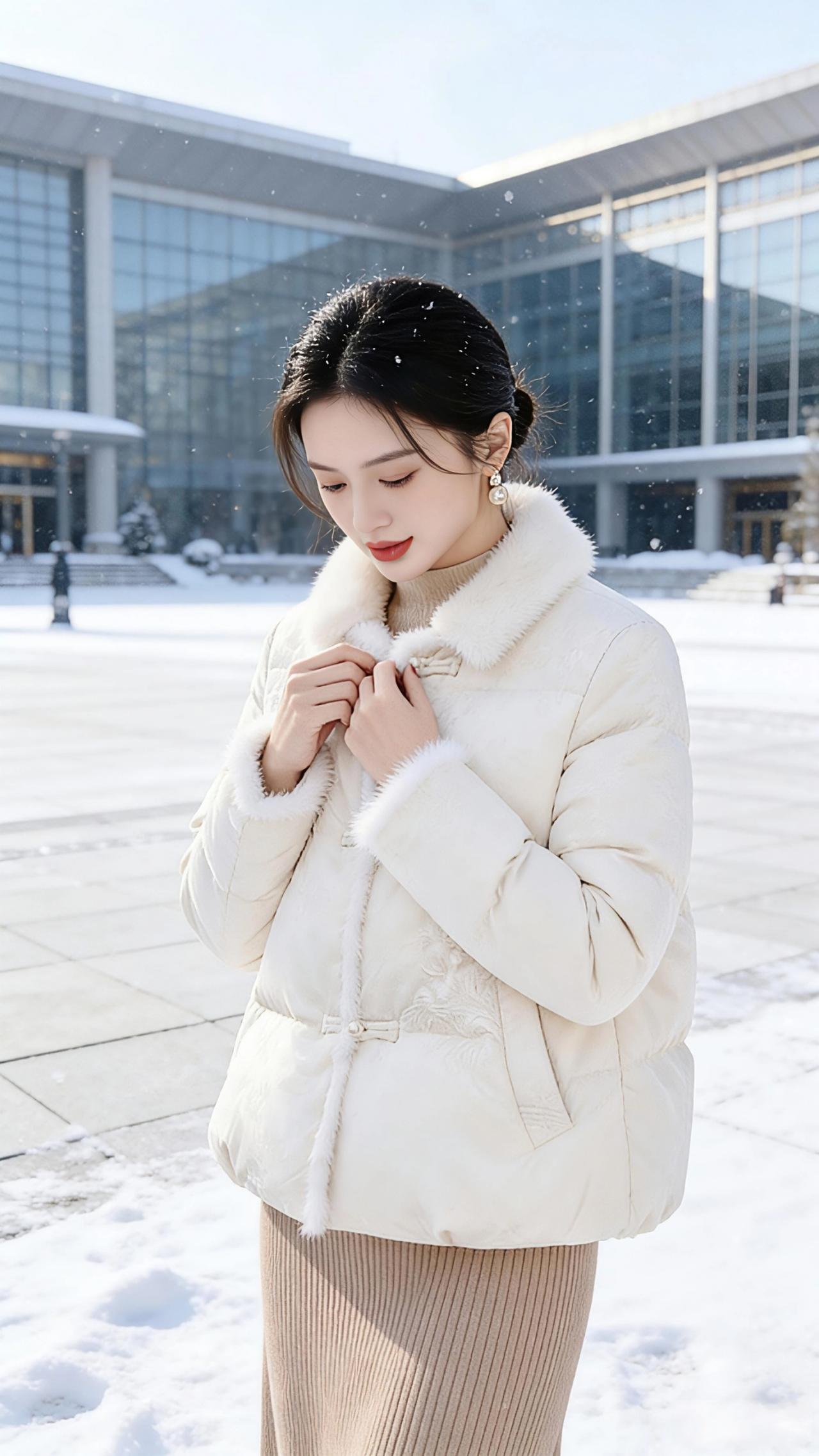 雪落时,她是广场上最轻的一抹颜色。 米白与柔粉的棉服裹着二十岁的轮廓,毛领蹭过颈间时,像接住了半捧碎雪。她抬臂展衣的弧度里,绣纹随光影洇开,是冬日光景里最软的褶皱。指尖碰着盘扣的刹那,雪粒子正擦过发梢——现代建筑的玻璃幕墙上,她的侧影和落雪一起,成了安静的注脚。 有时她垂眸拢紧领口,绒毛蹭着唇瓣,像把整季的温软都收进了衣摆;有时她望向东升的光,发鬓的碎发与雪絮缠在一起,成了这孤寂广场里,唯一在呼吸的诗意。 风过处,她的衣角晃了晃,把雪天的静,又揉得更软了些。 高级感穿搭 小个子穿搭 冬季穿搭 外套穿搭