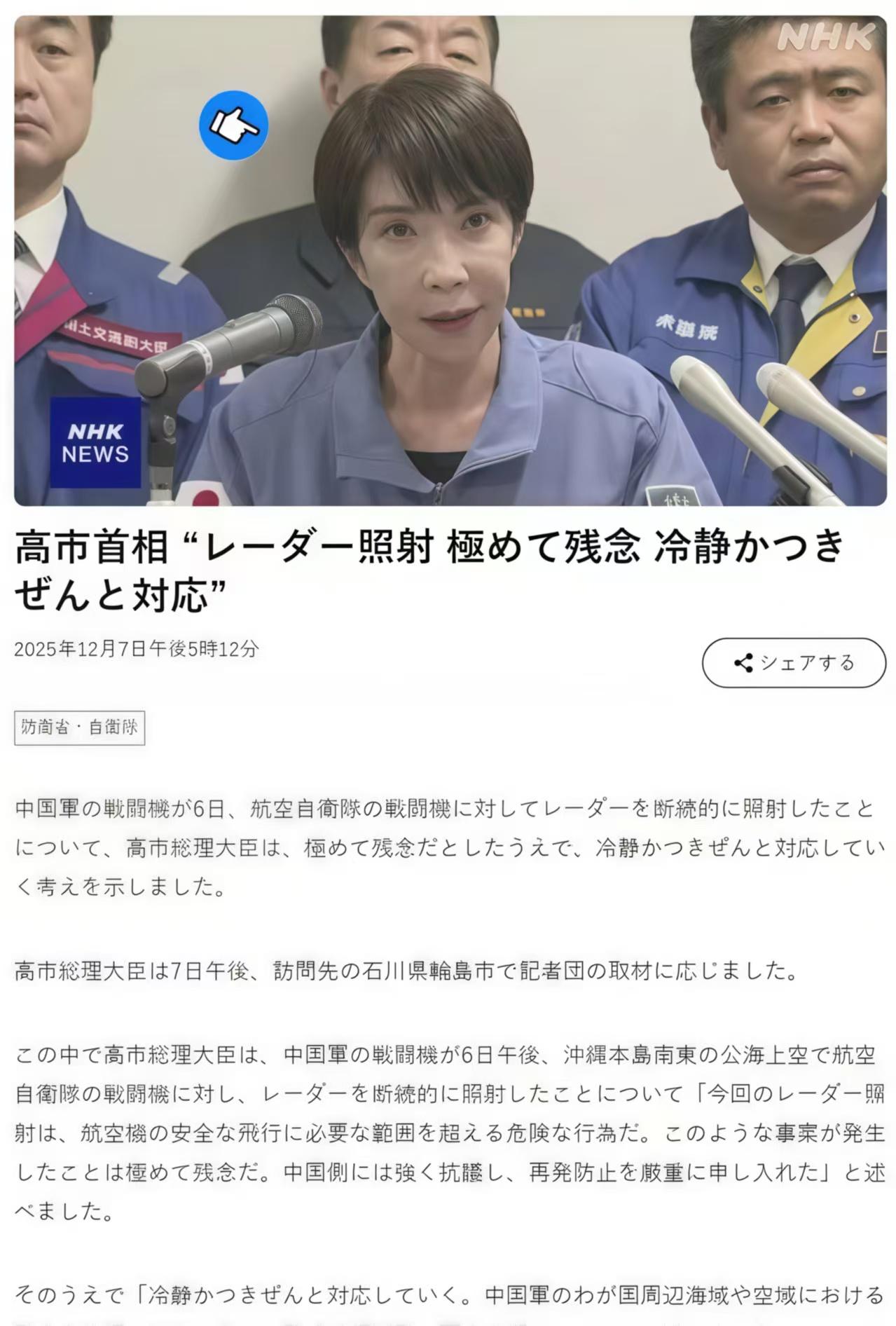事关中国,高市早苗正式表态 12月7日,日本首相高市早苗首度回应辽宁舰相关事件,直言解放军歼-15对日本F-15的雷达照射"超出安全范围",属危险行为,已向中国提出强烈抗议,要求杜绝类似情况。 但事实是,辽宁舰正在琉球附近公海开展正常军事训练,完全符合国际法规定。反倒是日本F-15频繁抵近训练区域侦察,这才是明目张胆的挑衅。 中方操作本就是对挑衅的正当回应,日方所谓"抗议"更像无理取闹。其一边宣称"保持冷静",一边炒作威胁、加强盟友合作,本质是借题发挥谋强军扩武。谁在挑衅、谁在维护合法权益,明眼人都看得清清楚楚! 中国辽宁舰公海训练符合国际法,日方军机抵近滋扰才是海空安全风险根源。中方雷达照射属正当防御与规范操作,日方颠倒黑白炒作抗议,本质是为扩军备武制造借口。 各国应尊重公海航行与训练自由,日方需停止挑衅与政治操弄,避免加剧地区紧张。 日方借所谓“雷达照射”炒作对立,暴露其借“中国威胁论”突破军事约束的野心。东亚和平需各方恪守国际法与双边共识,单方面挑衅与阵营对抗只会埋下冲突隐患。 唯有摒弃零和思维、通过对话管控分歧,才能守护地区稳定,避免历史悲剧重演。 日本这波操作也太双标了!辽宁舰在公海正常训练合规合法,明明是日本F-15主动抵近侦察挑衅,中方正当回应反倒被倒打一耙。 嘴上说“保持冷静”,实则借机炒作谋强军,纯属无理取闹。真要想维护地区稳定,就别跟着盟友瞎折腾,停止挑衅才是正经事! 各位读者怎么看呢?欢迎评论区留言讨论~