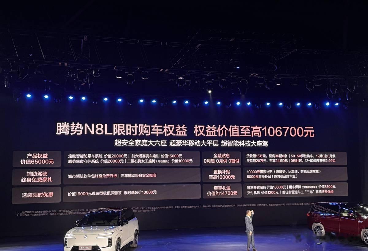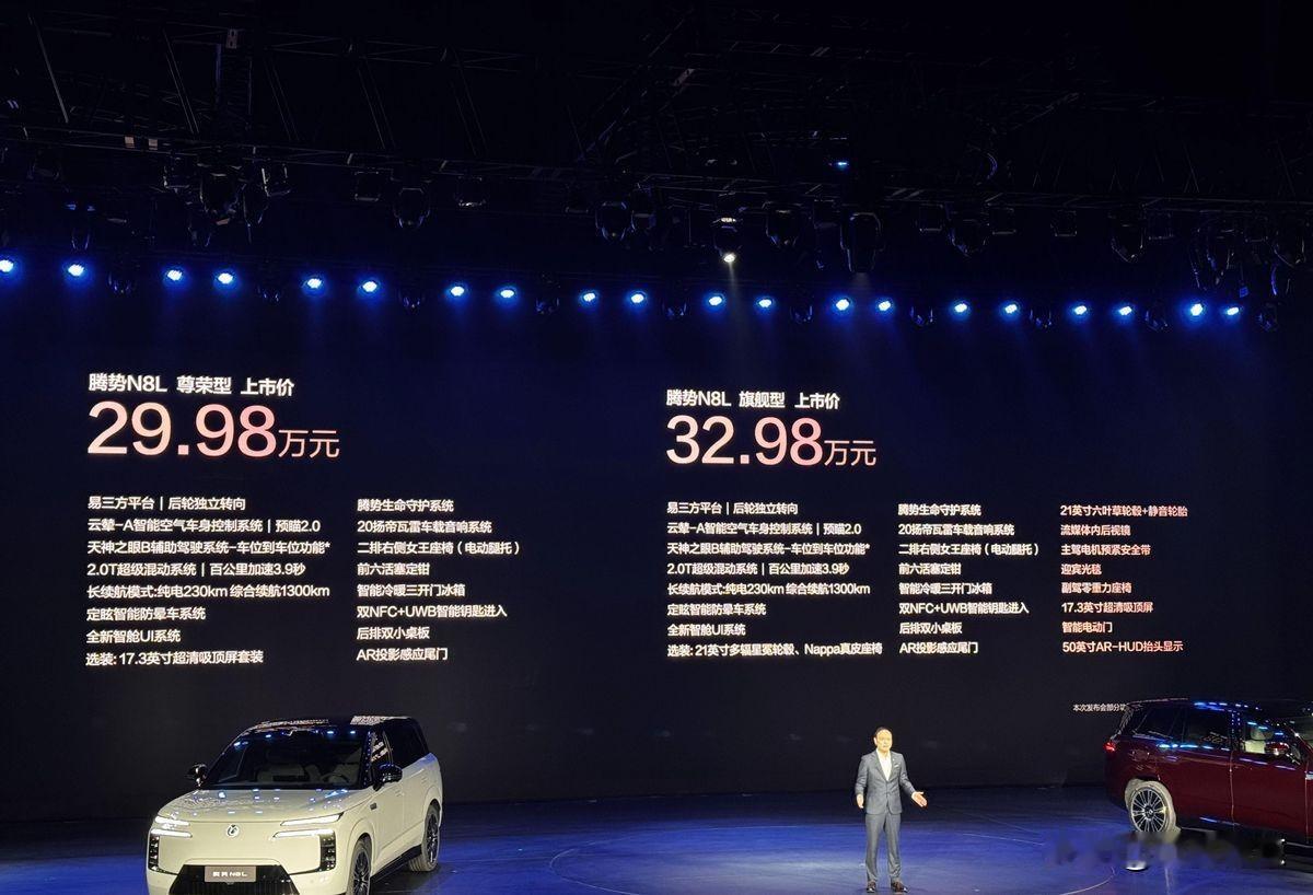 最近腾势N8L正式上市,尊荣型29.98万、旗舰型32.98万的价格,相比31.98万和34.98万的预售价下调2万元。 这价格一出来,我直接愣住。 不是说好高端SUV都得往四五十万冲吗?腾势倒好,把一台带三电机、激光雷达、空气悬架、帝瓦雷音响的大六座插混SUV,直接干到30万内起步。 这不是掀桌子,这是把整个桌子都砸了! 你看看现在市场上那些热门选手,理想L8、问界M7,哪个不是靠着“奶爸车”人设火起来的? 空间大、配置高、智能驾驶能用,但动不动就三四十万落地。 腾势N8L这一出手,等于拎着刀站门口:你们卖的那些功能,我全都有,我还更猛! 零百加速3.9秒什么概念?超跑级性能!一台五米二长的SUV,一脚电门下去推背感直接顶到后脑勺,比你家孩子哭闹还来劲。 关键是它不光快,还能灵活转弯,4.58米最小转弯半径,比很多紧凑型轿车还小。后轮独立转向加持,想蟹行就蟹行,想原地掉头就原地画圈,大车笨重?不存在的。 别以为它是性能怪兽就牺牲舒适性。云辇-A空气悬架+智能预瞄系统,过坑就像没看见一样,底盘稳得一批。 双腔空簧+连续可调阻尼,城市铺装路开是享受,乡间土路开也不颠屁股。这玩意儿简直就是给中国路况量身定做的“移动大平层”。 再说空间,5.2米车长,3075mm轴距,第三排不是摆设。100mm前后滑移,角度还能调,成年人坐进去腿不蜷、头不顶,真能当正经座位用。 4+N种座椅模式,露营变床、会客对坐、亲子互动随便切换,一家六口出门再也不用抢前排。 智能化这块更是杀疯了。“天神之眼B”带激光雷达,高速领航、城市NOA全都能上,AEB干到147km/h才触发,路上突然窜出个电动车,系统自己一脚刹停,反应比你还快。百公里刹停距离才35.4米,六活塞卡钳配上来,安全感直接拉满。 内饰也一点不含糊。 31.8㎡软包面积,真皮、反绒皮、透光真木往上堆,水晶拨杆手感一流。五屏联动——AR-HUD、仪表、中控、副驾屏、后排吸顶屏,帝瓦雷20扬声器+杜比全景声,坐在车里听歌跟在现场差不多。冷暖冰箱、双50W风冷快充、手机UWB无感解锁,细节堆到极致。 还有腾势这次不玩虚的。不像某些品牌搞“限时优惠”,搞得你连夜下单生怕错过。人家直接把价格打到底,29.98万起,明码标价,童叟无欺。还承诺年底前订车但明年才交付的用户,补贴最高1.5万购置税差额,这叫一个厚道! 你说它是不是N9的缩水版? 确实尺寸小点,定位低点,可核心技术全继承了。易三方平台、云辇、三电机、激光雷达,一个没少。相当于花三十万买到了原本四十多万才有的体验,这波技术下放太狠了。 现在压力全给到理想和问界那边了。你要加钱才能选装的配置,人家出厂就标配;你要额外付费的智驾功能,人家直接给你打通关。再不跟进,怕是要被挤出市场。 腾势这是真想通了,不再靠D9单腿走路,开始全面进攻SUV战场。N9刚发布完,N8L立马跟上,产品节奏打得飞快。今年前九个月销量已经破十一万,这台N8L要是月销破万,一点都不意外。 国产高端车,终于不再是靠讲故事、吹情怀活着了。拼技术、拼实力、拼诚意的时代,真的来了。 亲爱各位读者你们怎么看?欢迎在评论区留言讨论!