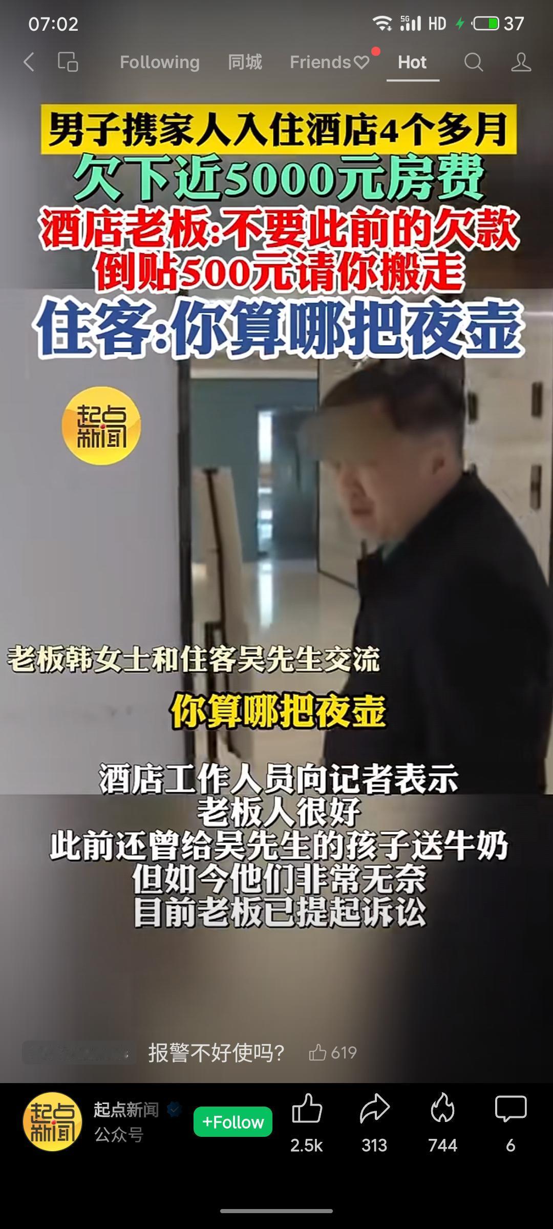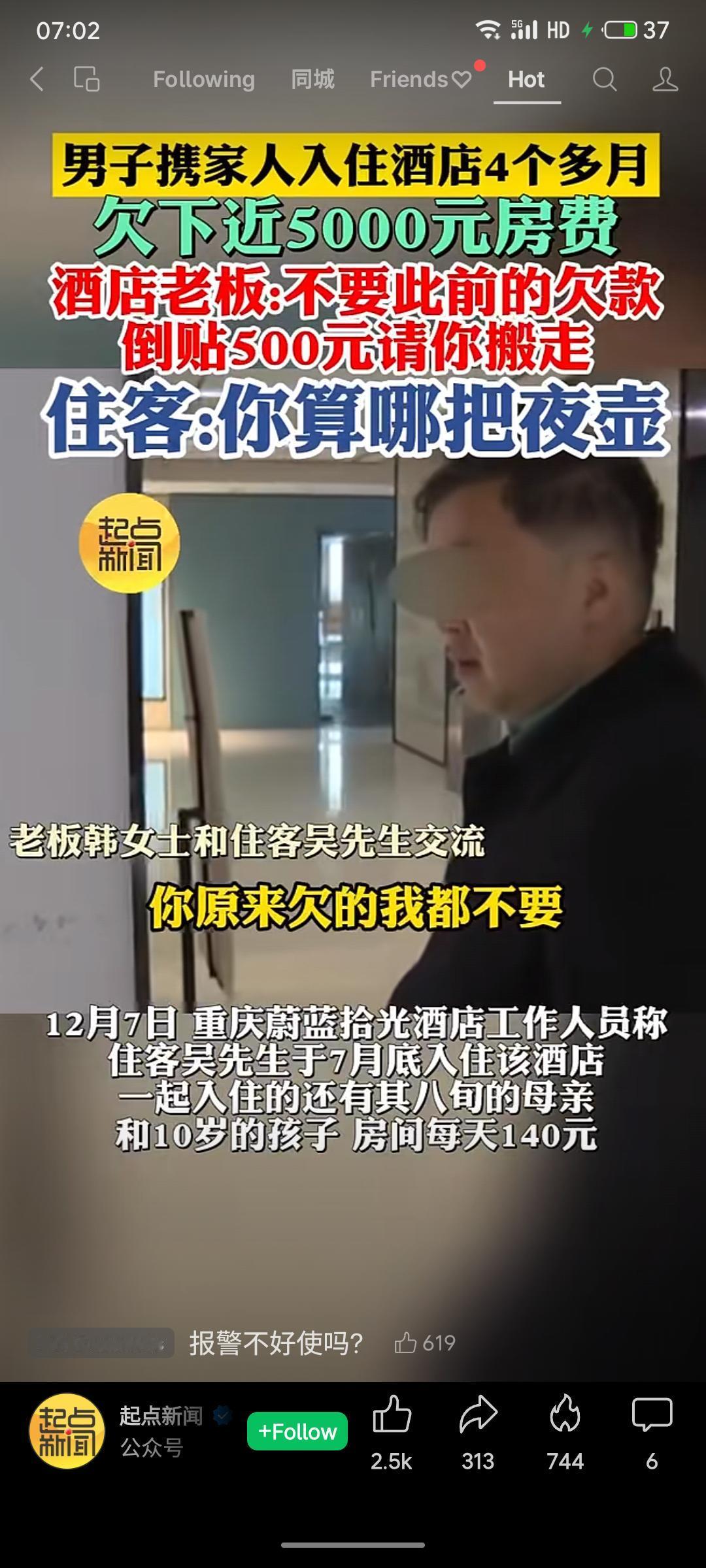 重庆一男子携家人入住酒店四个多月,欠下近5000元房费。酒店老板韩女士无奈提出免除全部欠款,并倒贴500元请其搬离,却遭该男子以“你算哪把夜壶”等粗话拒绝。男子自称有经济纠纷需通过法院解决。酒店方此前曾善意关照其家人,现已被迫提起诉讼。事件引发网友对酒店经营者困境的关注。