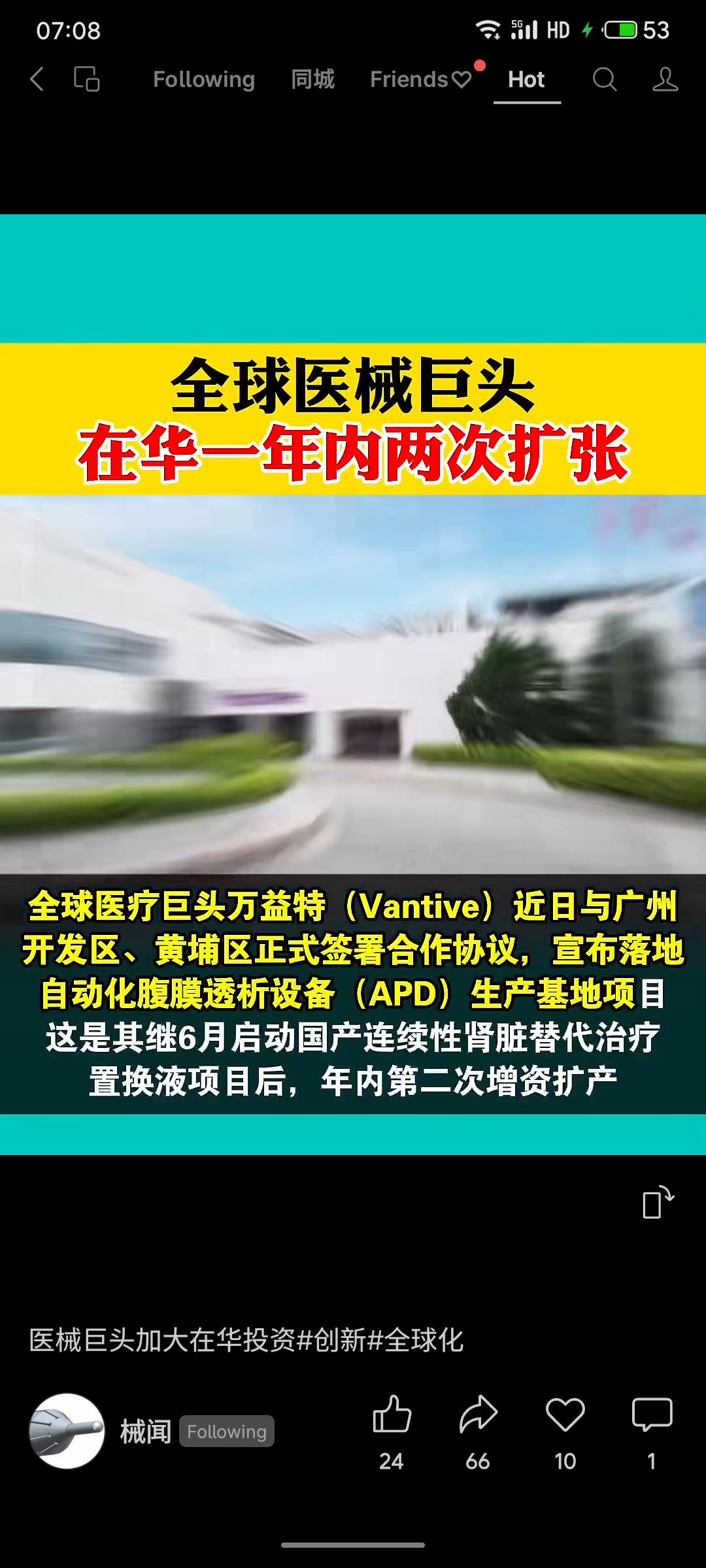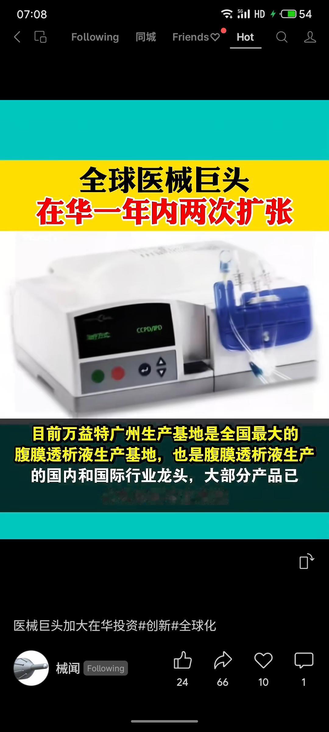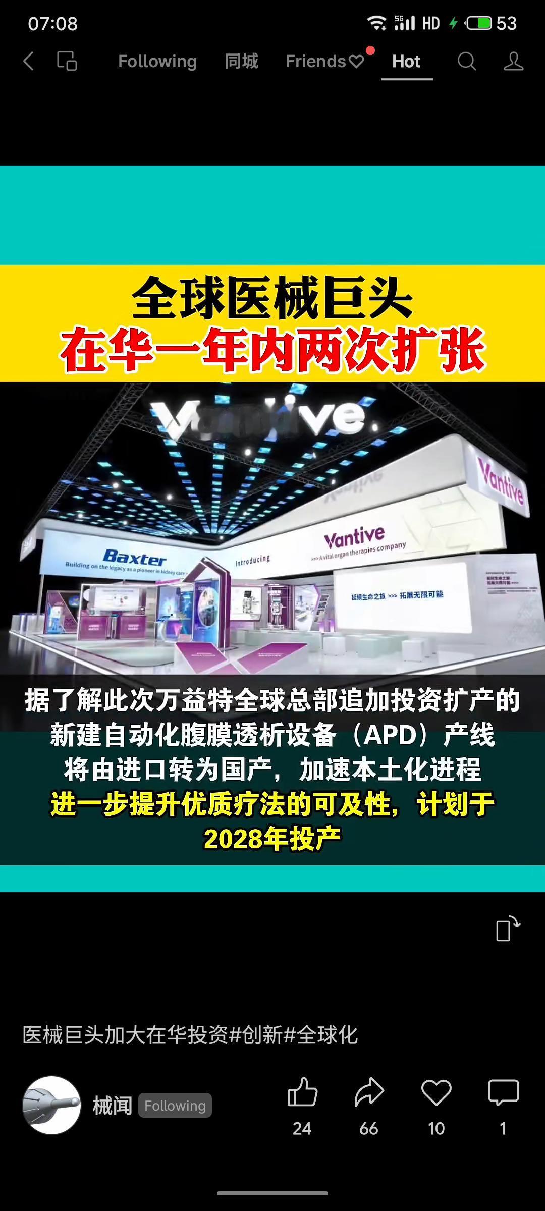 全球医疗器械巨头万益特(Vantive)一年内第二次在华扩张,于广州签约落地自动化腹膜透析设备(APD)生产基地。该项目将APD产线由进口转为国产,加速本土化,计划2028年投产。其广州基地已是全国最大的腹膜透析液生产基地及行业龙头。
