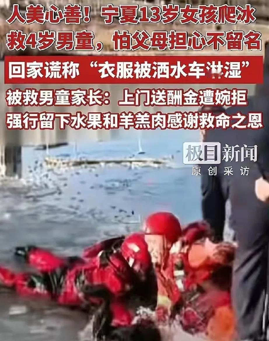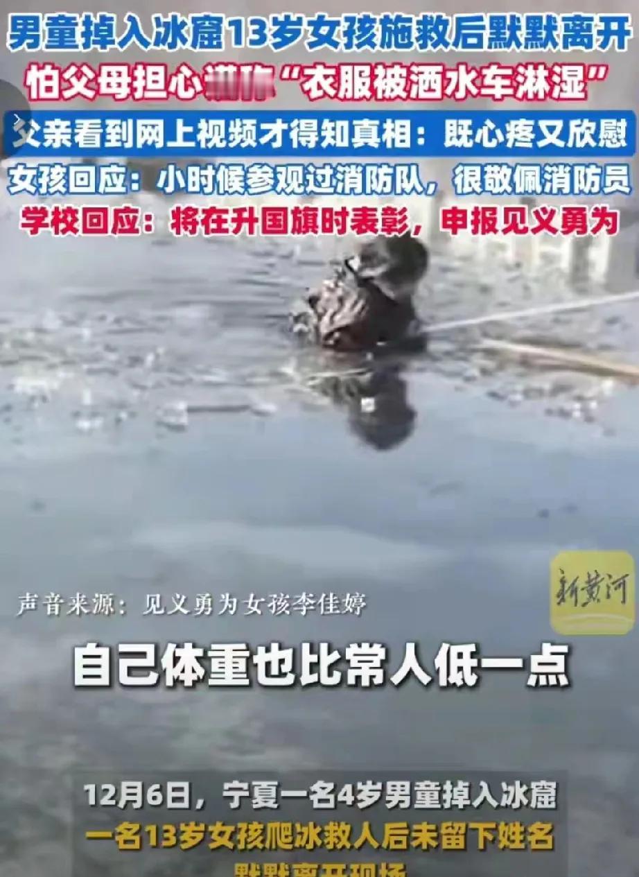 13岁女孩李佳婷,上演冬日最暖救援!12月6日傍晚,宁夏同心县,4岁男孩不慎掉入冰窟。 危急时刻,李佳婷挺身而出,趴在冰面,手持塑料管,毅然跳入冰冷湖水,奋力托起男孩。消防员及时赶到,将两人救上岸,她却悄悄离开。直到姑姑刷到视频,父母才知情。 男孩家属登门感谢,被李爸爸婉拒,只留下水果和羔羊。学校将为她申报见义勇为奖,12月8日全校升旗时表彰。李佳婷,年龄虽小,勇气可嘉,用小小身躯,撑起生命希望,温暖整个寒冬!