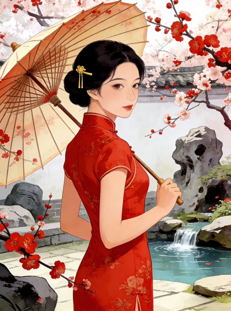 旗袍美人与春:这才是中式美学的顶配浪漫 是谁被这抹红惊艳到失语?💃 一袭绣花纹红旗袍裹着东方骨相的温婉,鬓边金簪坠着细碎流光,油纸伞半遮春色——身后是江南园林的叠石流泉,梅枝斜斜挑着胭脂色的花,风一吹就落满肩头。 中式美从不是单一的惊艳,是旗袍裁出的曲线里藏着烟火气,是园林留白处浸着的诗意,是“美人在骨不在皮”的含蓄与生动。 这大概就是刻在DNA里的东方审美吧,每一帧都想存成壁纸! 旗袍 江南风旗袍照东方美