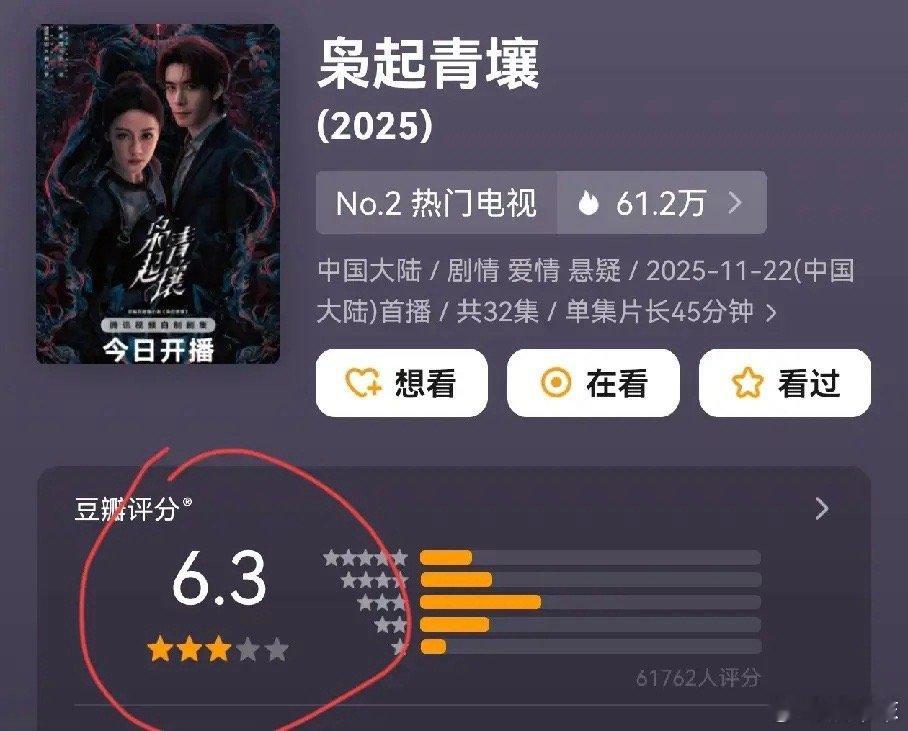 《枭起青壤》评分6.3,今年迪丽热巴播出的两部剧,都扑了。一部电视剧扑不完全是演员的问题,这两部的评分全都不过7.0。编剧总以为观众喜欢高颜值,喜欢性张力,喜欢拉扯。就把颜值属性点满,性张力点满,剧情呢?就想问导演编剧,剧情去哪里了?