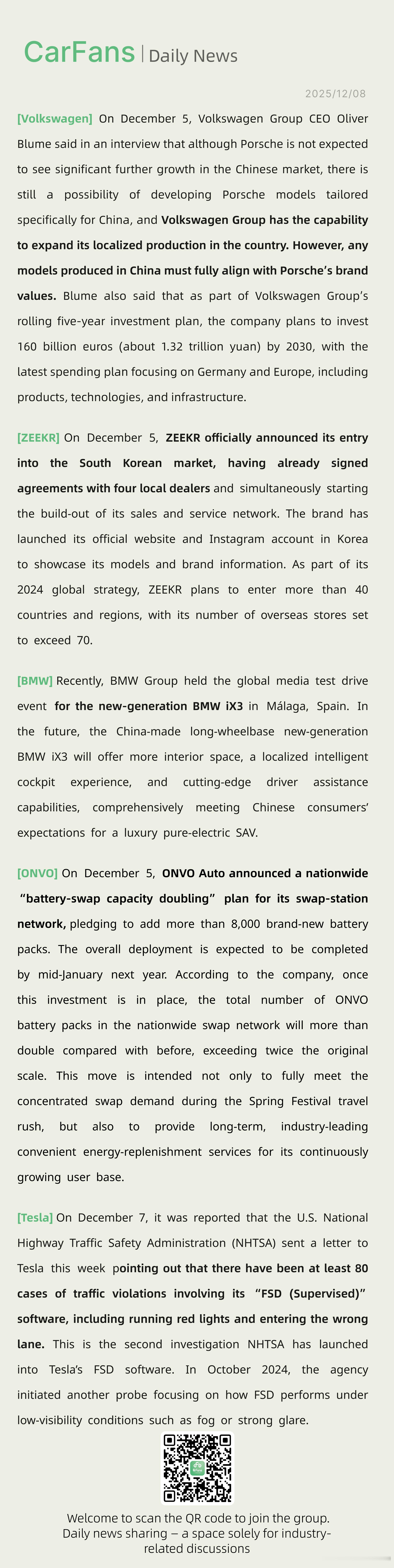 奥博穆表示保时捷仍存在为中国量身开发保时捷车型的可能性、乐道汽车发布了全国换电站电池翻倍计划大众汽车集团首席执行官奥博穆在接受采访时表示,即便预计保时捷在中国市场不会更加壮大,但仍存在为中国量身开发保时捷车型的可能性,大众汽车集团也具备扩大在中国的本地化生产的能力。不过,在中国生产的车型,必须完全符合保时捷的品牌价值。奥博穆还称,作为大众汽车集团滚动五年投资计划的一部分,公司计划在2030年前投资1600亿欧元(约合人民币1.32万亿元),最新支出计划的重点是德国和欧洲,包括产品、技术和基础设施。赶快量身开发吧,再晚竞争就更加激烈了新能源汽车