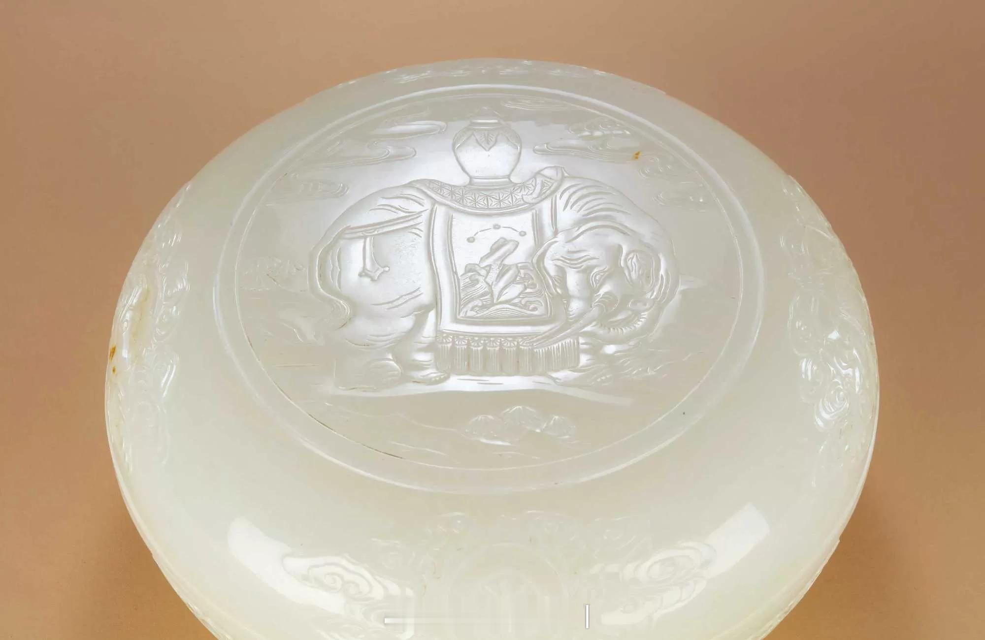 清乾隆 白玉太平有象八宝纹盖盒此盖盒以上等和田白玉为材,取料二分之一处一剖为二,分做顶盖及盒身,二者口沿处以子母口紧密扣合,严丝合缝。盖面做圆形开光,其内去地隐起之法雕琢太平有象图,象背覆宝瓶,寓意太平有象。外壁浅浮雕八宝,去地平整,碾斫精到。整器雕工一丝不苟,力求精美考究,瑞象造型描绘细腻,丰满敦厚,形体颇具张力,凹凸圆润,彰显出肌肉之力度。此盖盒虽为玉雕,却因材施艺,细腻与洗练并存,相映生辉,充分显示乾隆时期艺匠斫刻技艺之高超。本品尺寸与装饰图案并不常见。对照一类例,五福捧寿八吉祥盖盒,为 Stanley Charles Nott 收藏,后售于纽约佳士得2007年3月22日,编号96。尺寸:直径14.2cm来源:保利2025秋拍《观止—瓶花落砚,醉诗梦仙》
