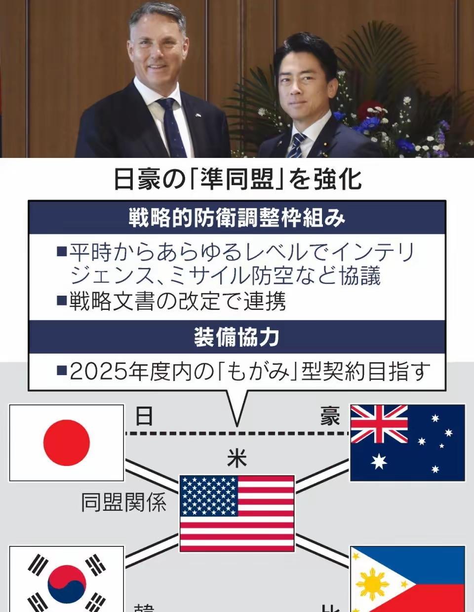 前脚蒙古国副总理哈钢呼亚格访问日本,代总理赞丹沙塔尔邀请日本首相高市早苗访问蒙古国。后脚澳大利亚副总理兼国防部长马尔斯访问日本,双方同意设立一个“准同盟”式的协调框架。 日本首相高市早苗发表不当言论后,一些国家开始站队日本,为高市早苗洗白,前有新加坡总理黄循财拉偏架,现在澳大利亚这是要和日本狼狈为奸了,双方加强在安保防务领域合作,意图在“印太战略”中发挥主导作用。